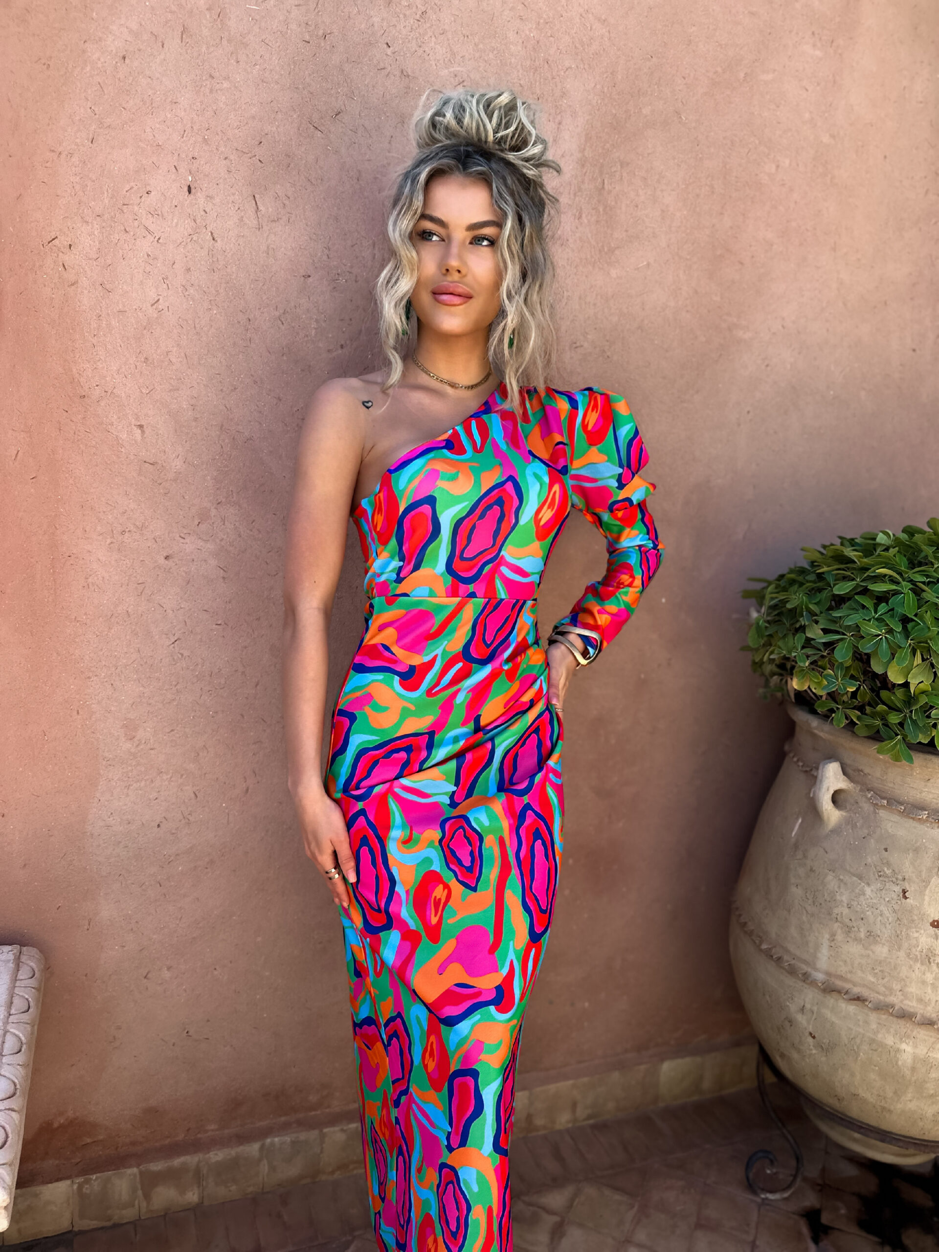 Barevné dlouhé elegantní šaty KAROT na jedno rameno Velikost: ONESIZE