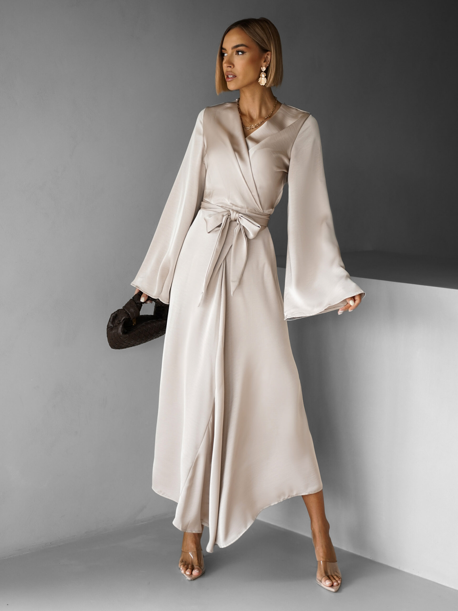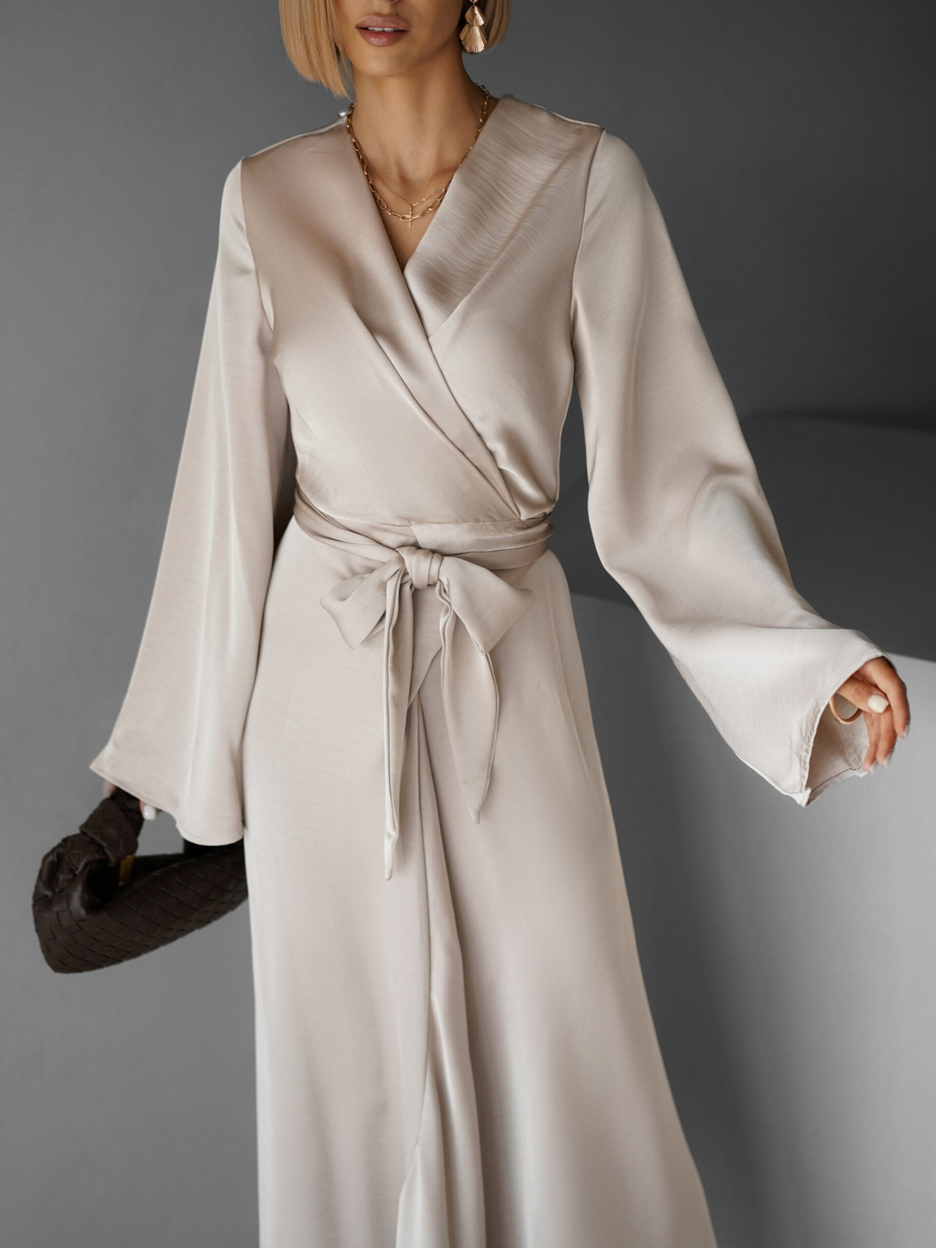 Béžové saténové dlouhé šaty ELITE s vázáním Velikost: S