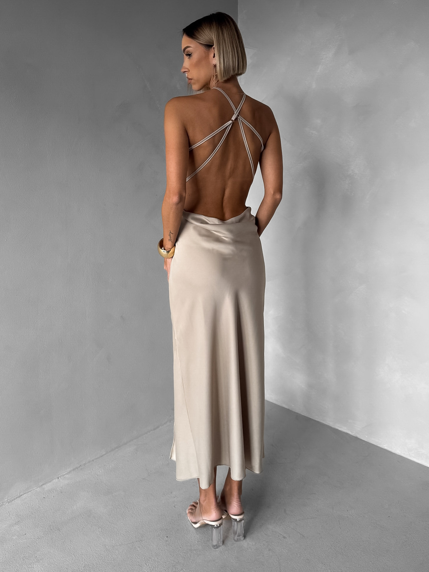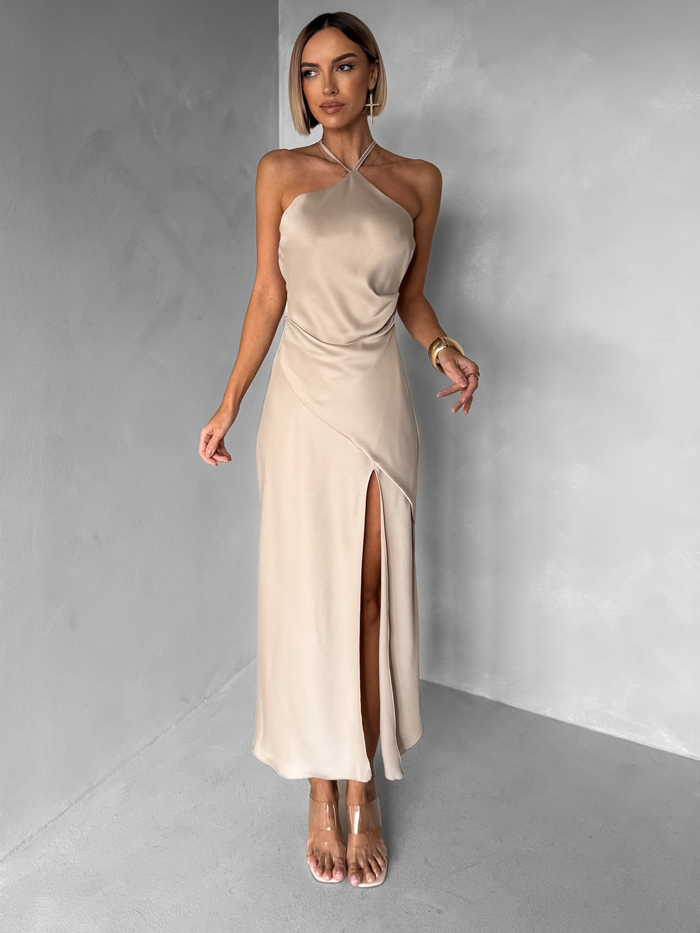 Béžové saténové společenské šaty ELIRON s rozparkem Velikost: ONESIZE