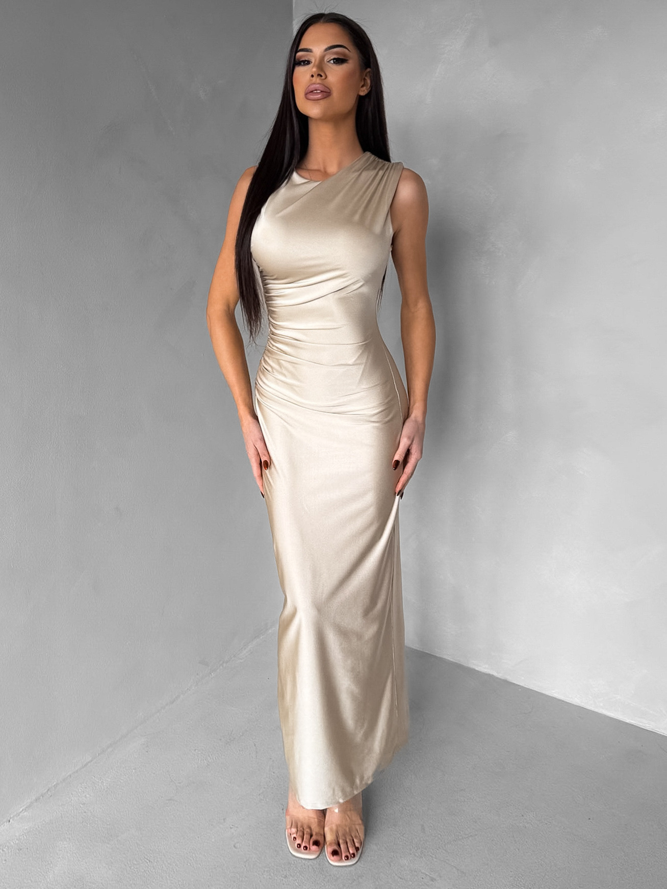 Béžové společenské dlouhé šaty DRAVELY s řasením Velikost: ONESIZE