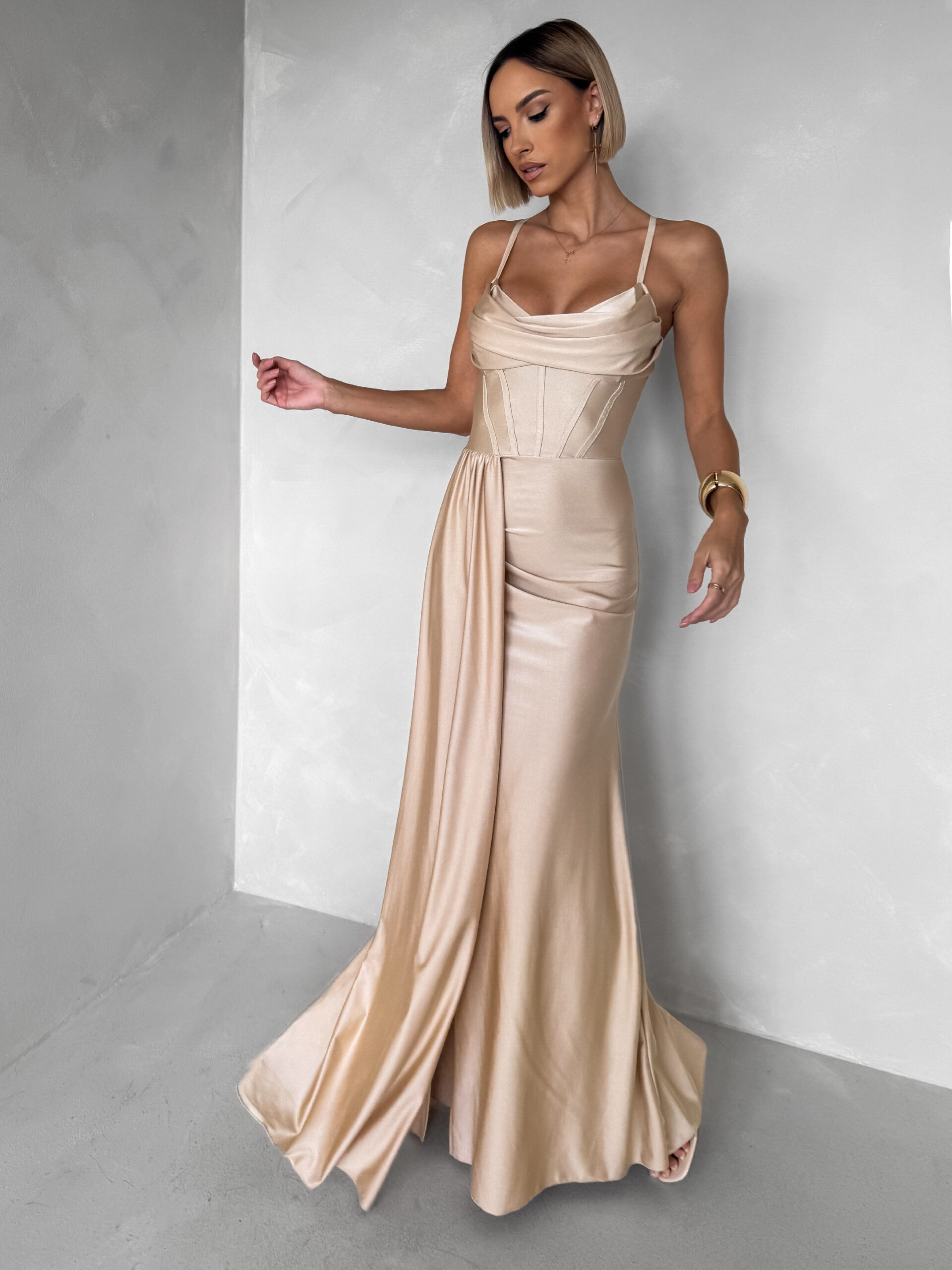 Béžové zlaté společenské dlouhé šaty SATIN s rozparkem Velikost: ONESIZE