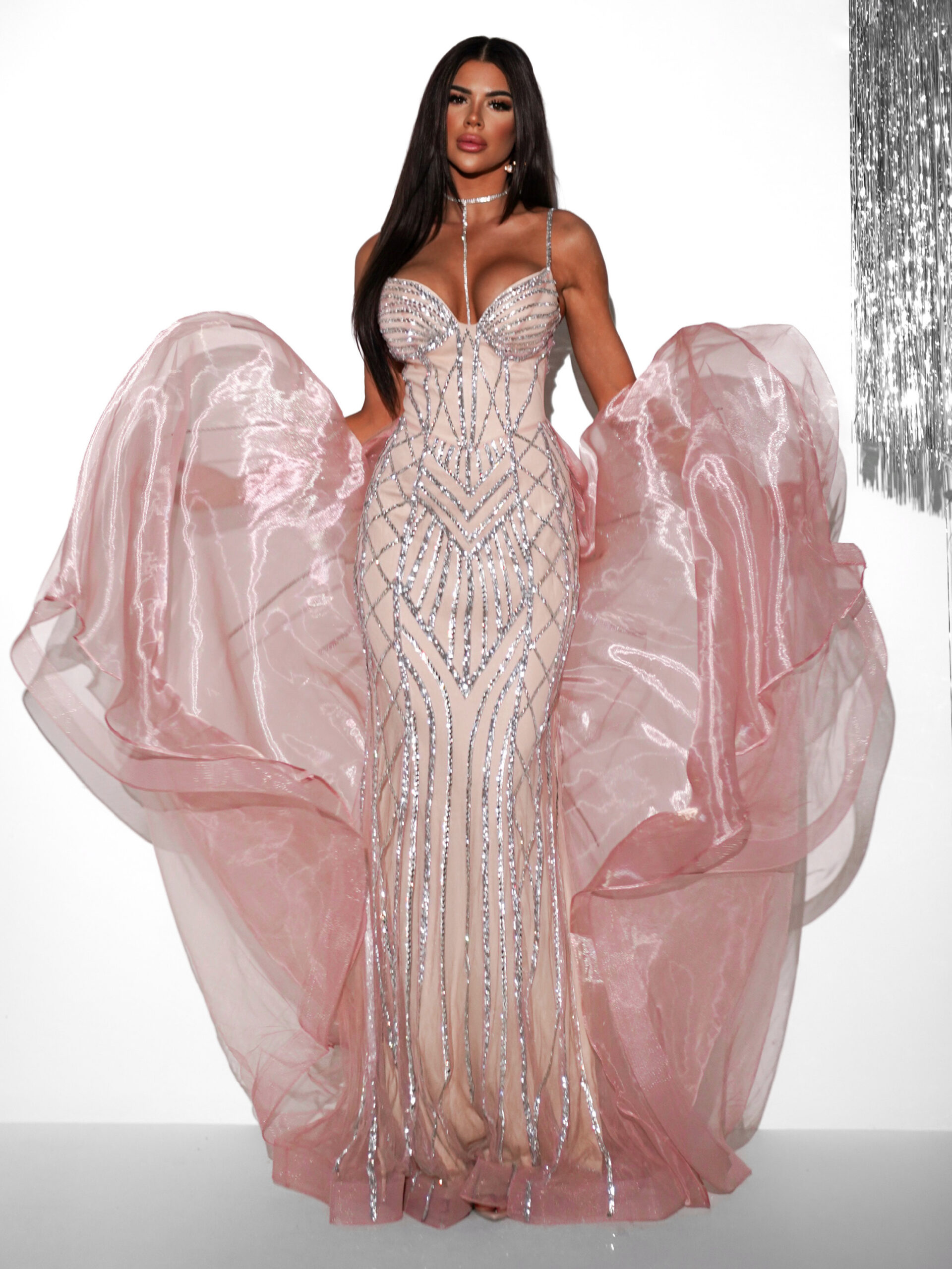 Béžovorůžové luxusní plesové šaty ROBES s kamínky Velikost: L