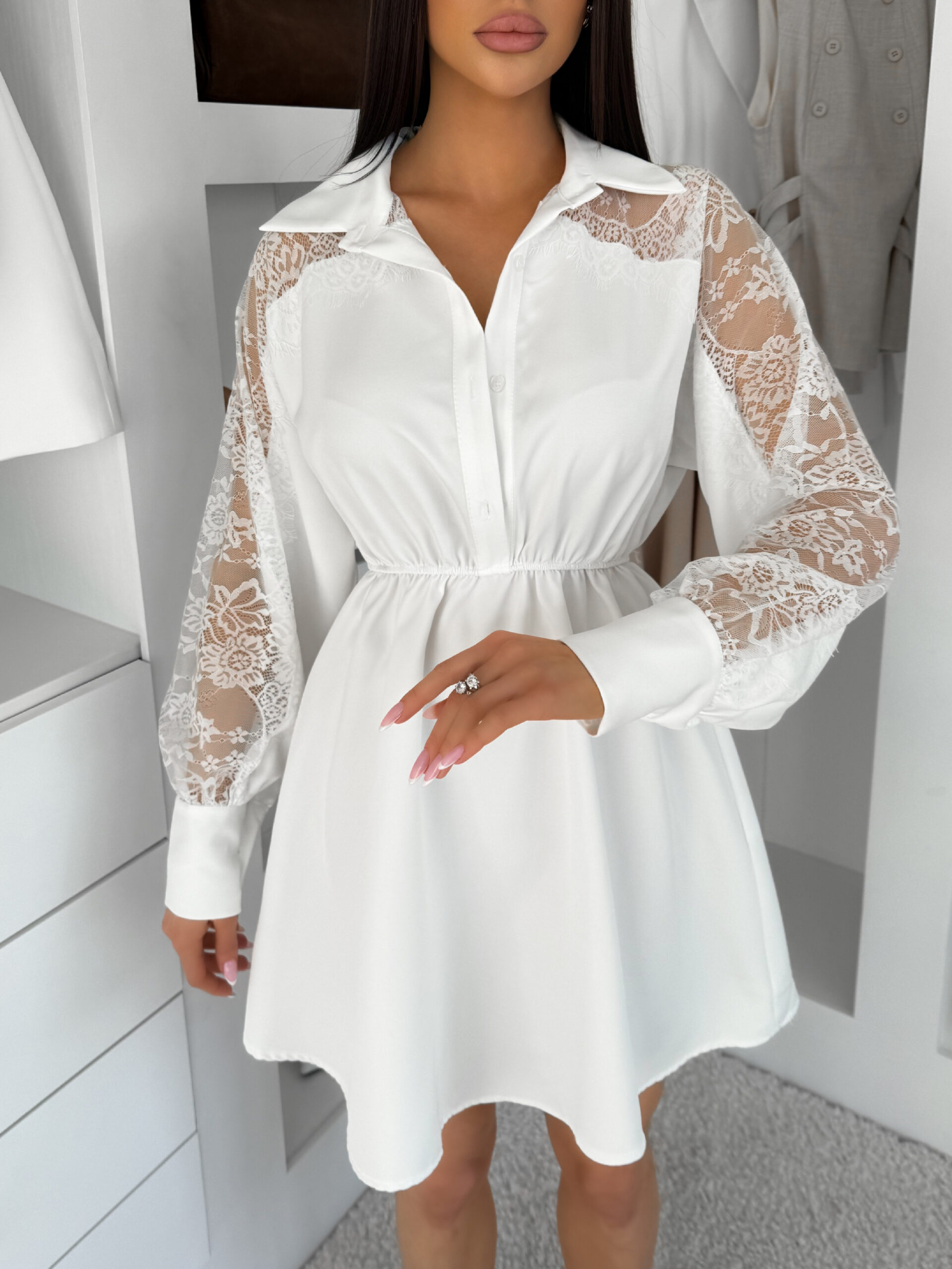 Bílé košilové šaty VYLORIUM s krajkovými rukávy Velikost: ONESIZE