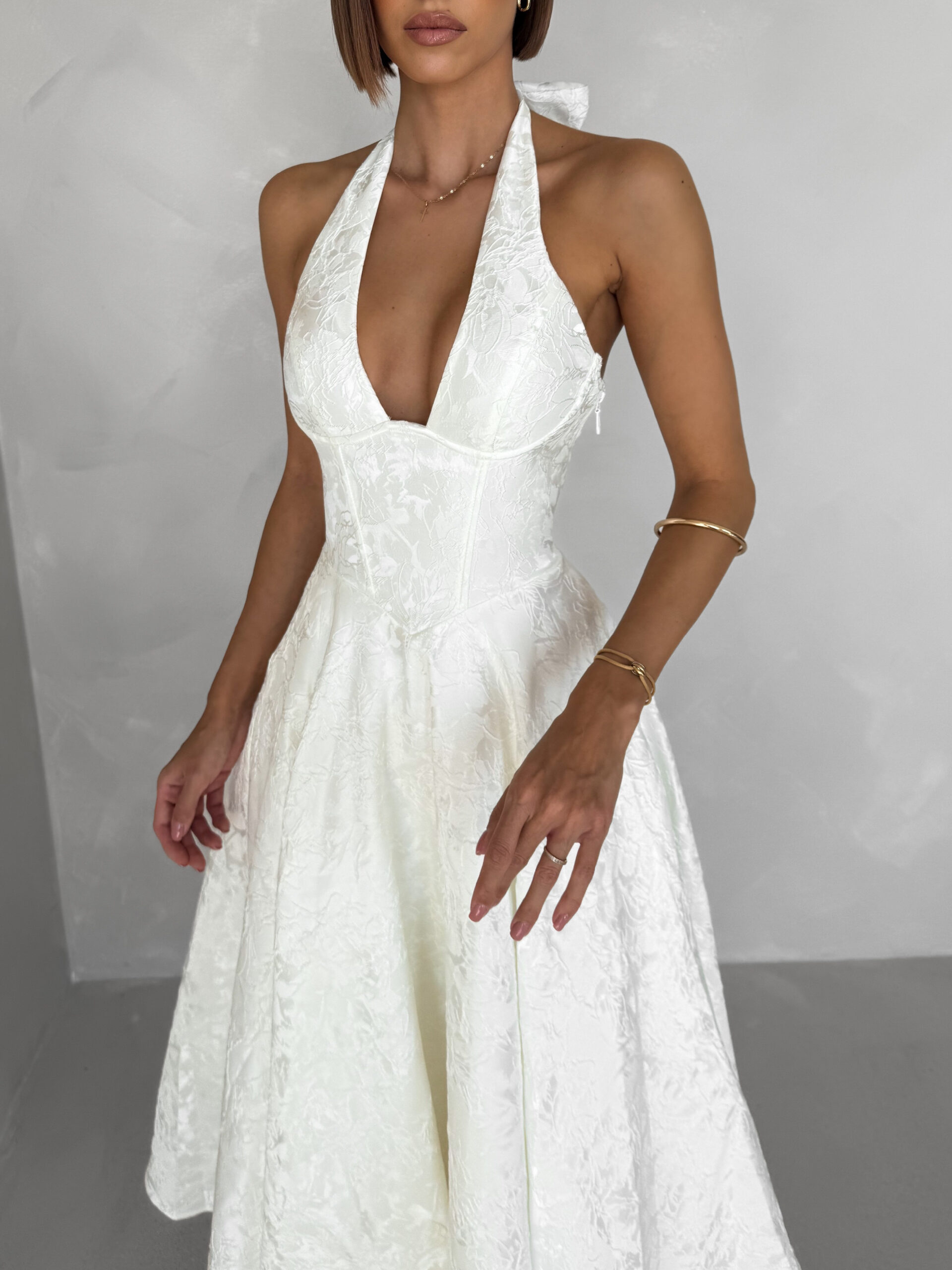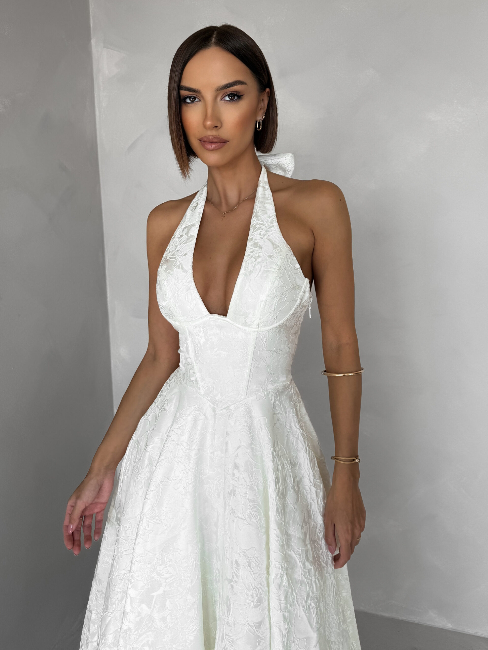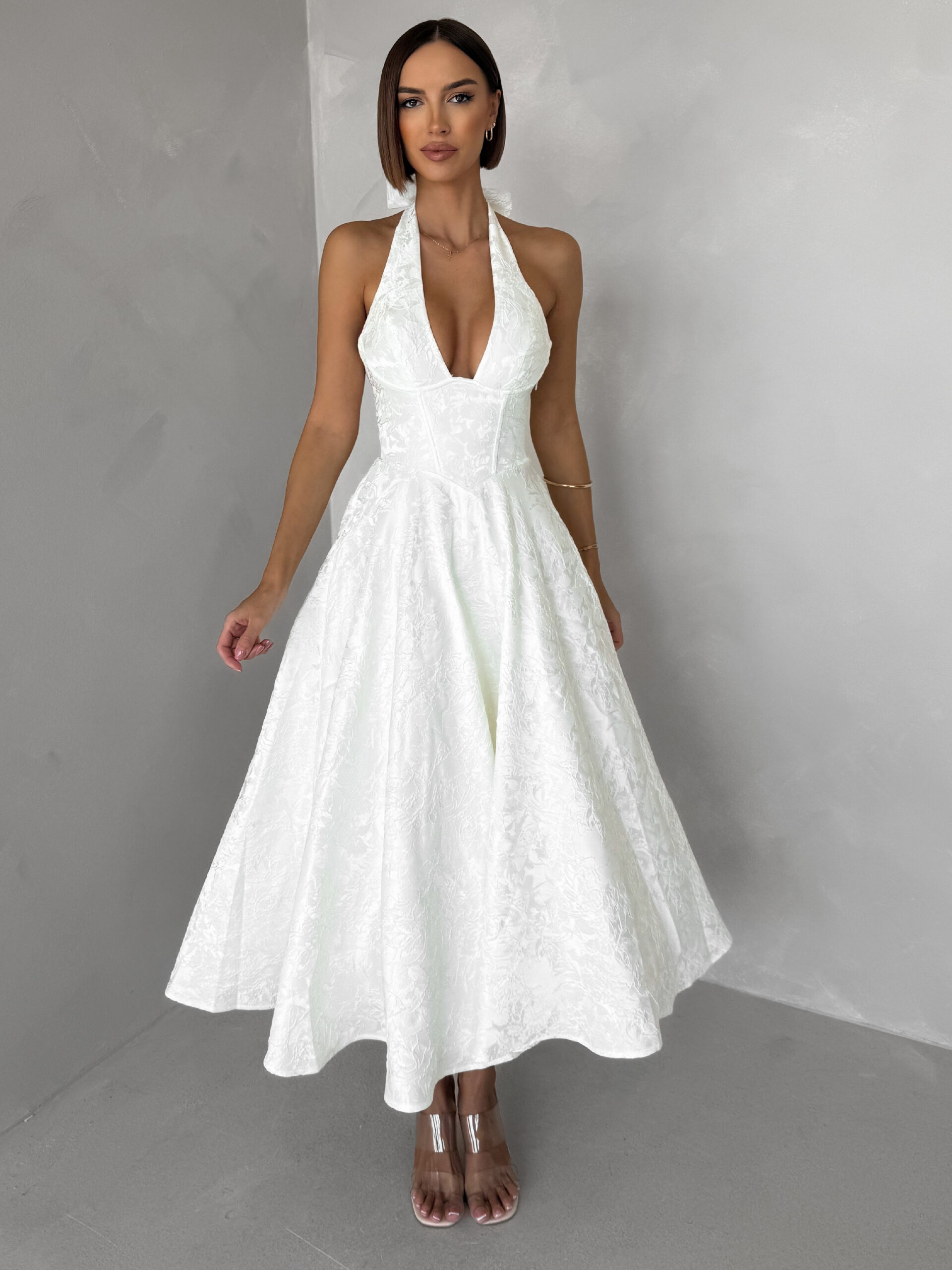 Bílé společenské vypasované áčkové midi šaty NYXORA Velikost: M