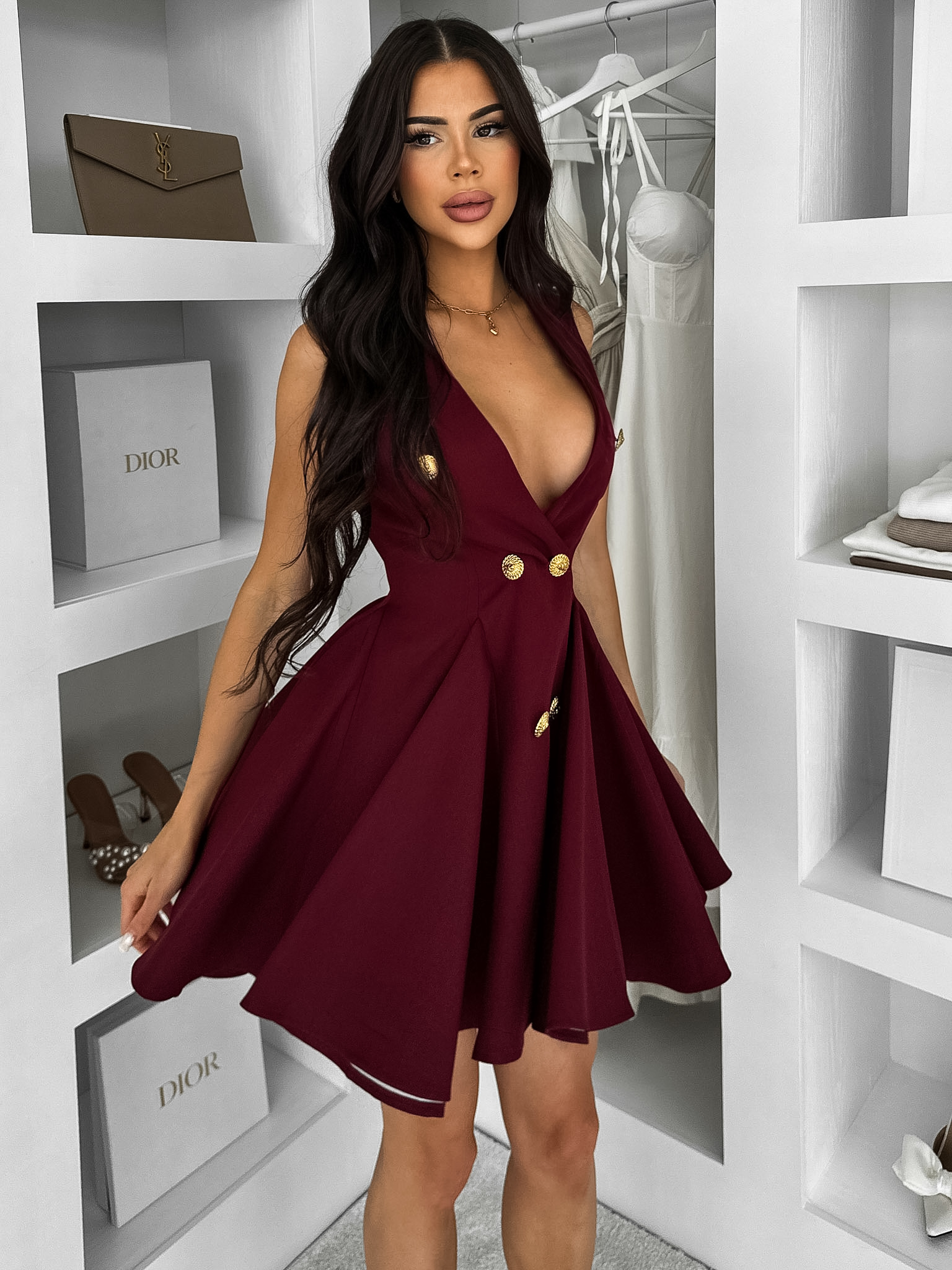 Bordó áčkové krátké šaty ENYALA s knoflíky Velikost: L