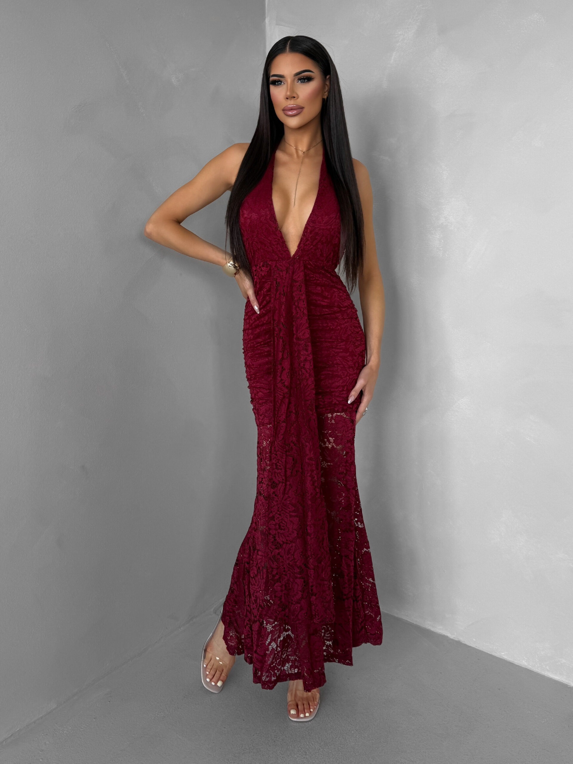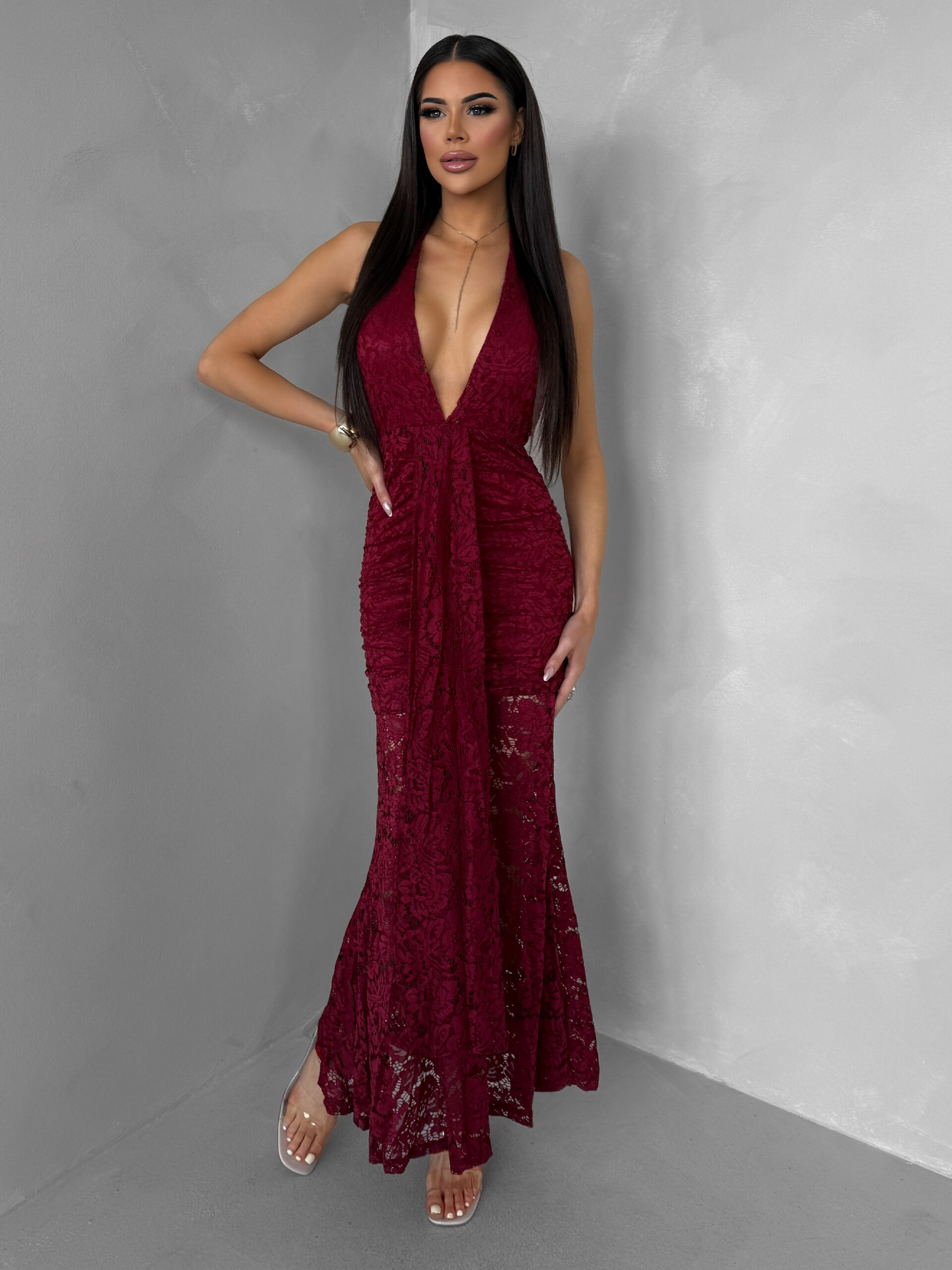 Bordó společenské krajkové dlouhé šaty ZERULON Velikost: ONESIZE