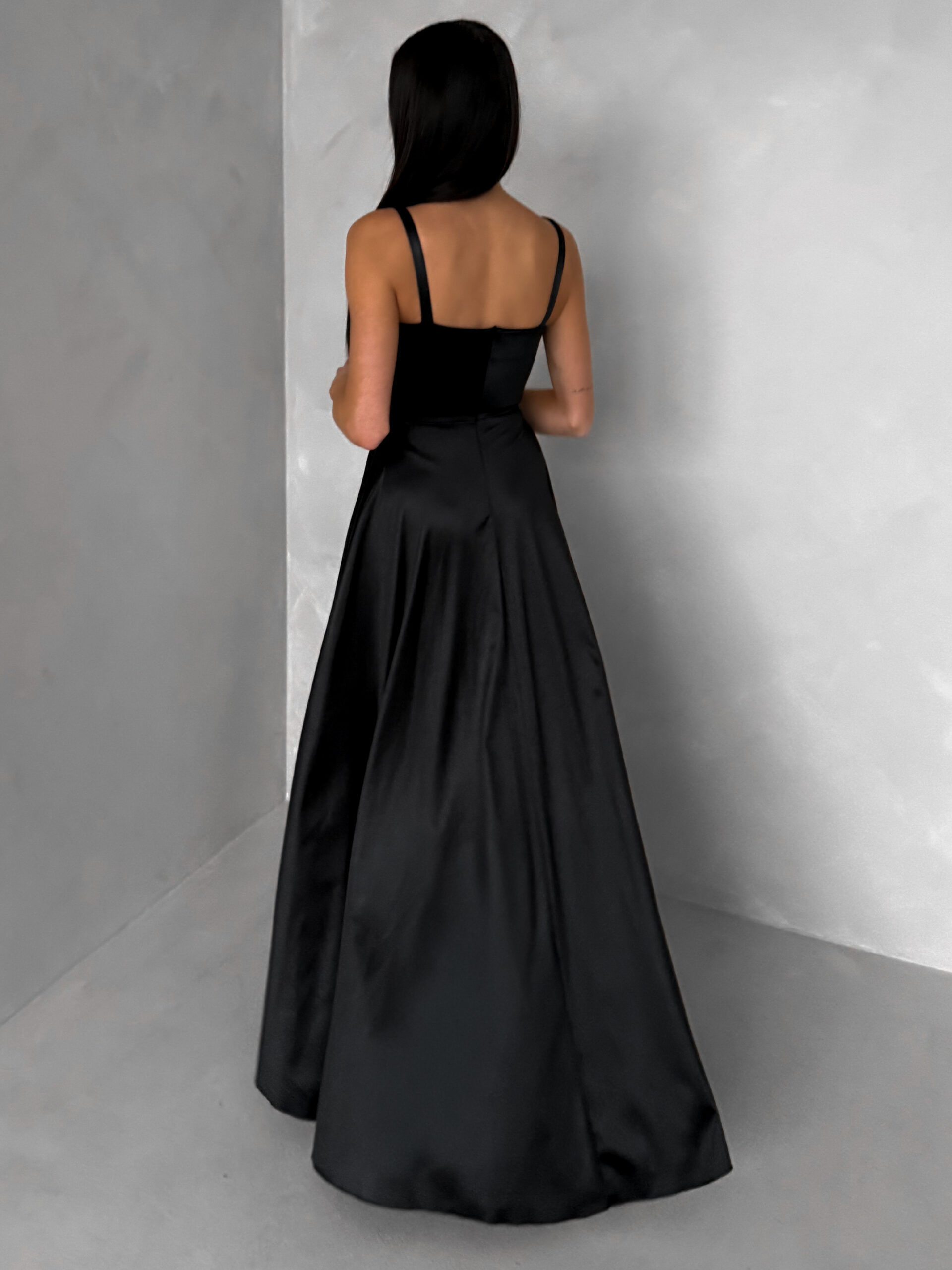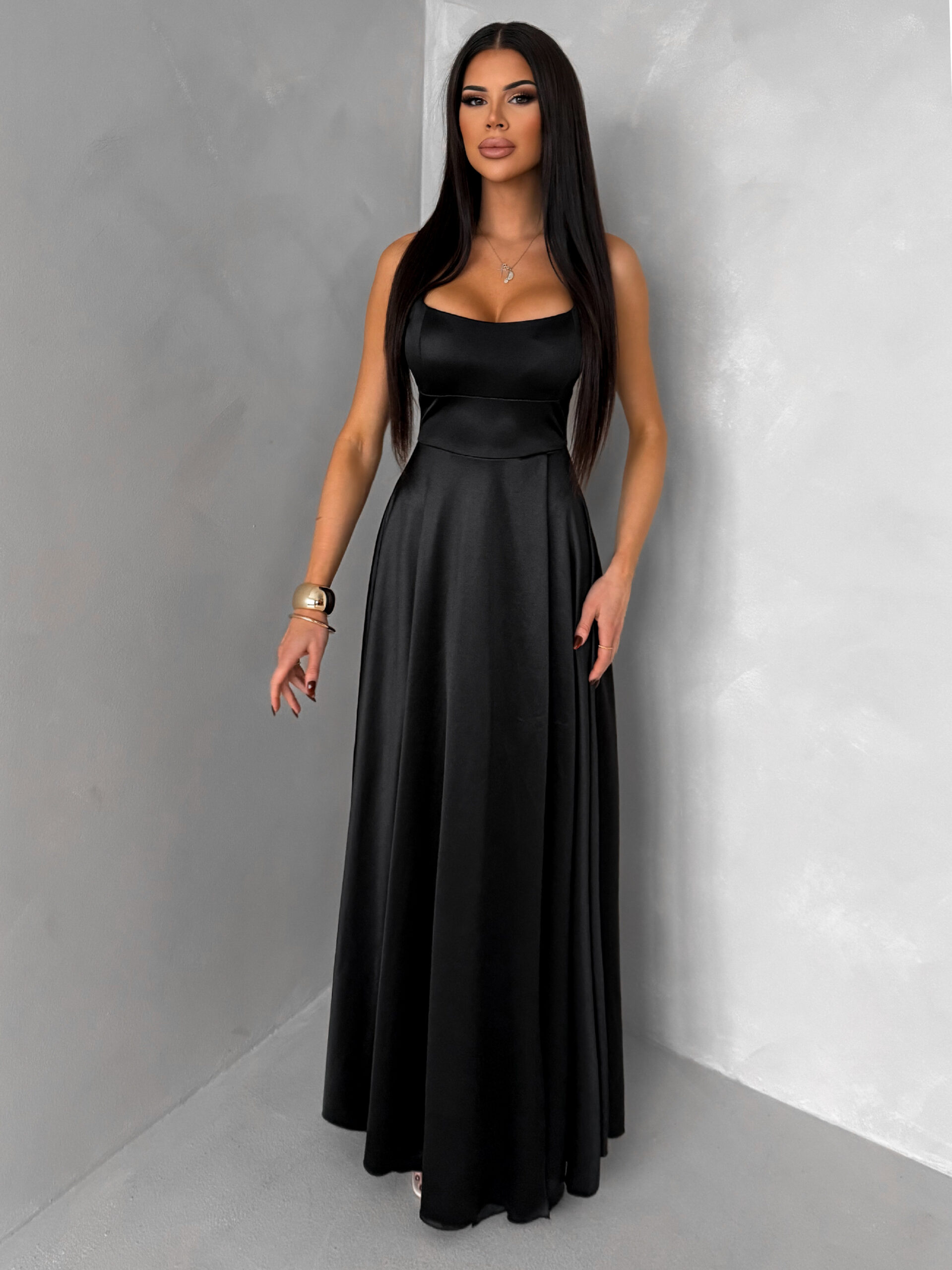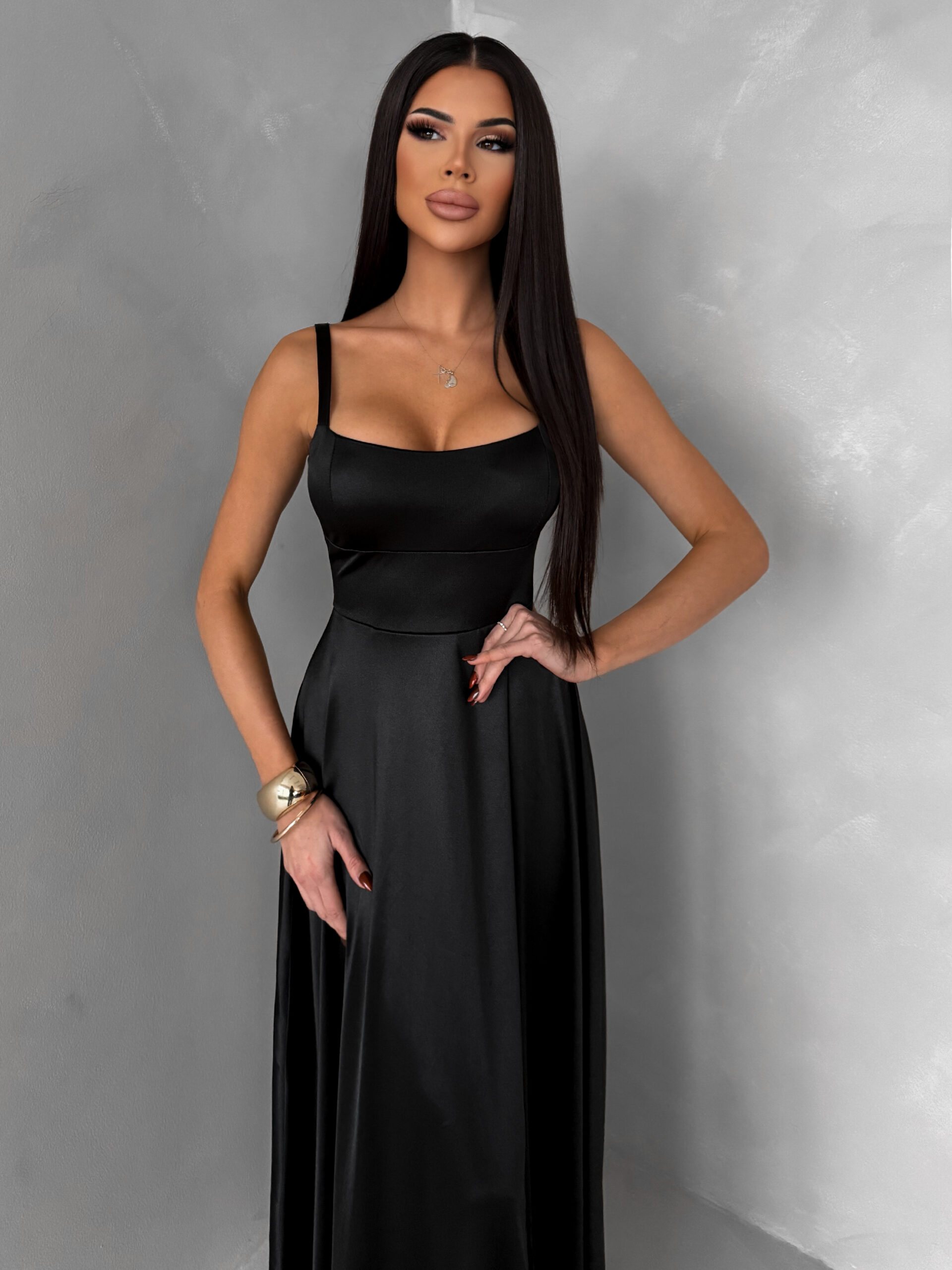 Černé dlouhé saténové společenské šaty HELSIN na ramínka Velikost: ONESIZE
