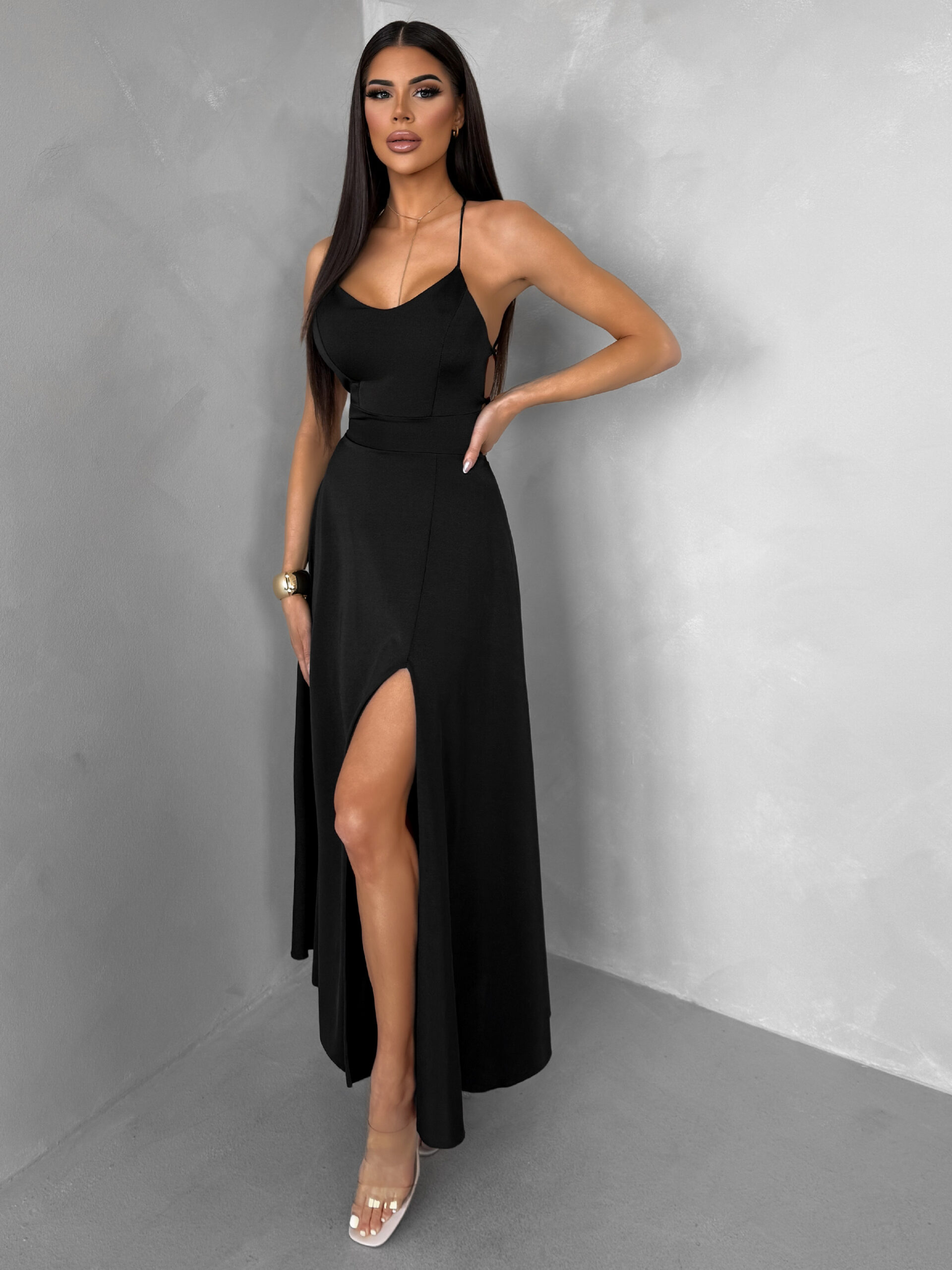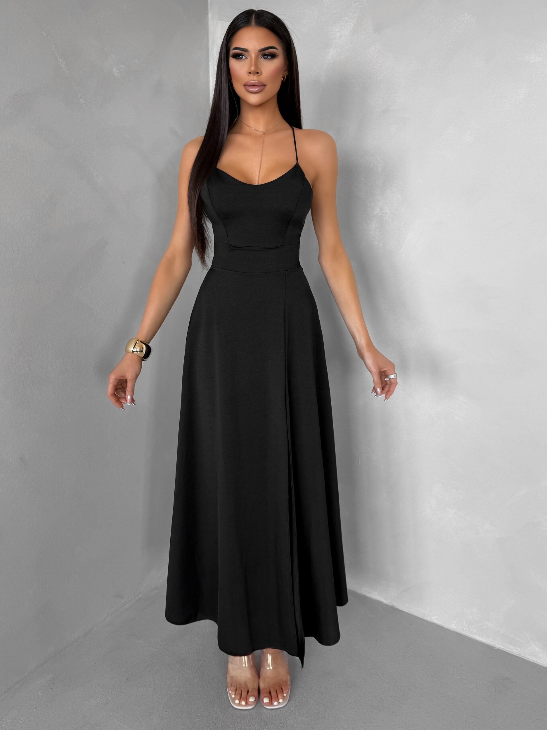 Černé saténové elegantní šaty SIMUEL se šněrováním Velikost: ONESIZE