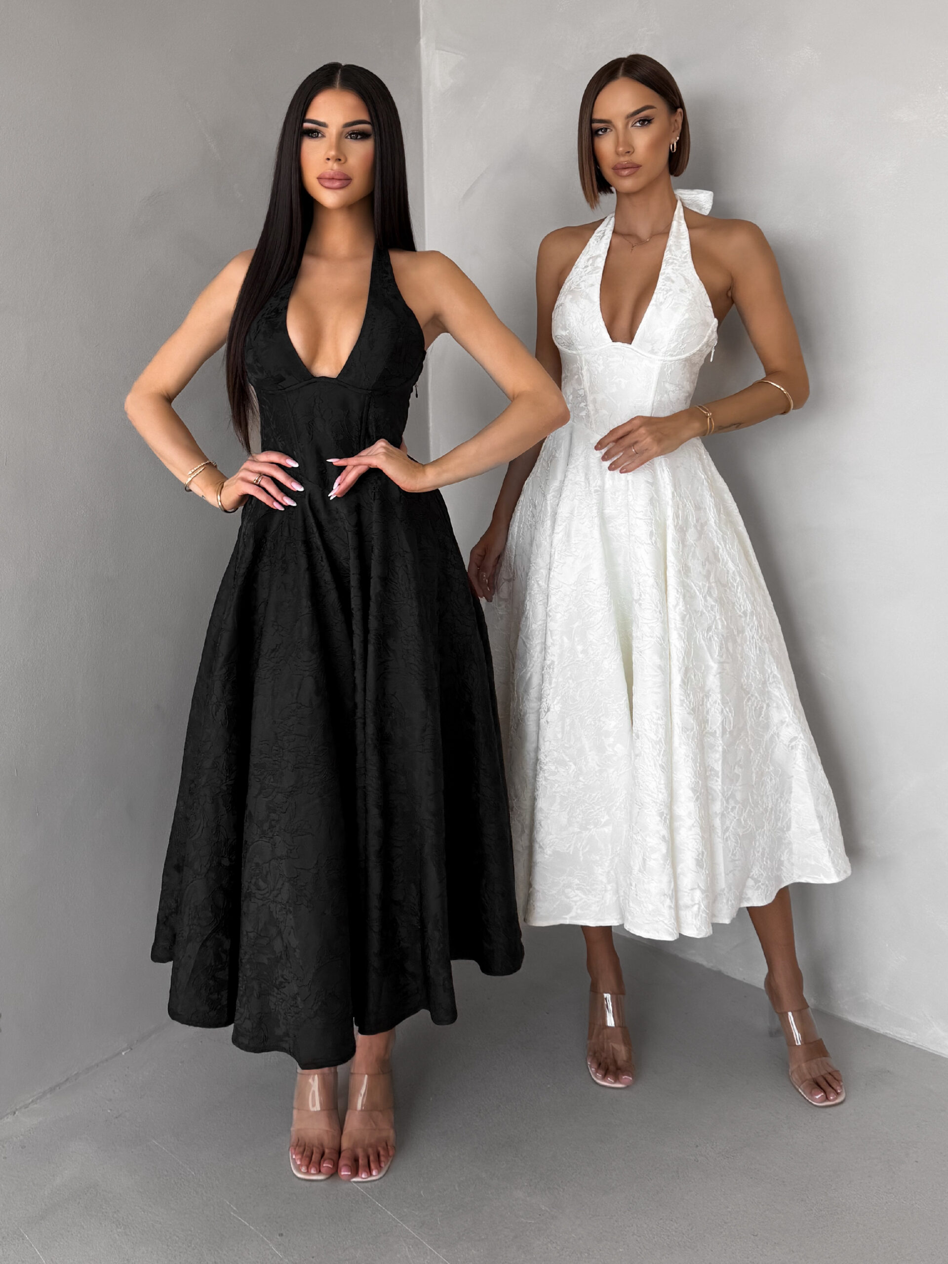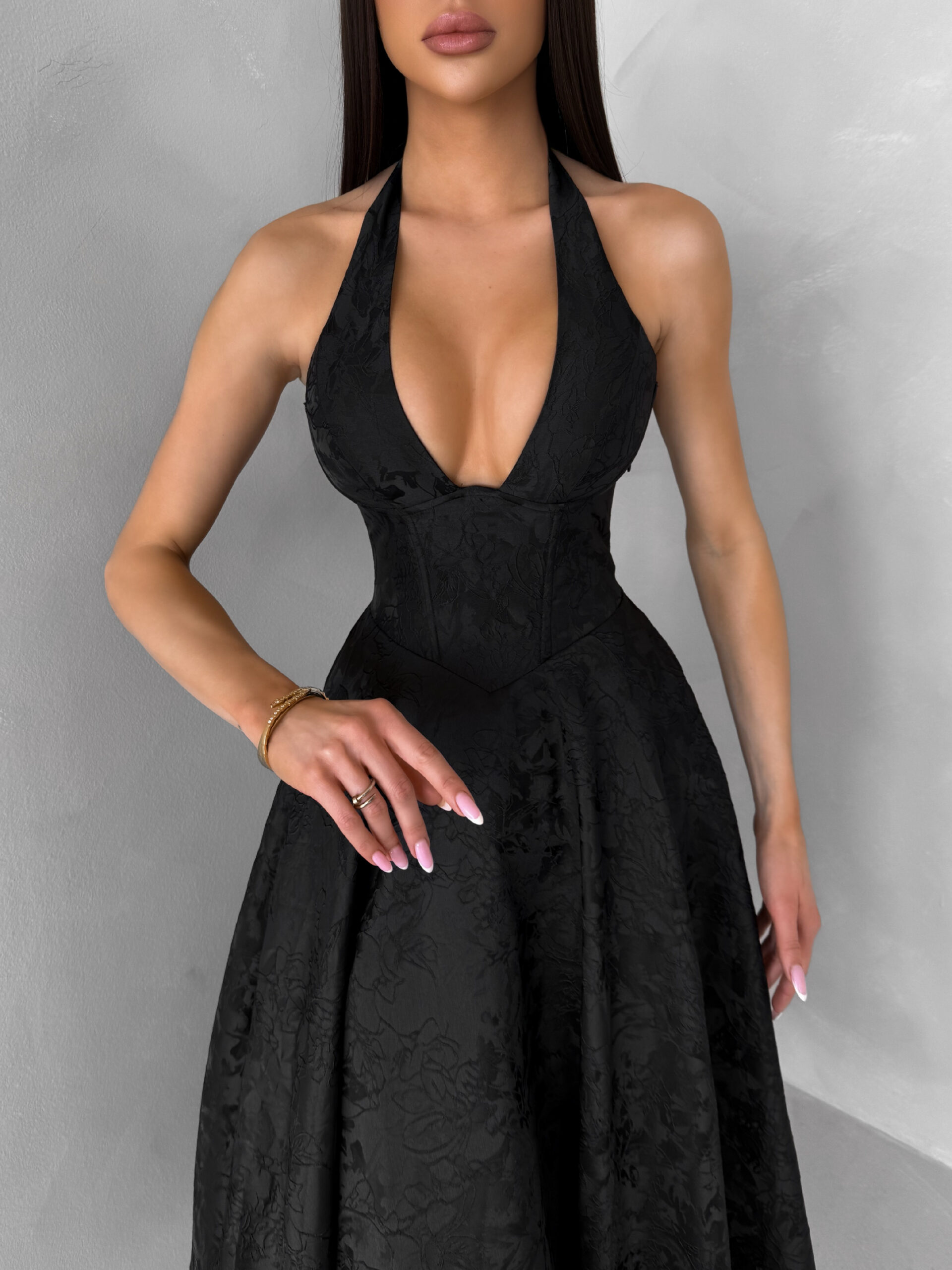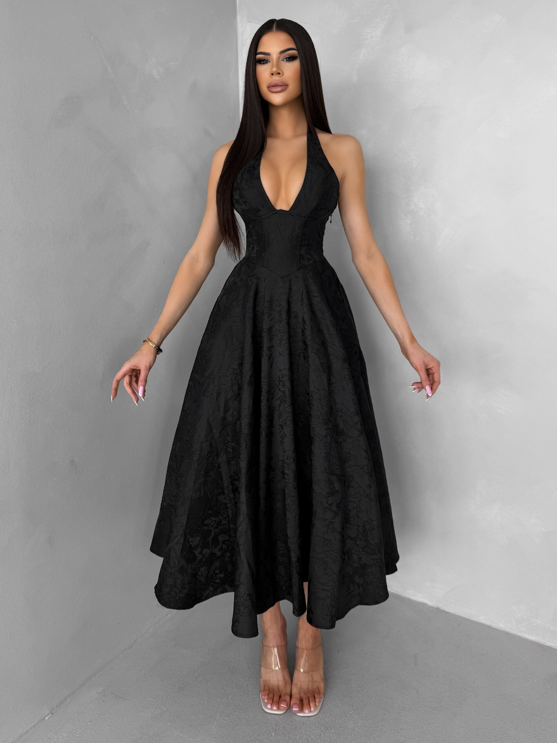 Černé společenské vypasované áčkové midi šaty NYXORA Velikost: L
