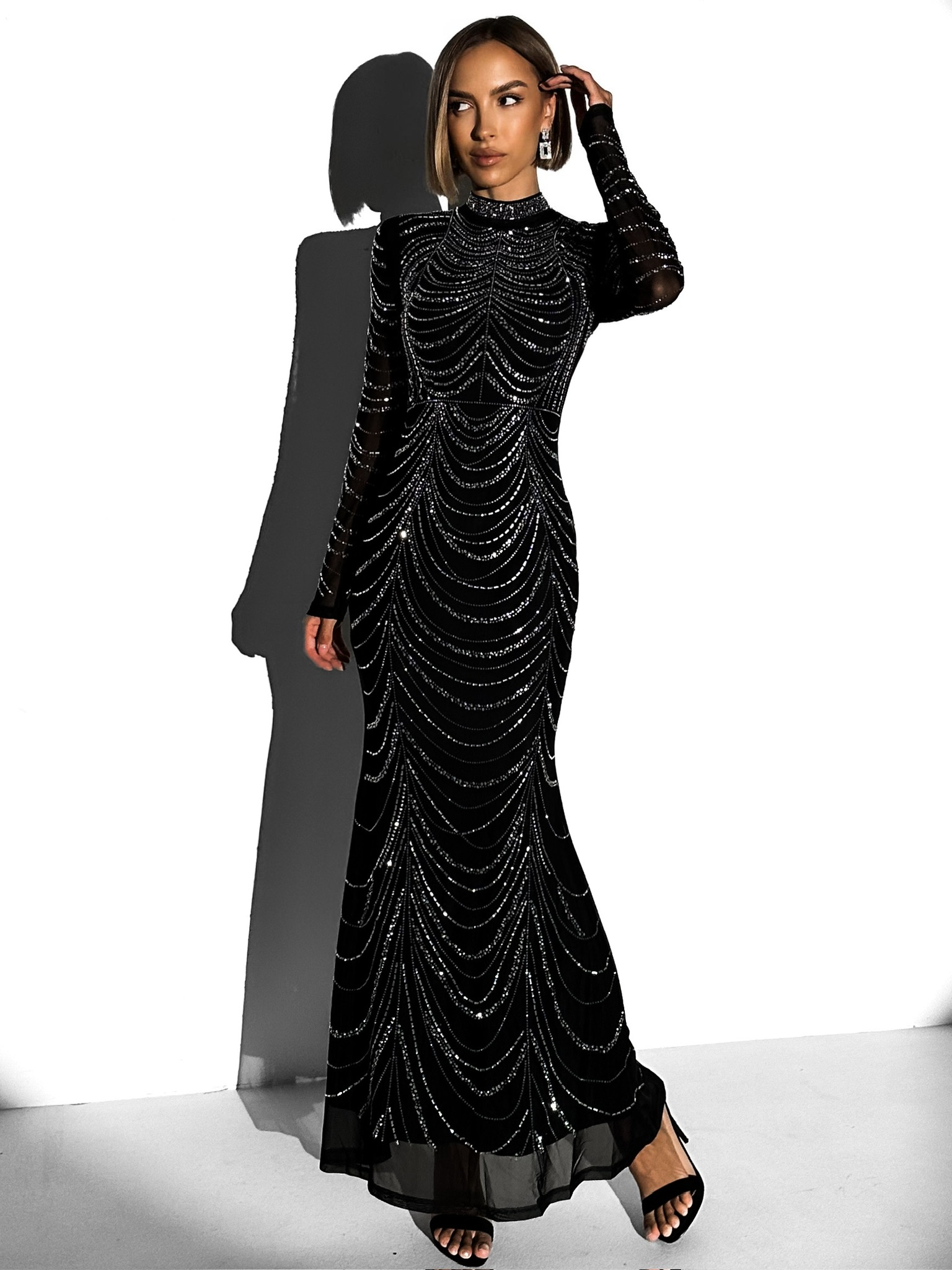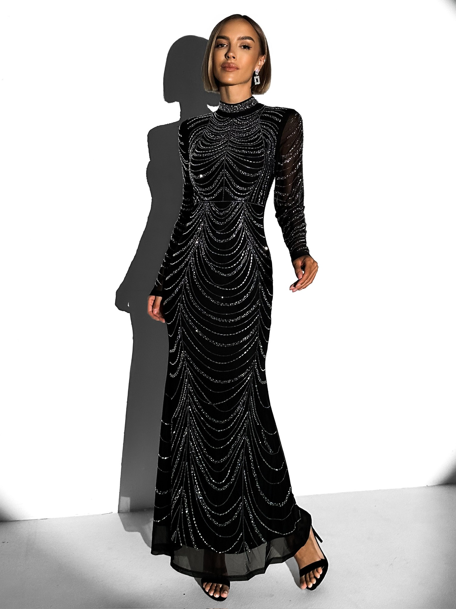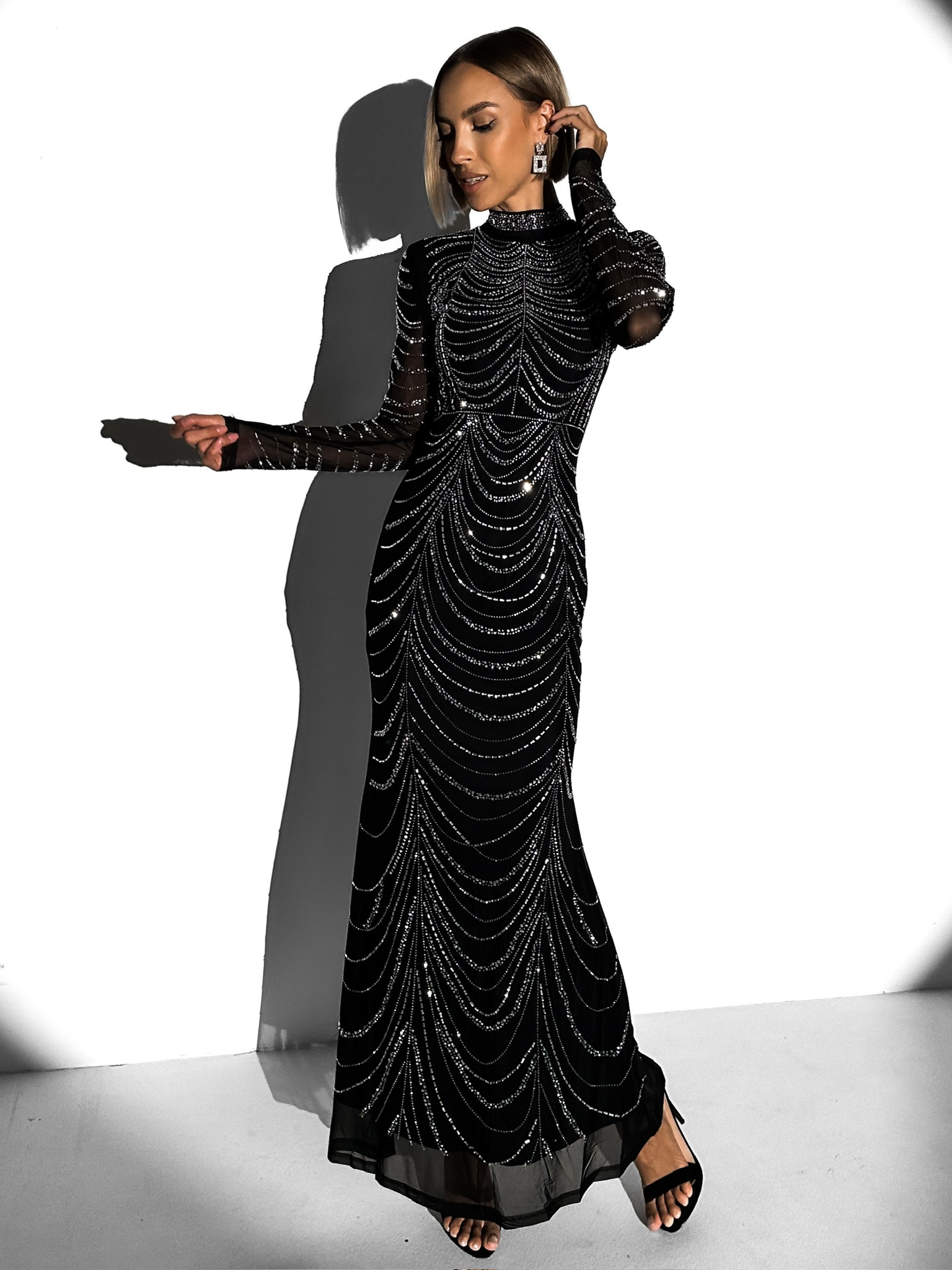 Černé třpytivé dlouhé šaty BISERKA s dlouhým rukávem Velikost: S