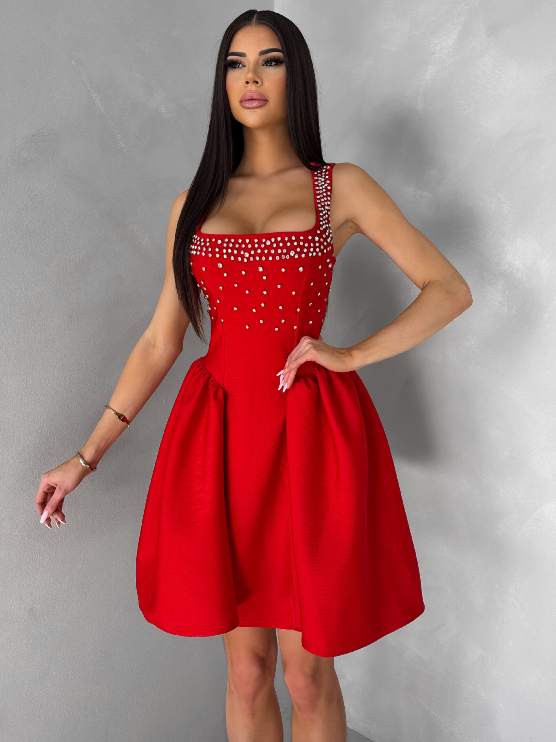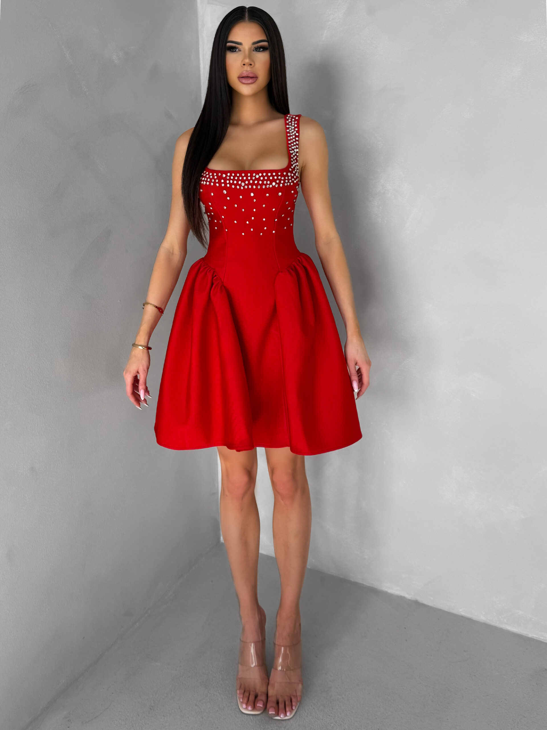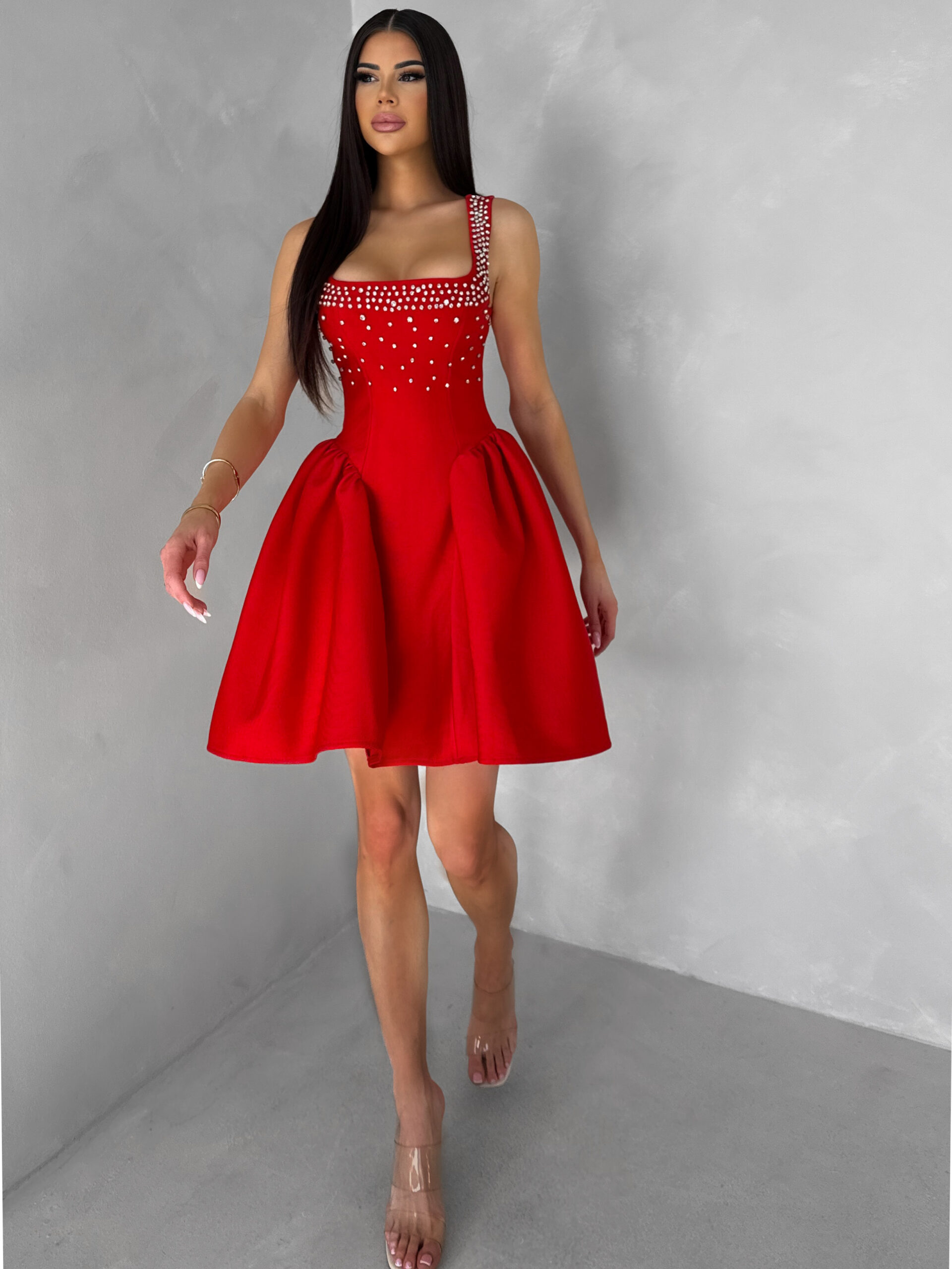Červené krátké vypasované áčkové šaty MIRELYS s kamínky Velikost: L
