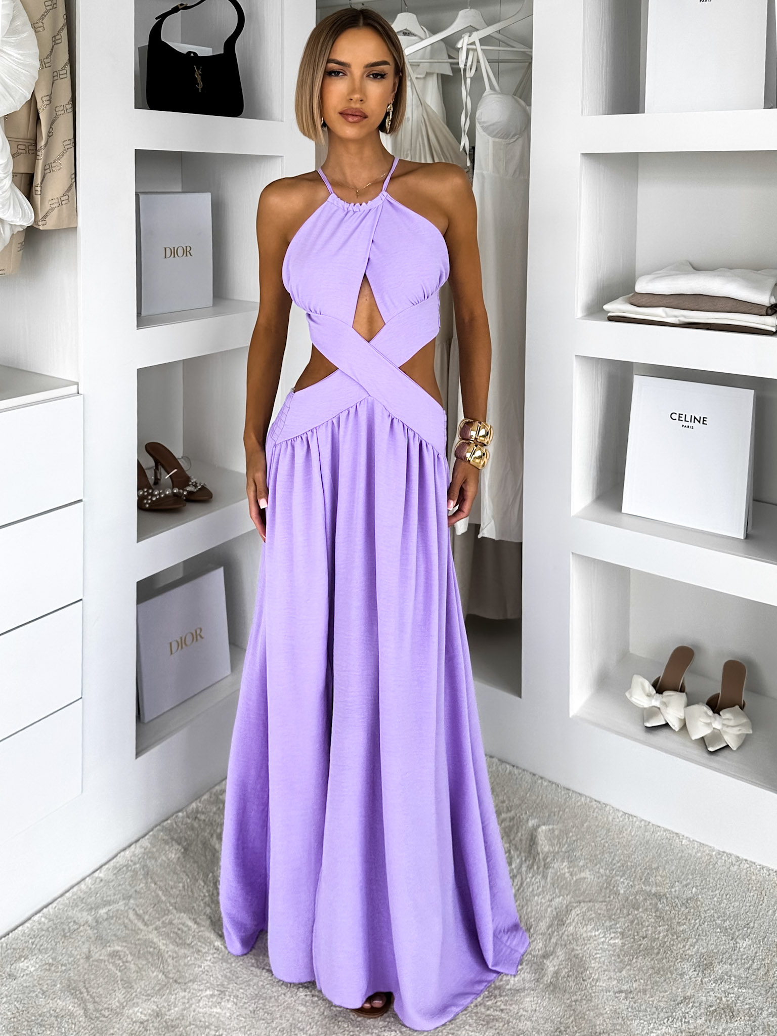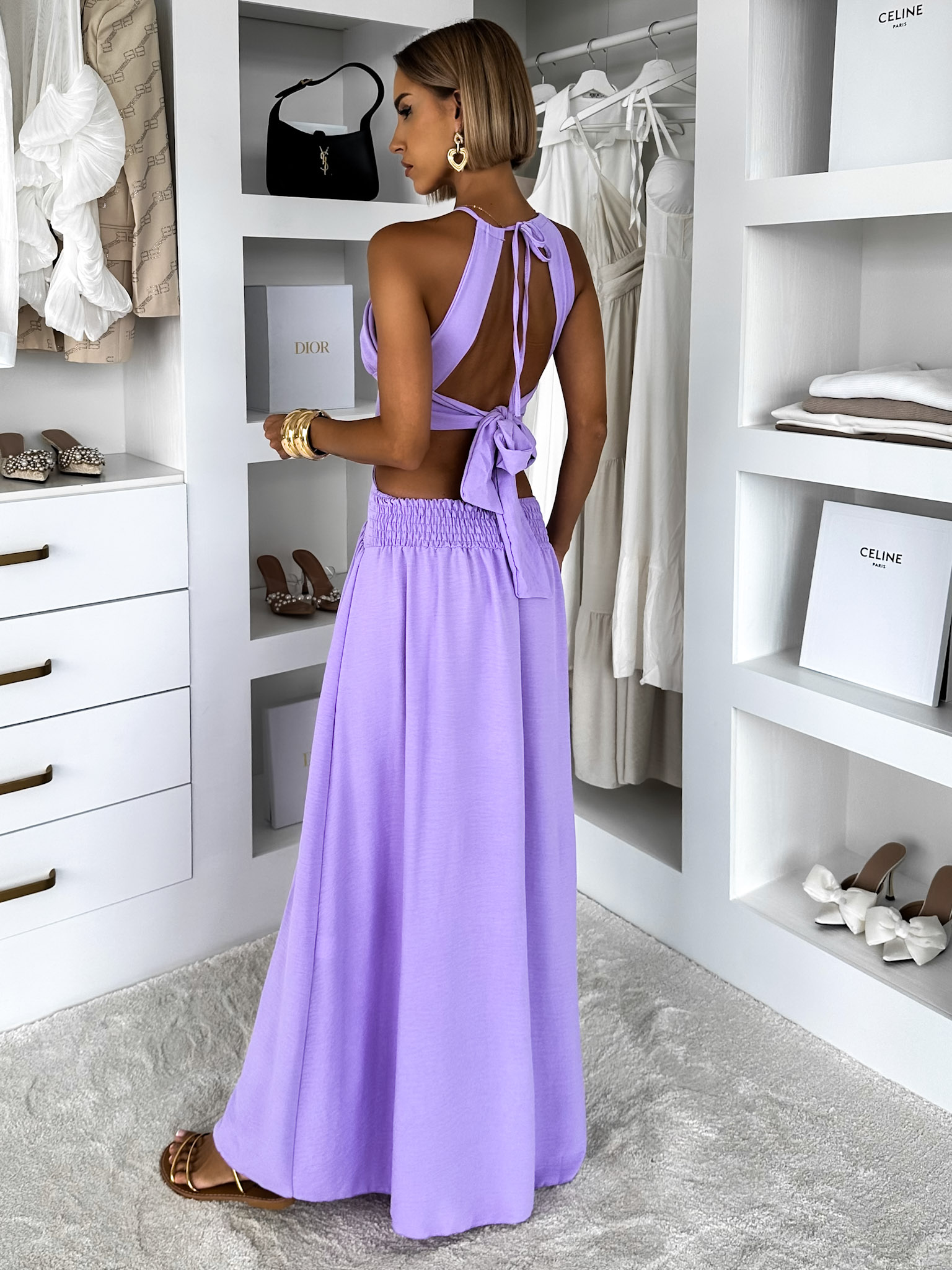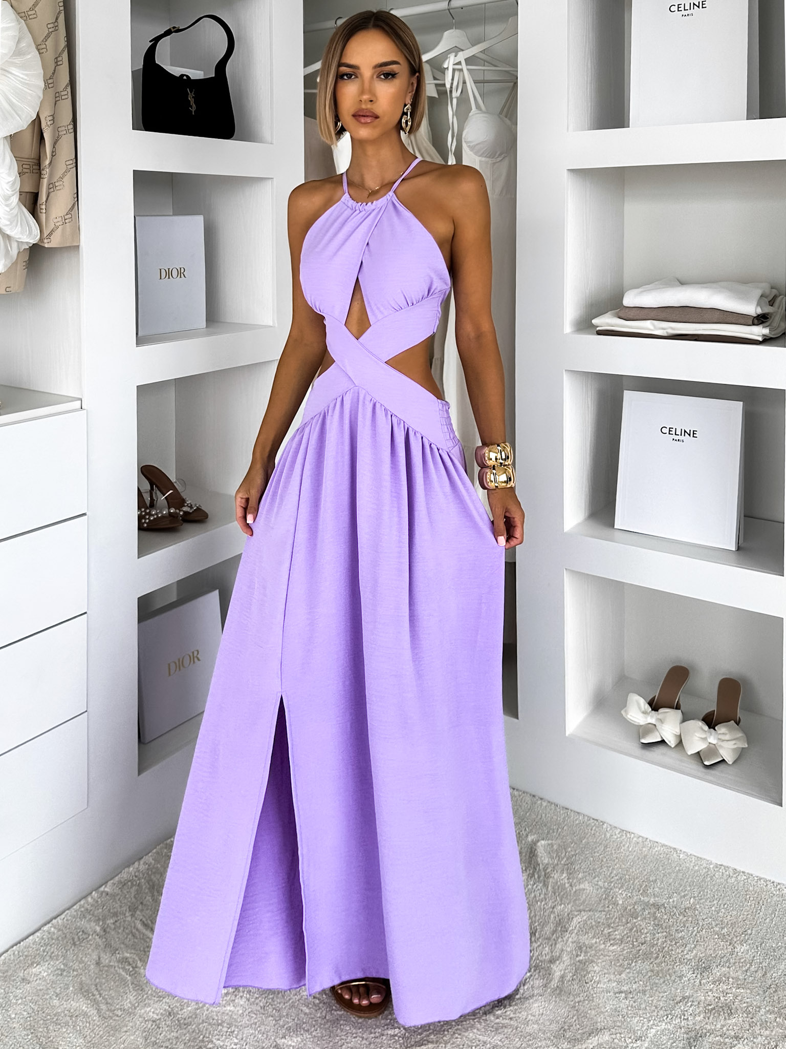 Fialové dlouhé šaty DELYEXA s vázáním a rozparkem Velikost: ONESIZE
