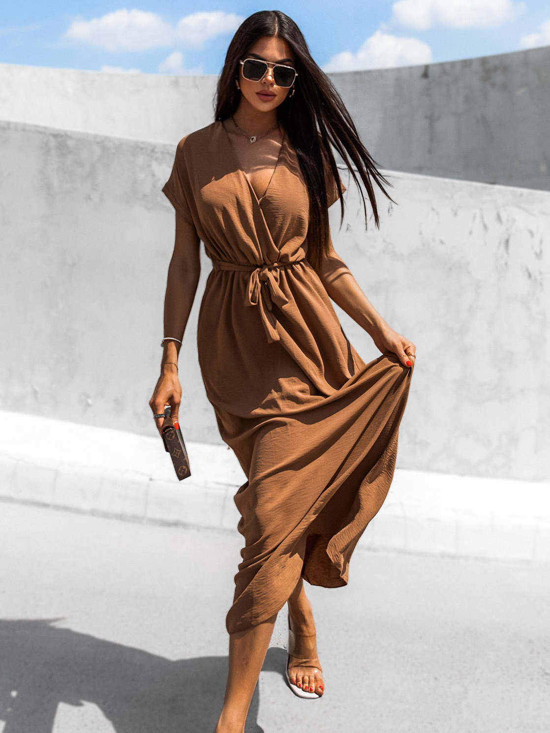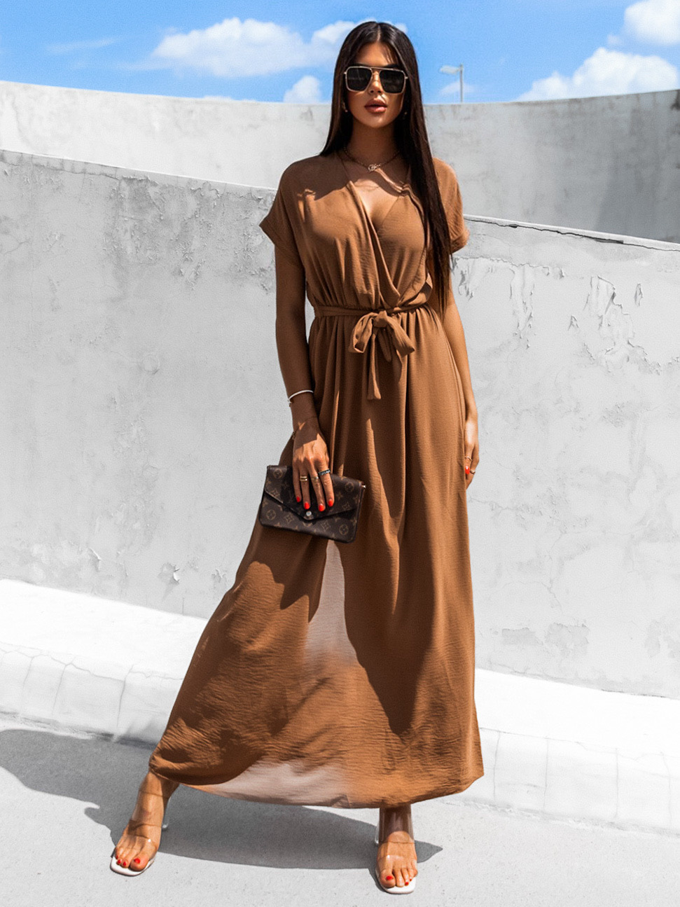 Hnědé delší elegantní šaty FEYLING se zavazováním