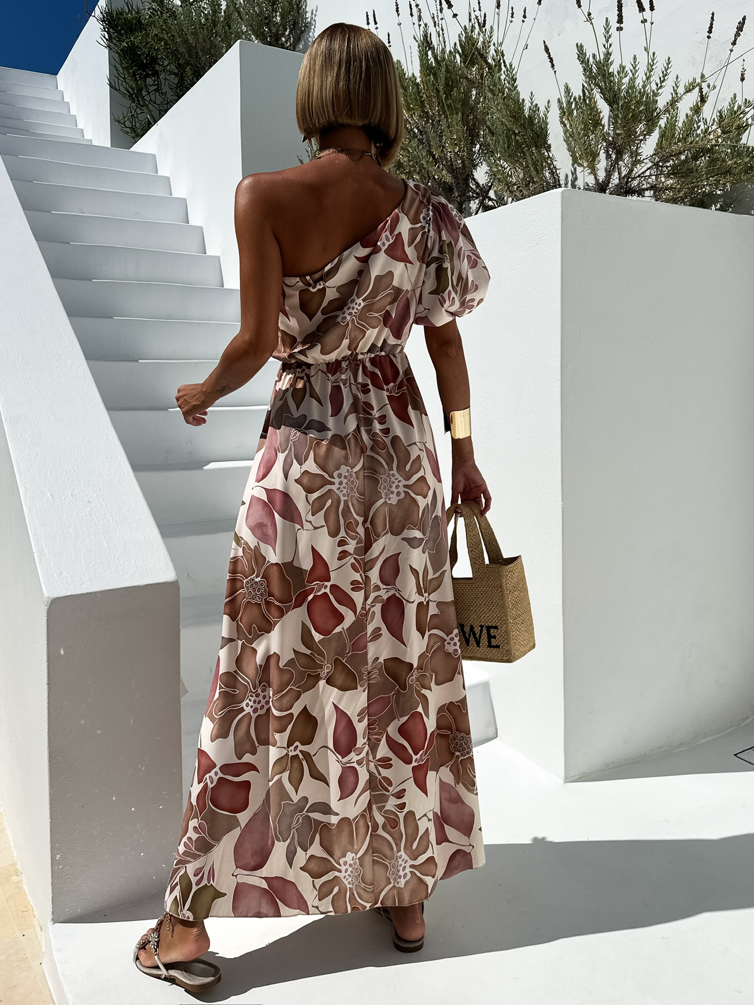 Hnědé dlouhé květované šaty TEODOZ na jedno rameno Velikost: ONESIZE