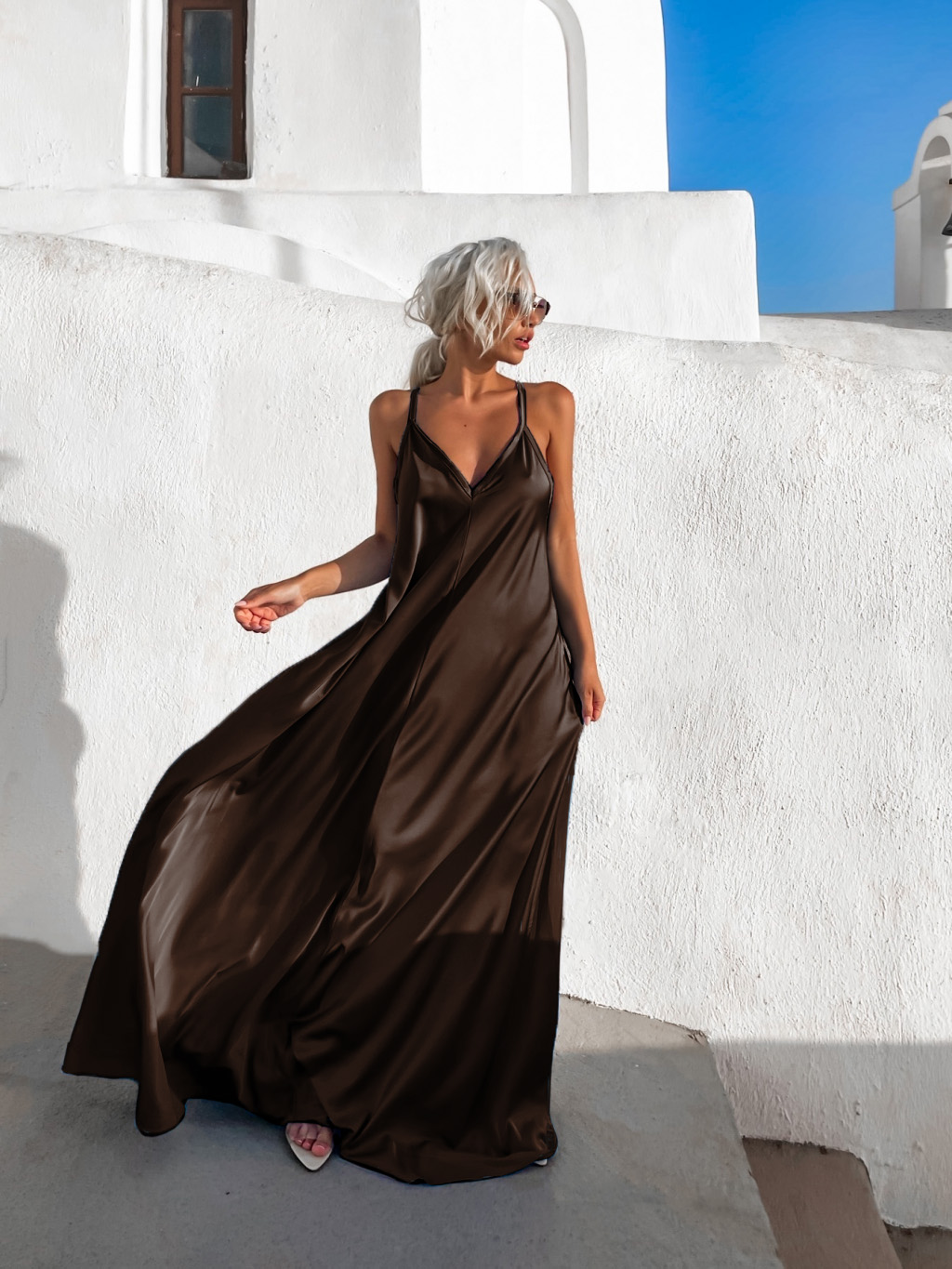 Hnědé dlouhé lesklé šaty HAYLEY Velikost: ONESIZE