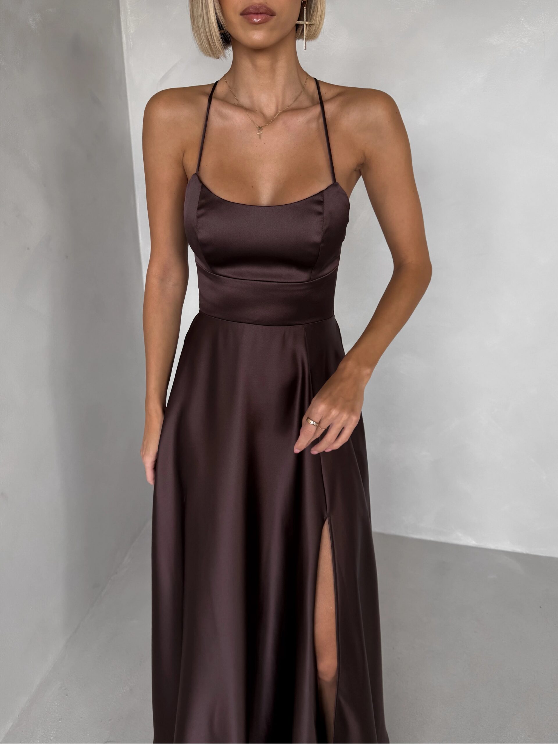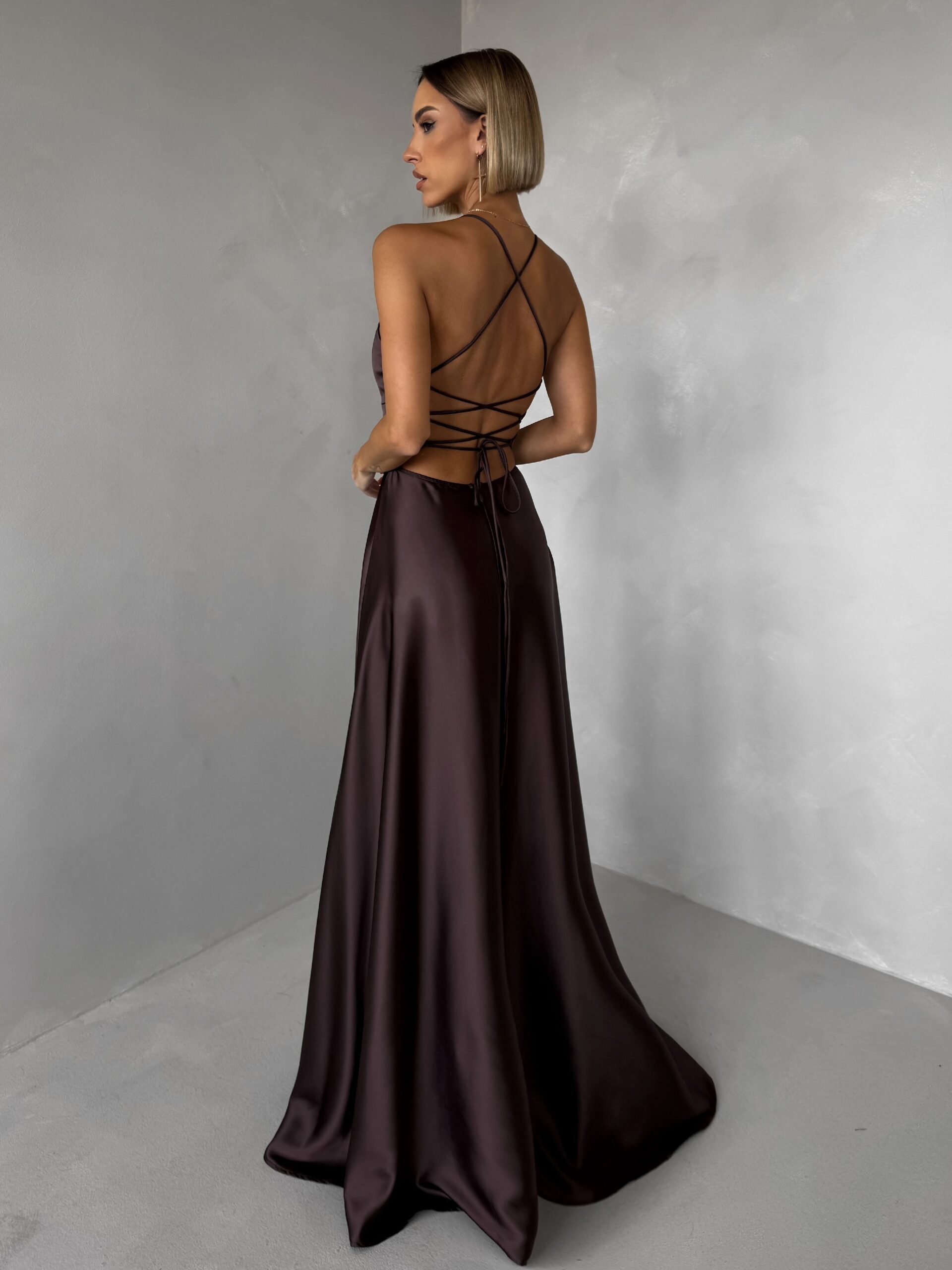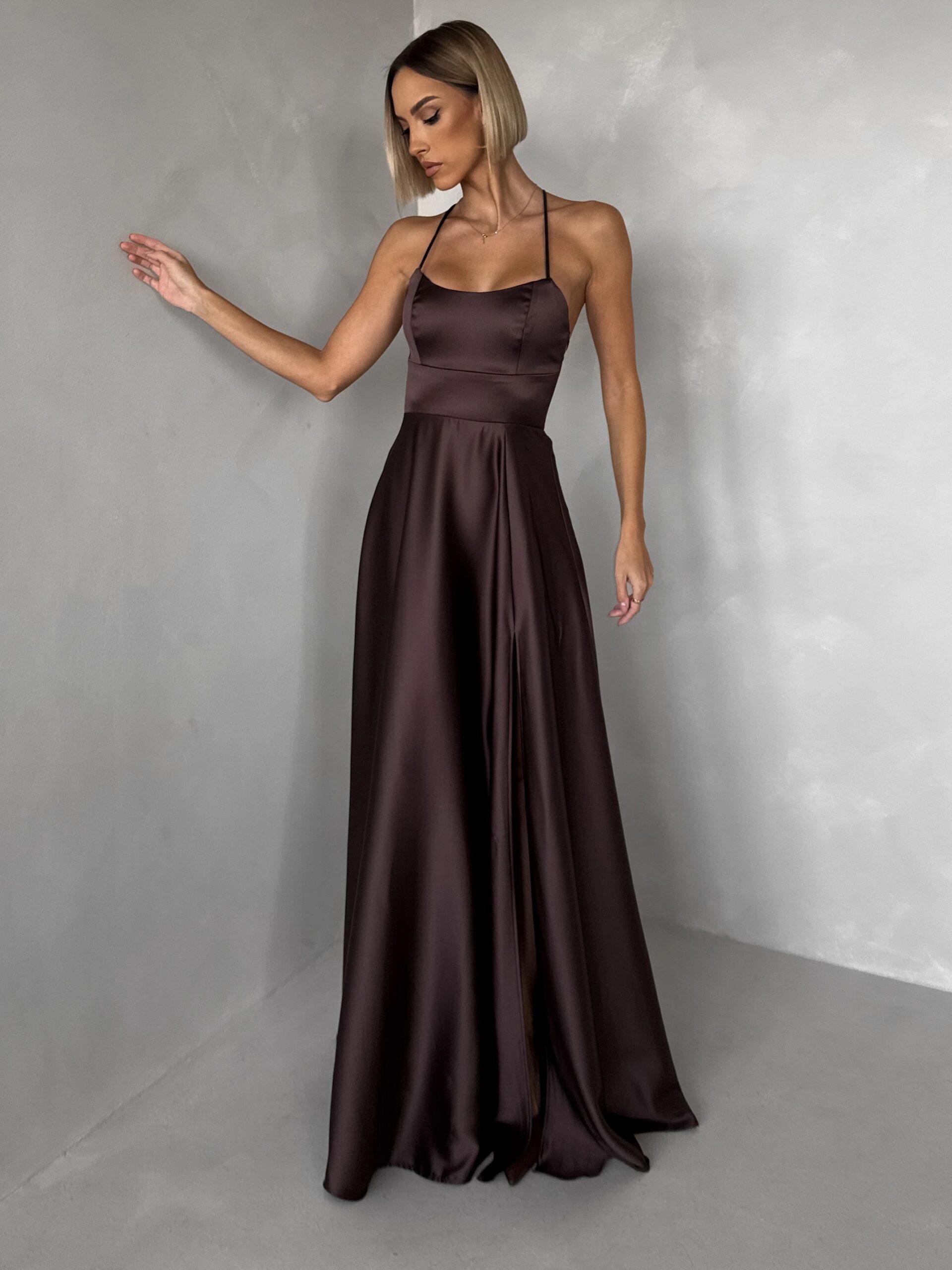 Hnědé dlouhé plesové společenské šaty CELLINES se šněrováním a rozparkem Velikost: M