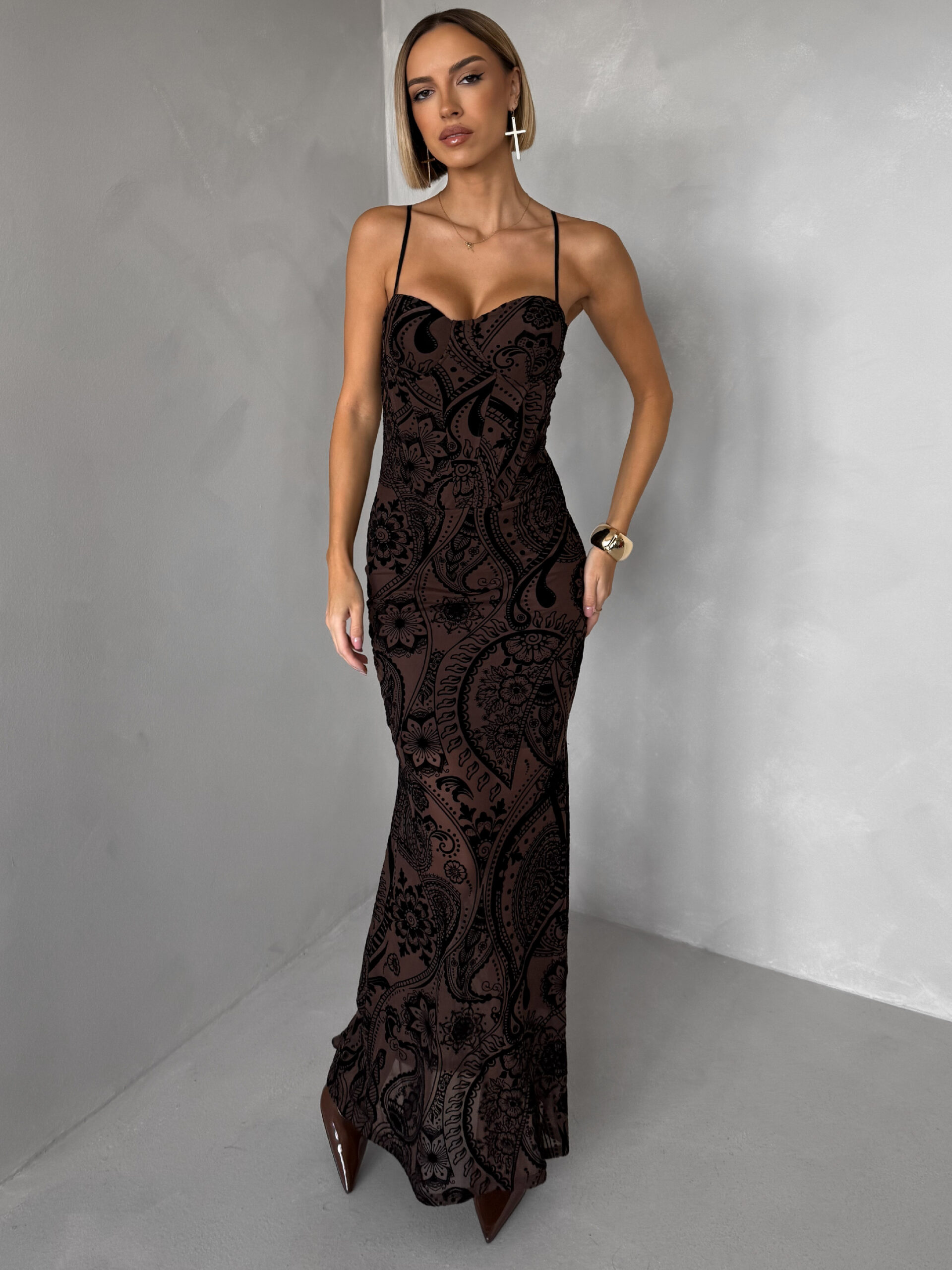 Hnědé dlouhé společenské šaty AVENZIA na ramínka Velikost: M/L