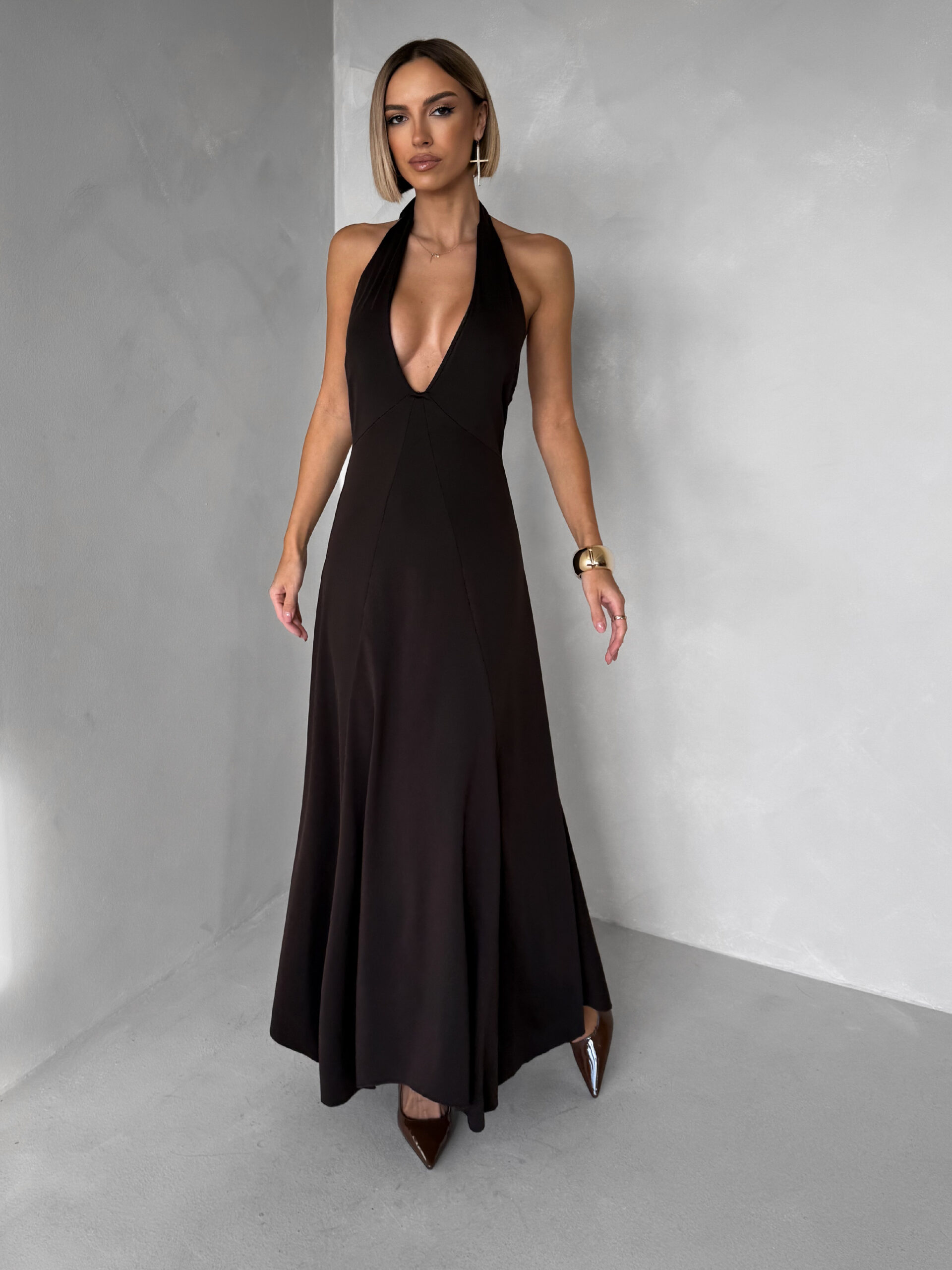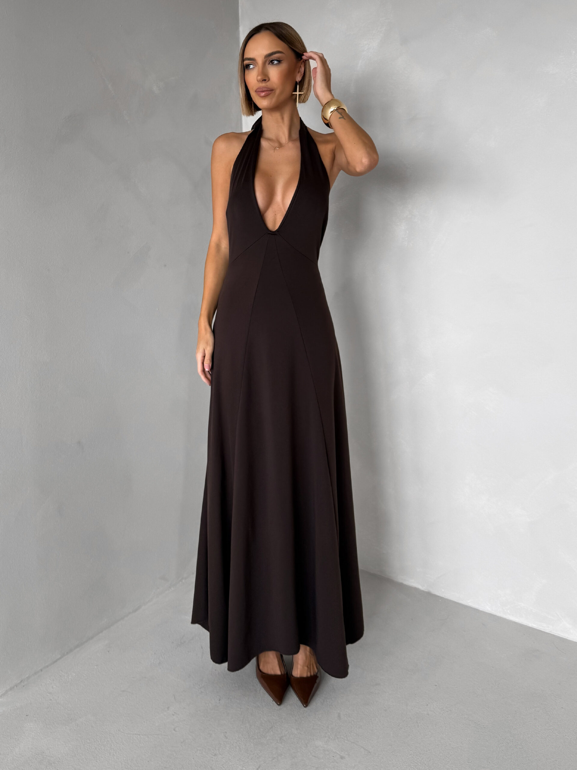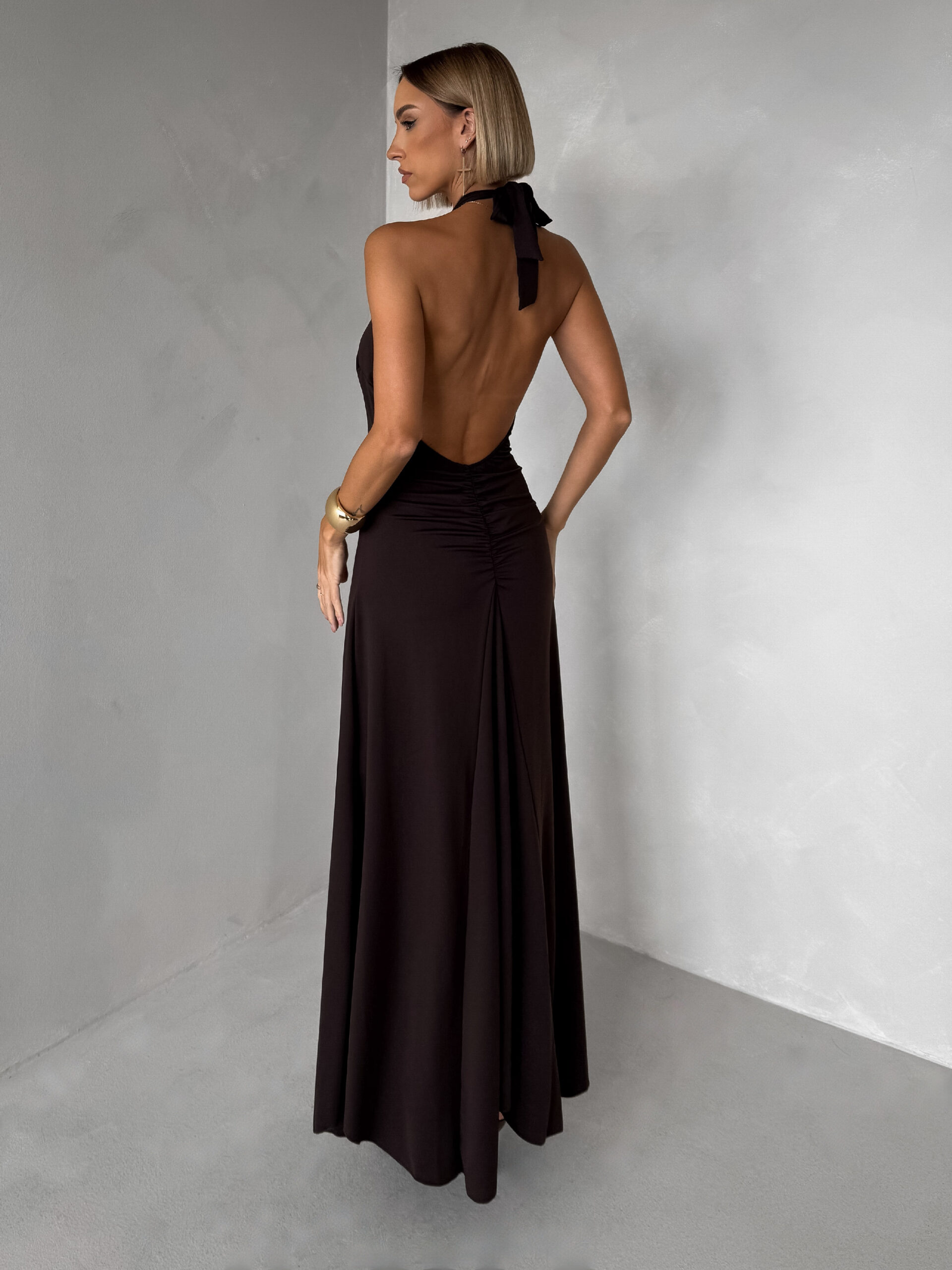 Hnědé elegantní dlouhé šaty NORELIE s výstřihem Velikost: ONESIZE