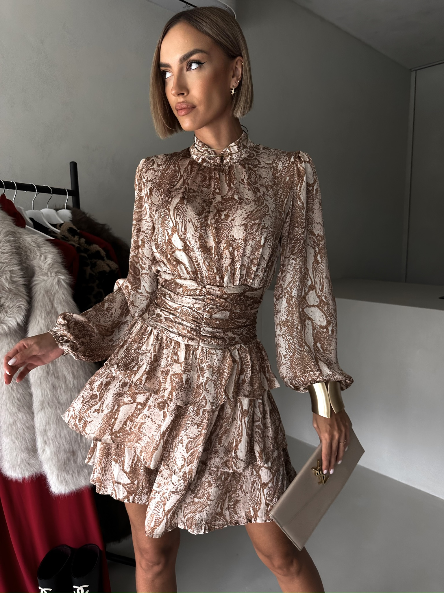 Hnědé elegantní šaty LEONA s volány Velikost: L