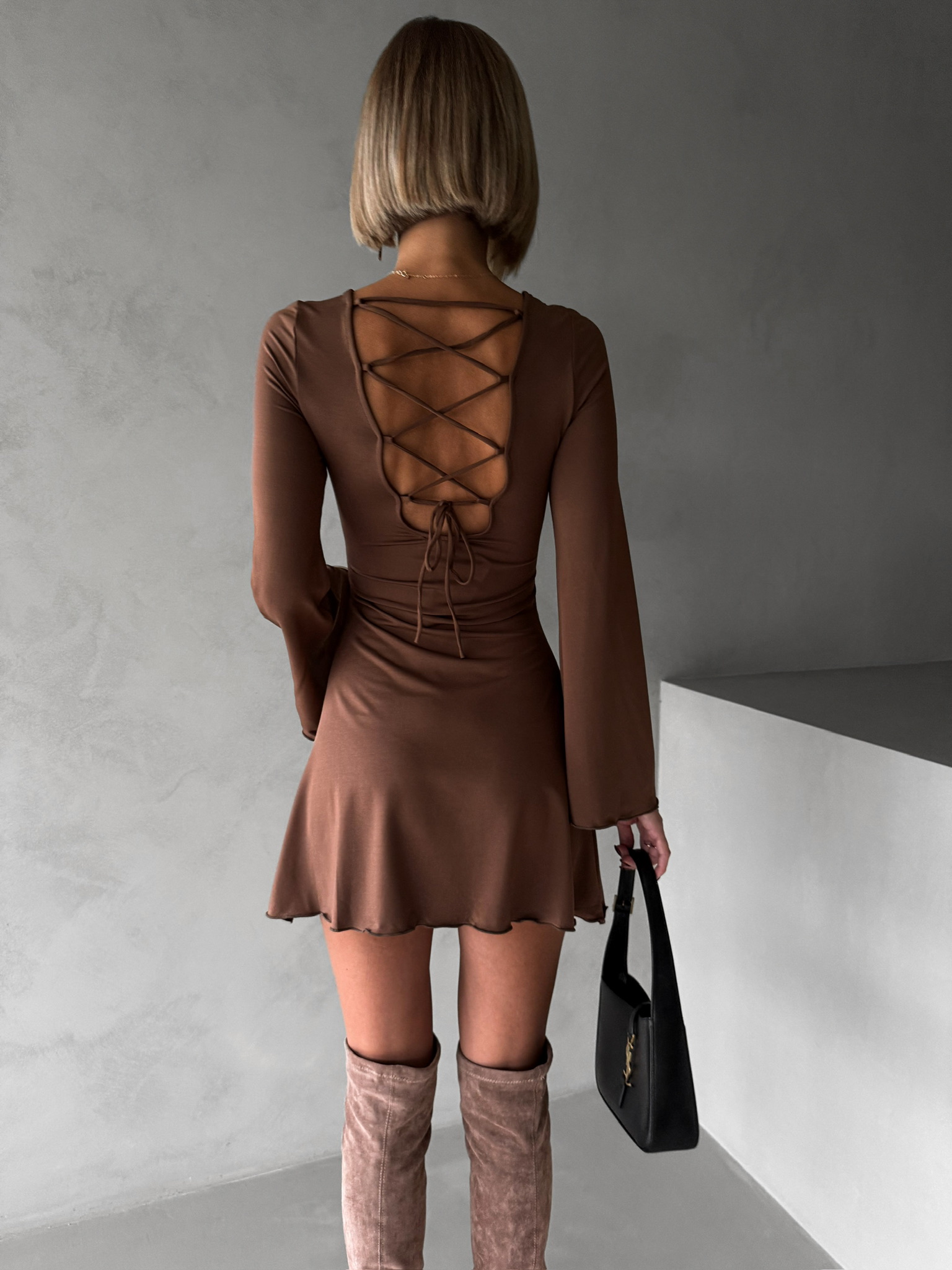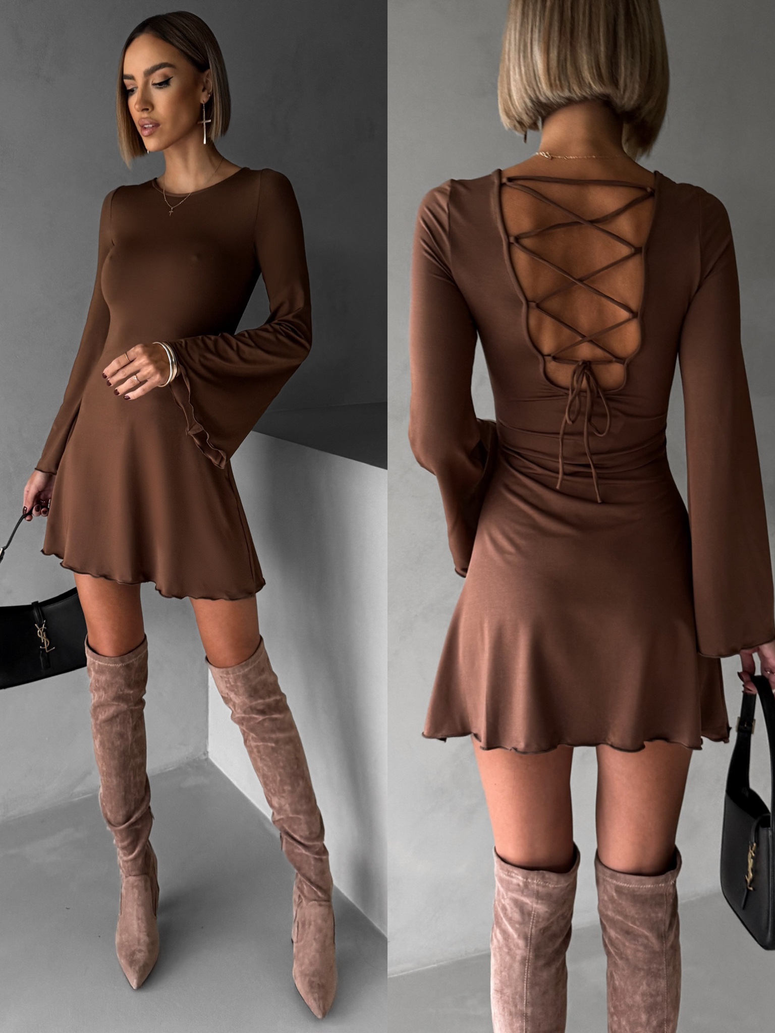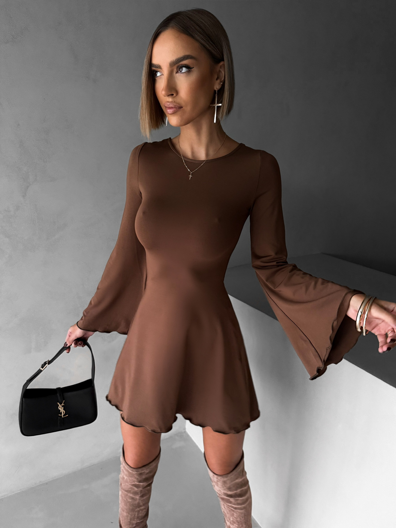 Hnědé krátké áčkové šaty AGNETA s dlouhým rukávem Velikost: S/M