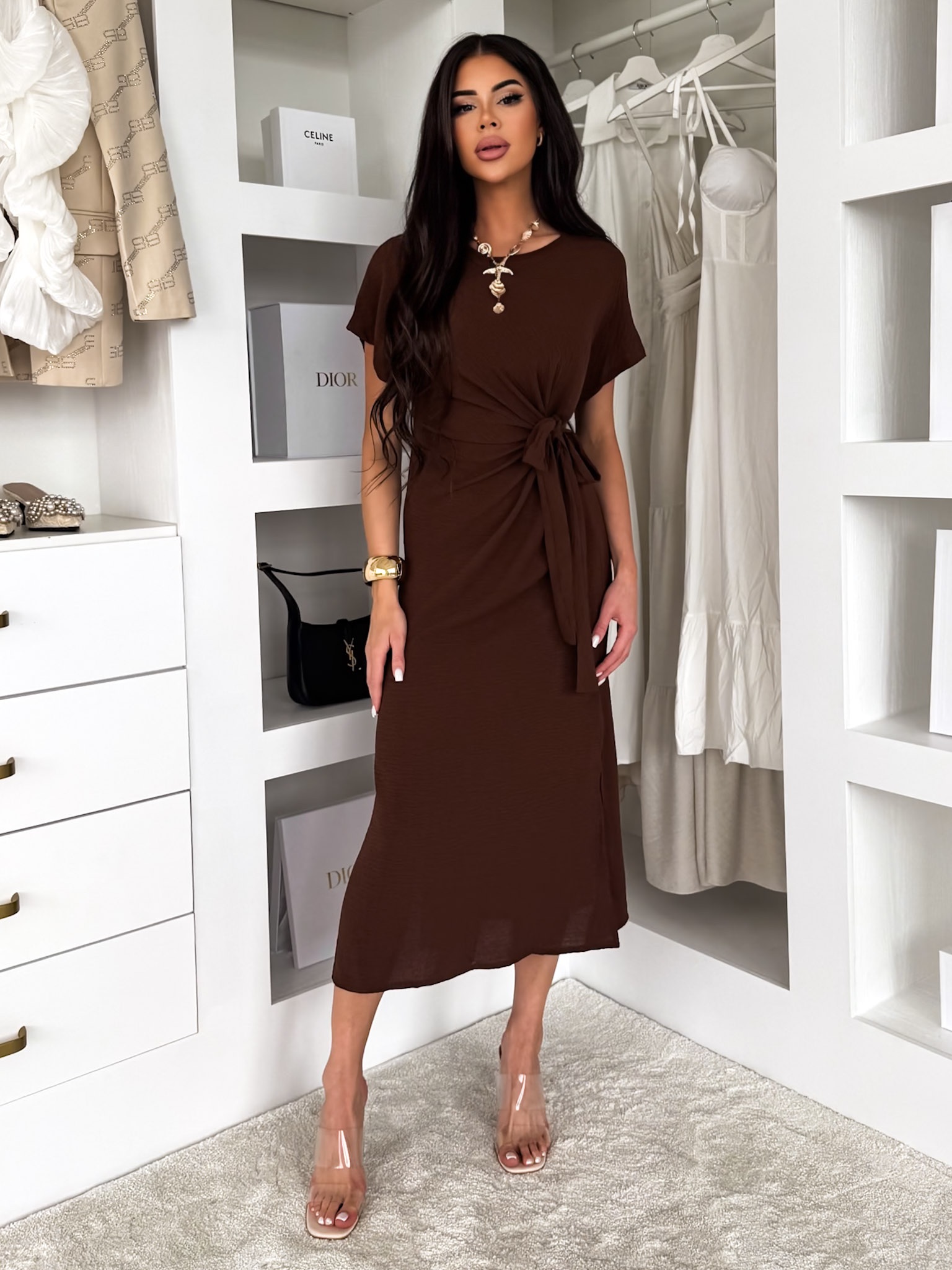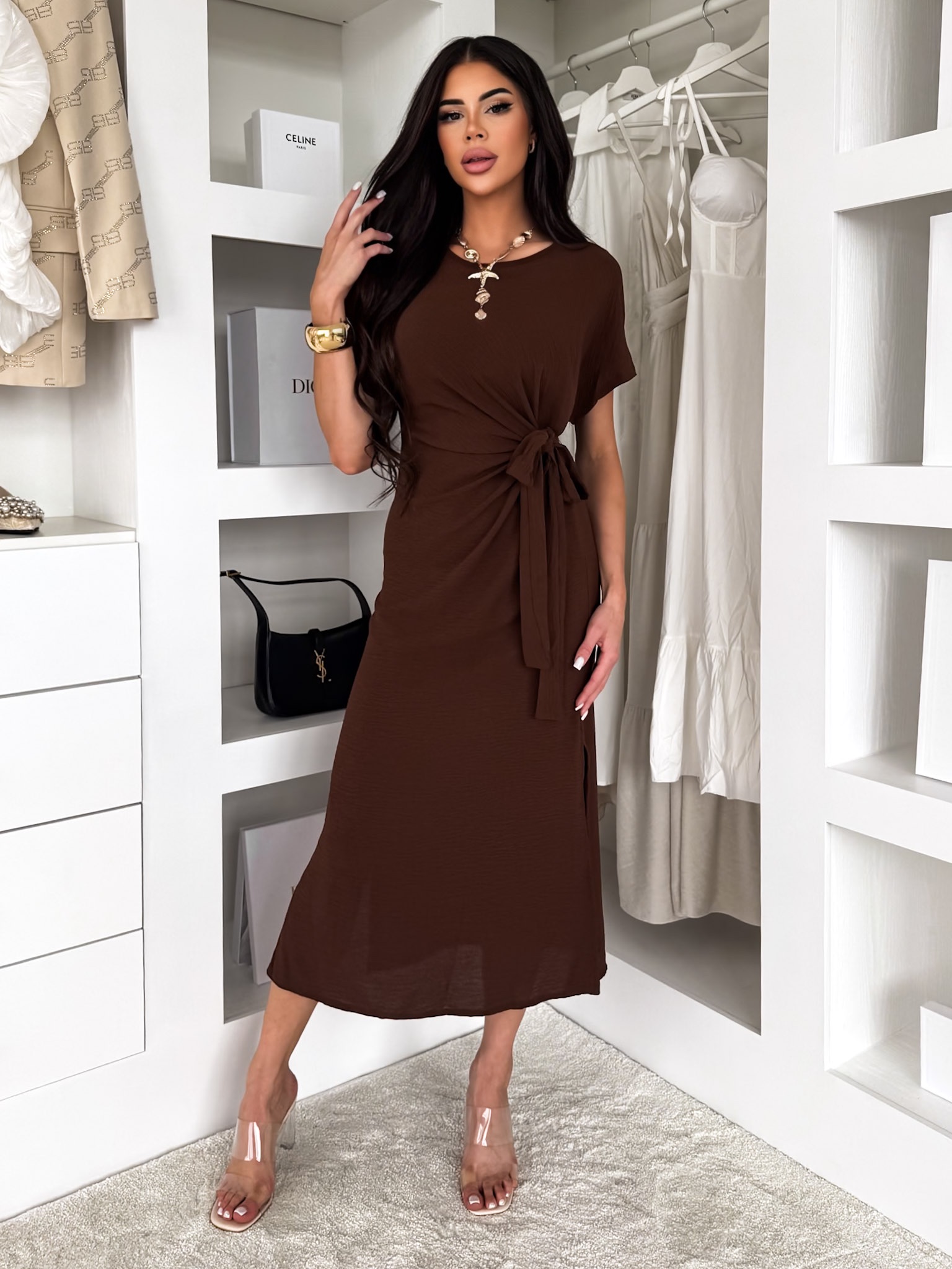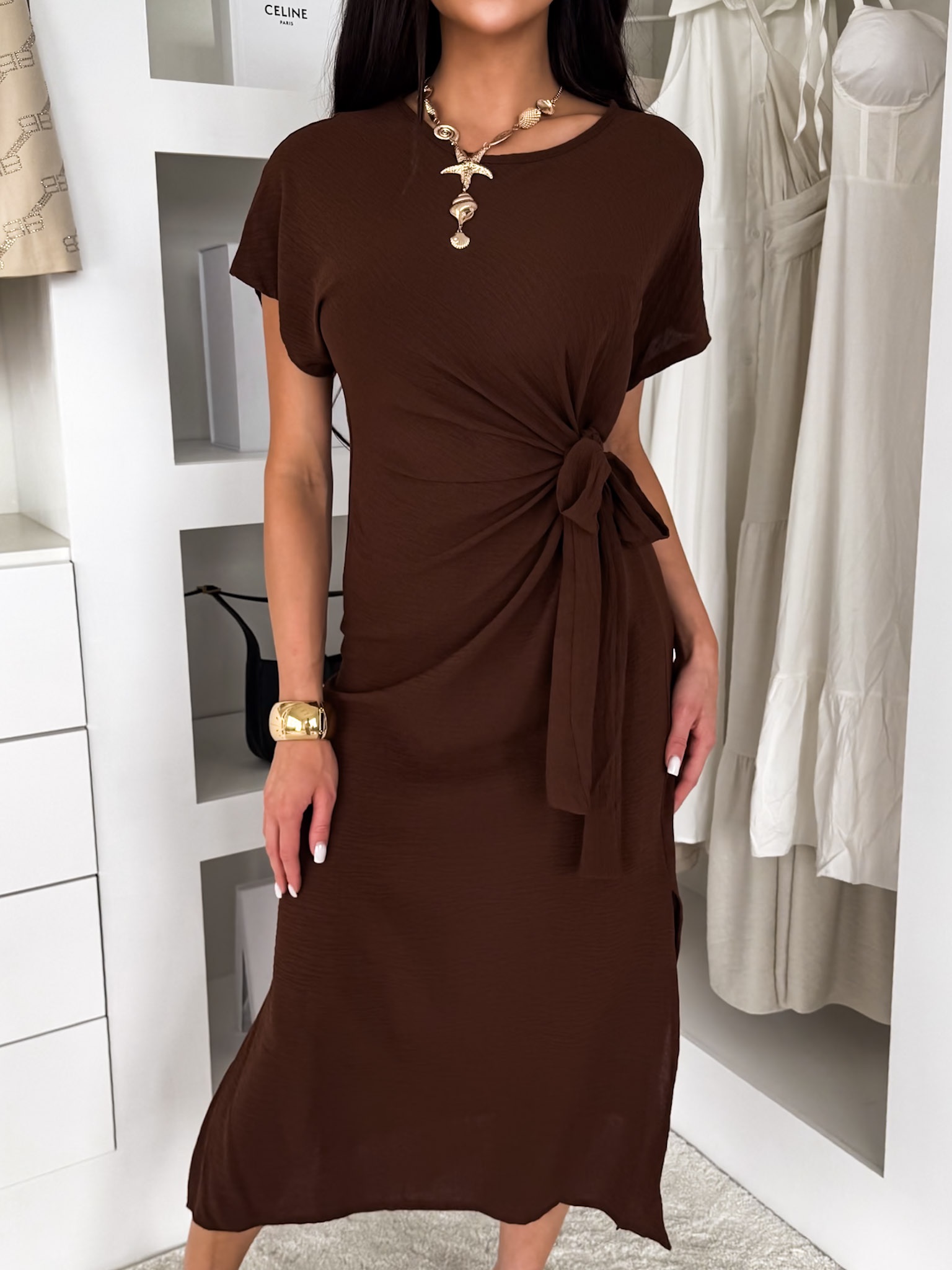 Hnědé lehké vypasované šaty NIRELA s vázáním Velikost: ONESIZE