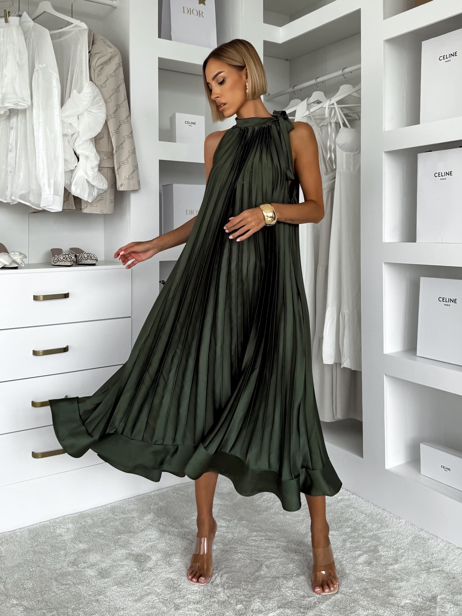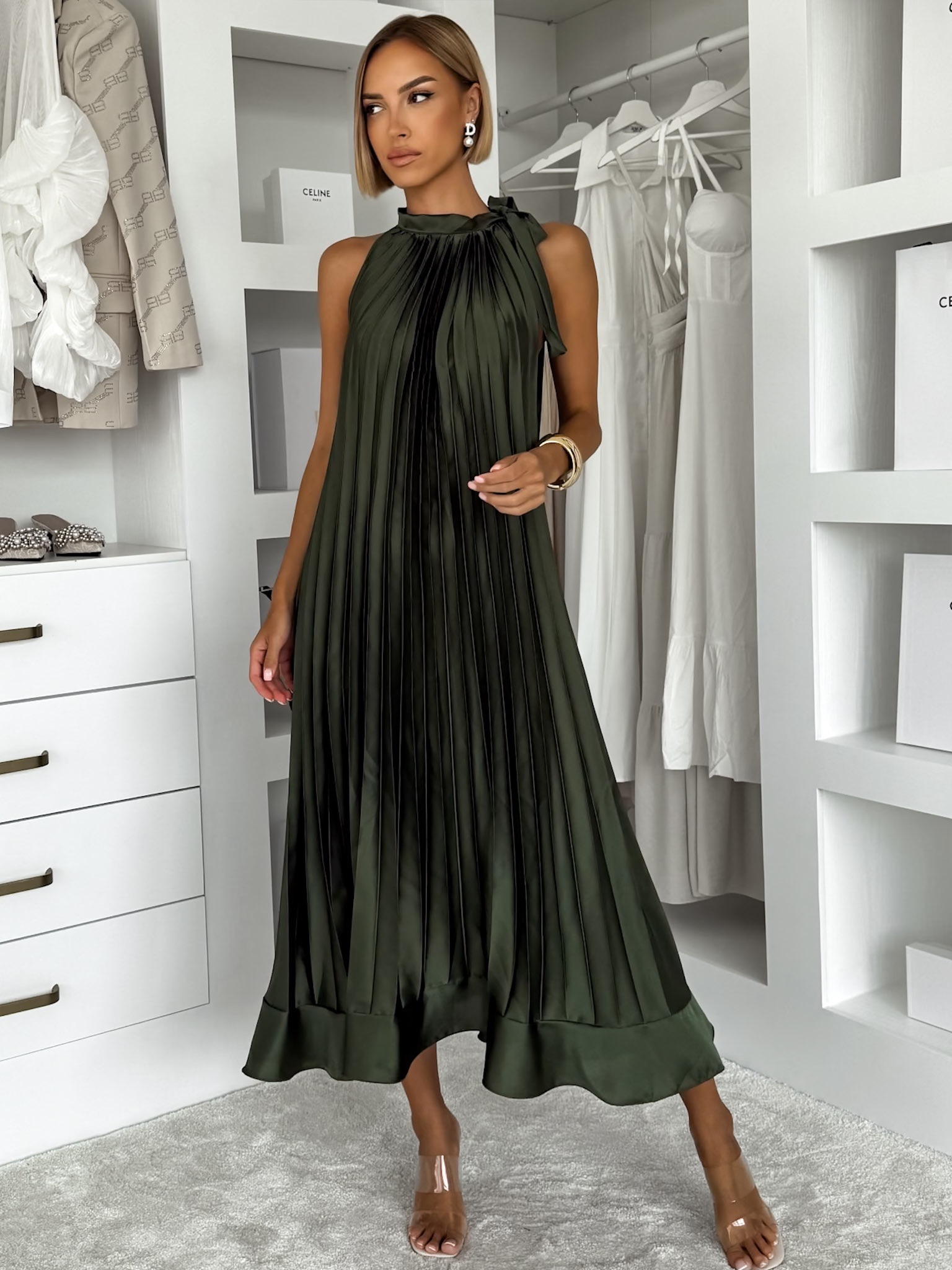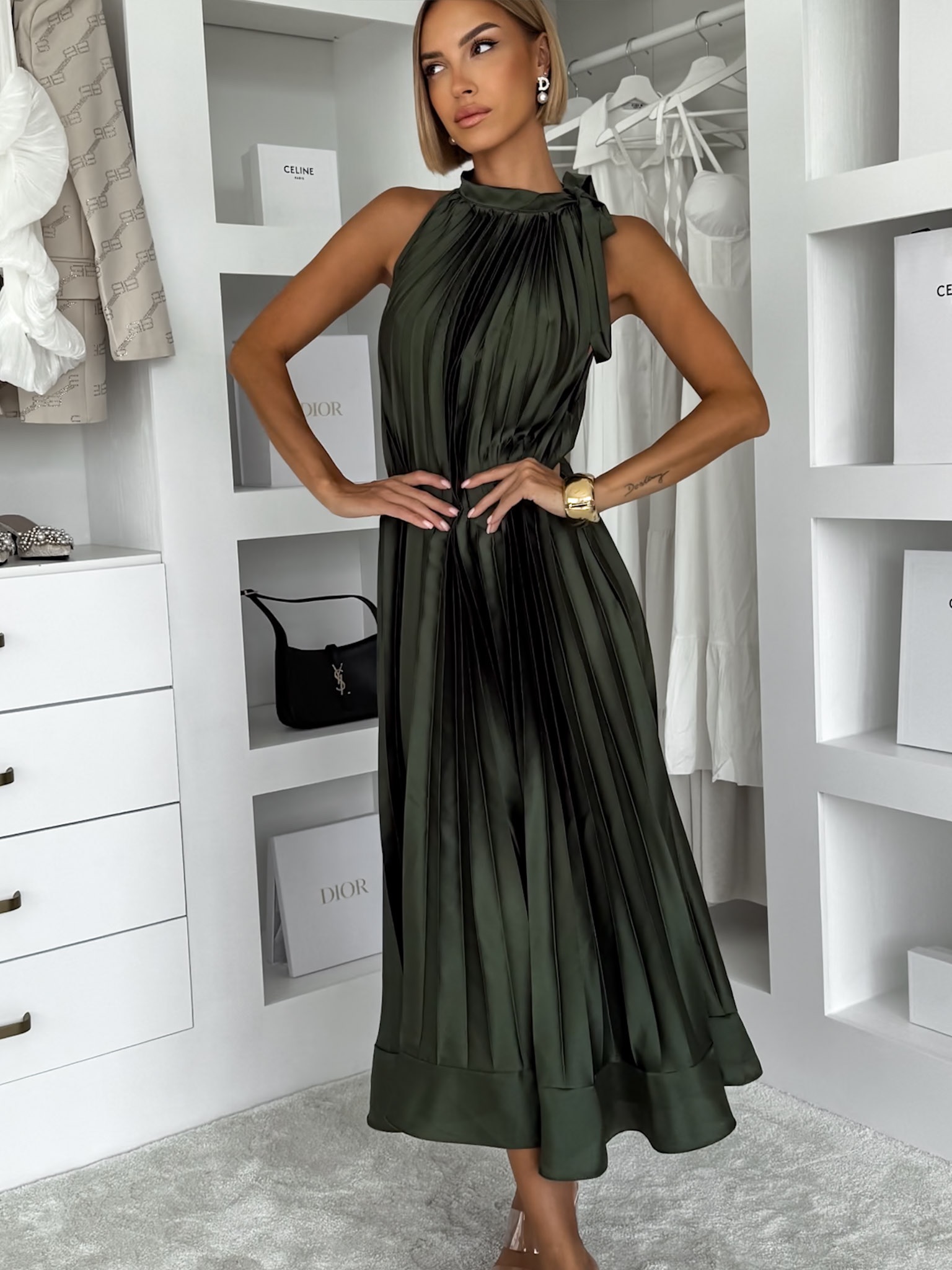 Khaki saténové dlouhé plisované šaty EKULY Velikost: ONESIZE