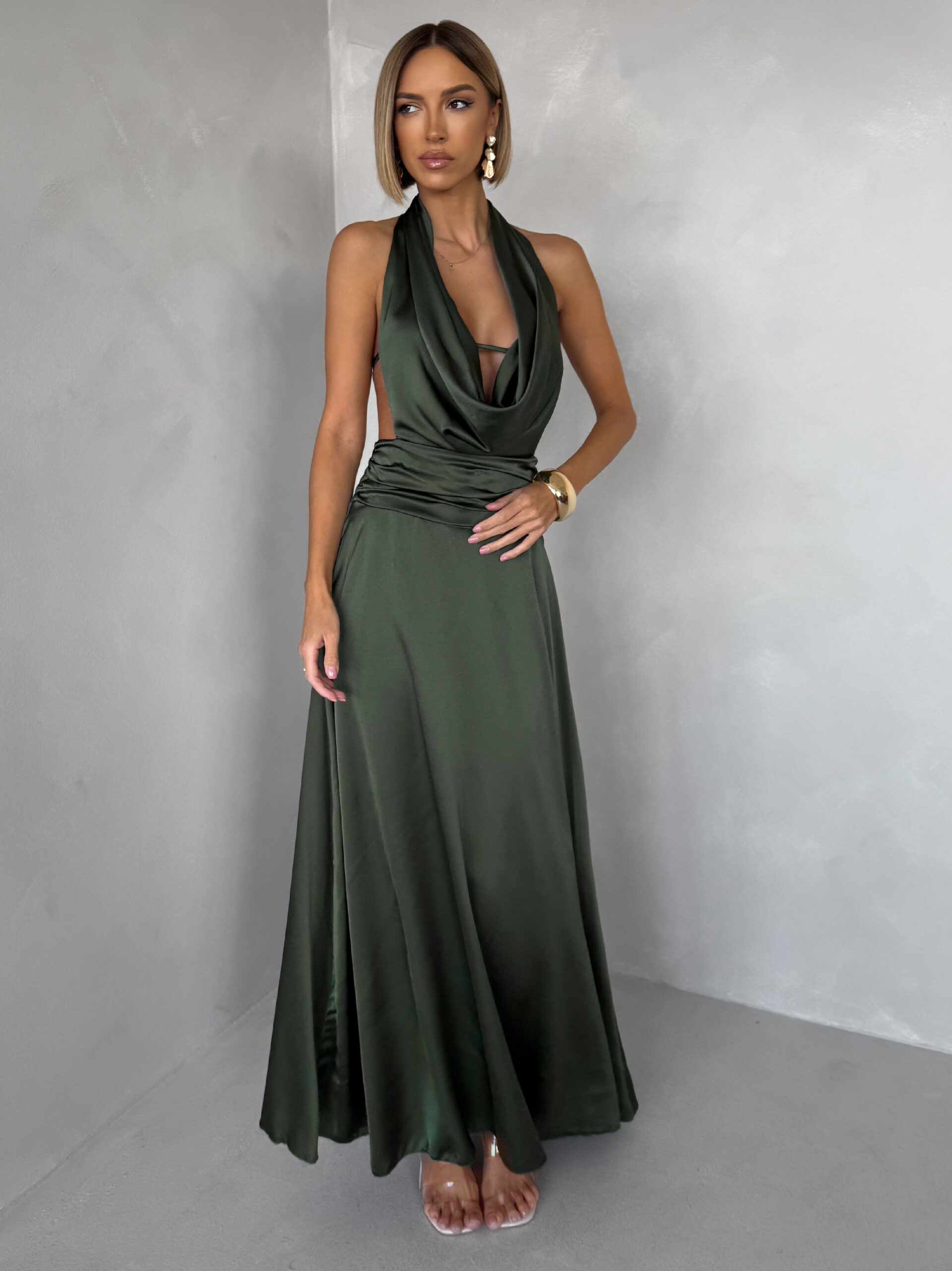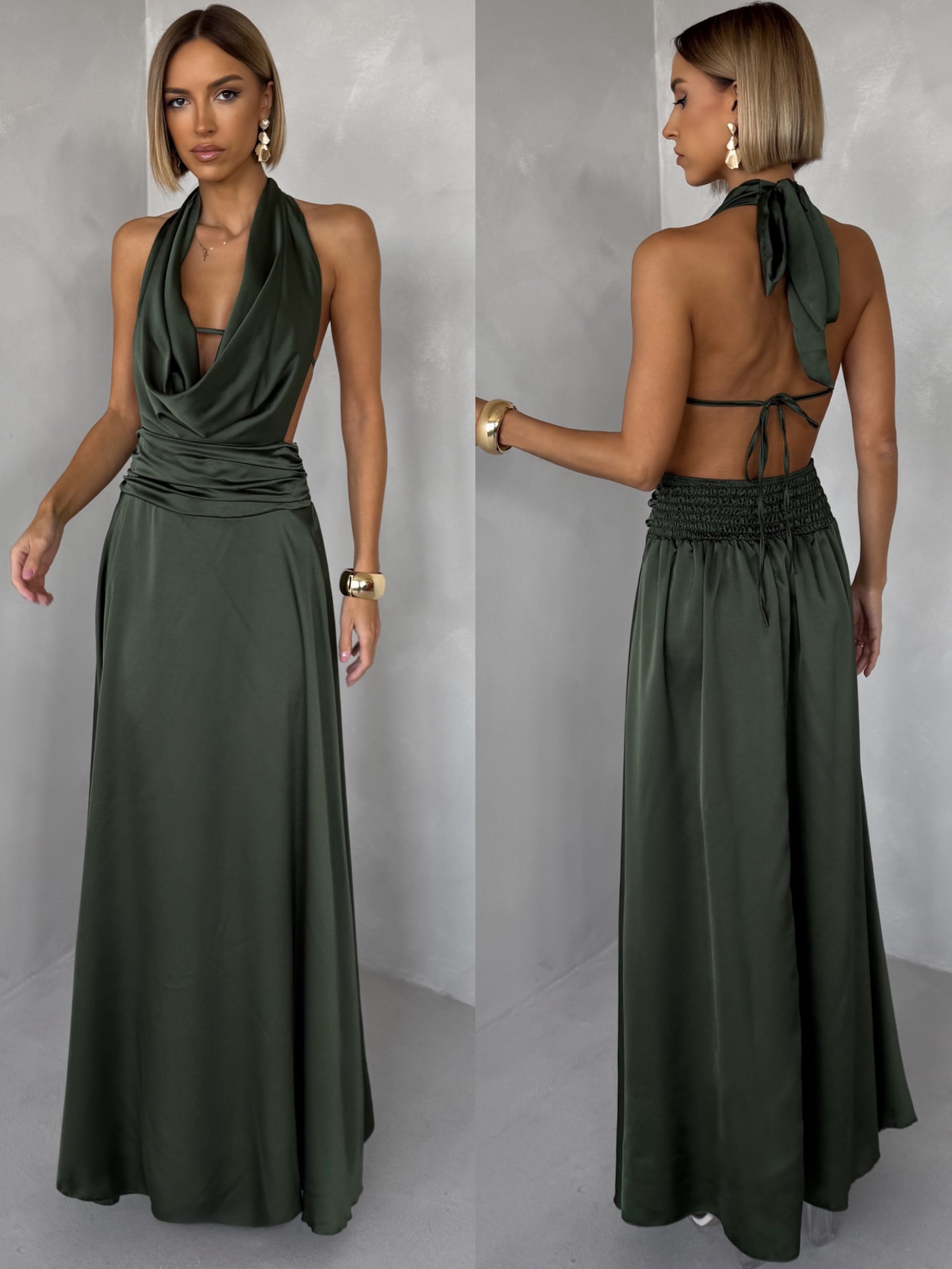 Khaki saténové dlouhé šaty FANDARI s výstřihem Velikost: ONESIZE