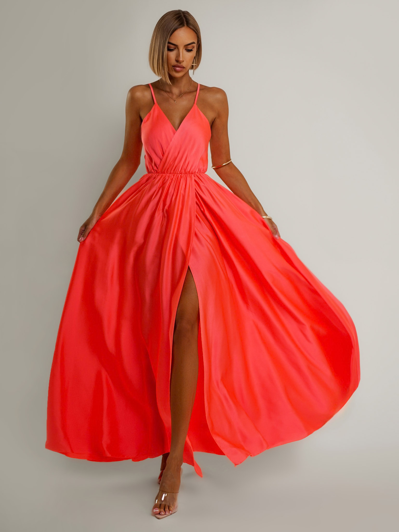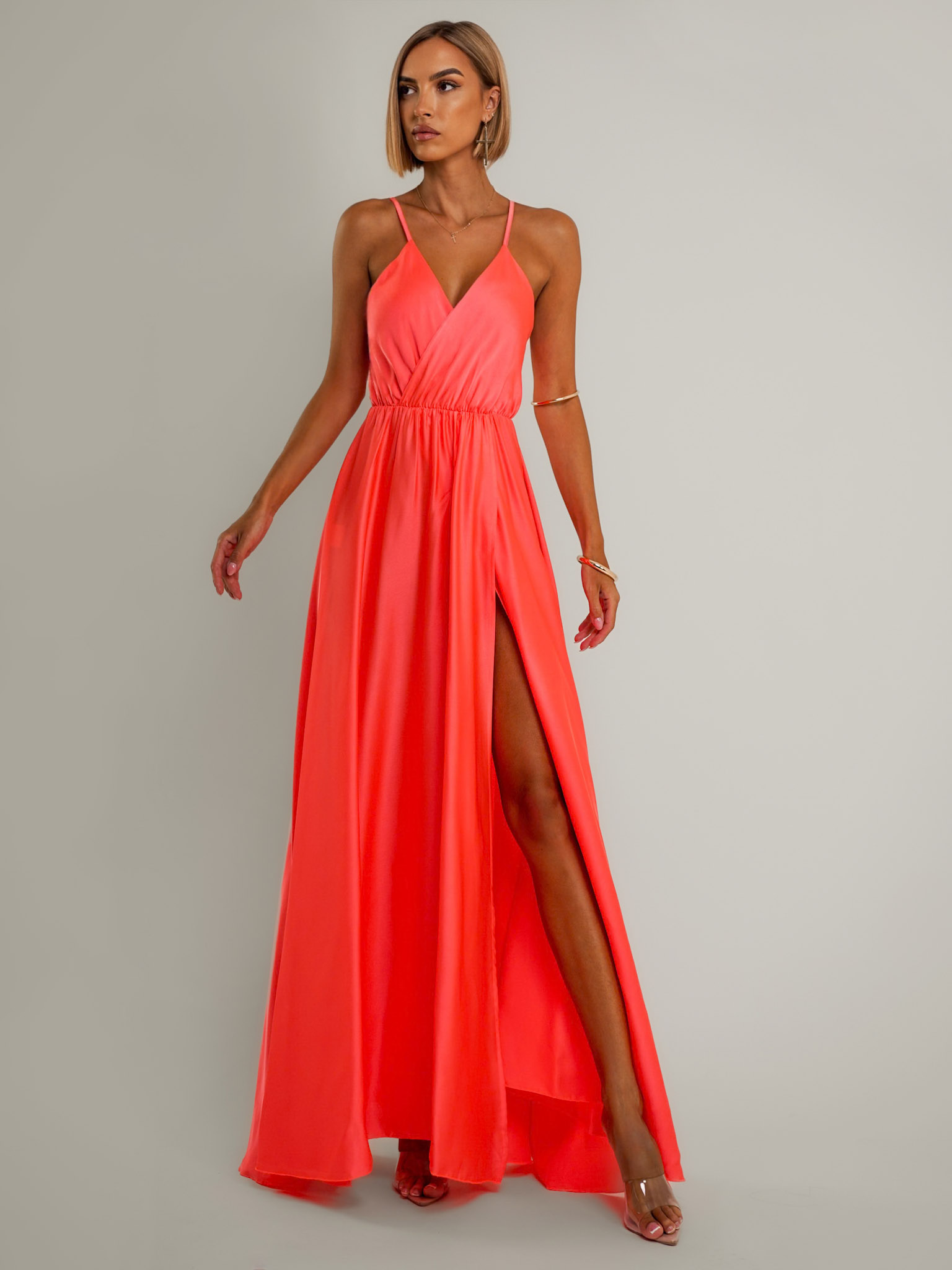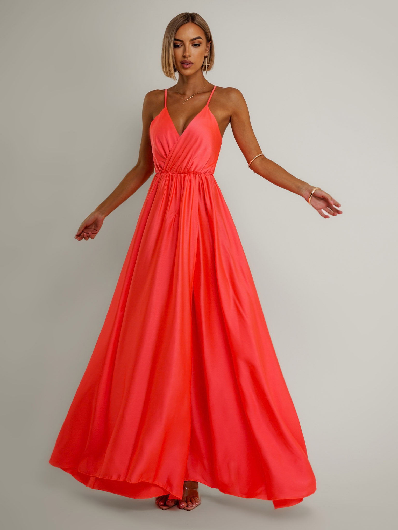 Korálové lesklé dlouhé plesové šaty CHRYSANTHE Velikost: ONESIZE