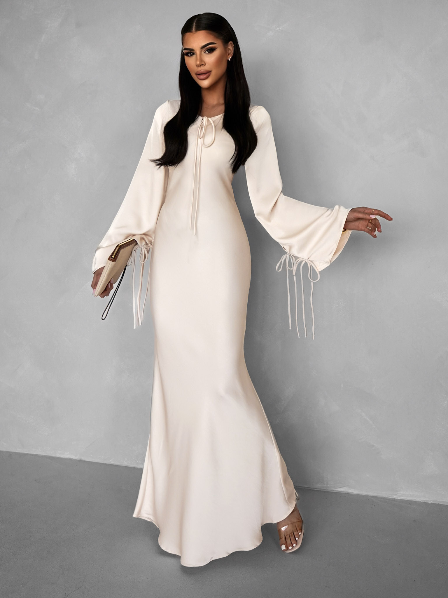 Krémové dlouhé saténové šaty TAGYWA s vázáním Velikost: L