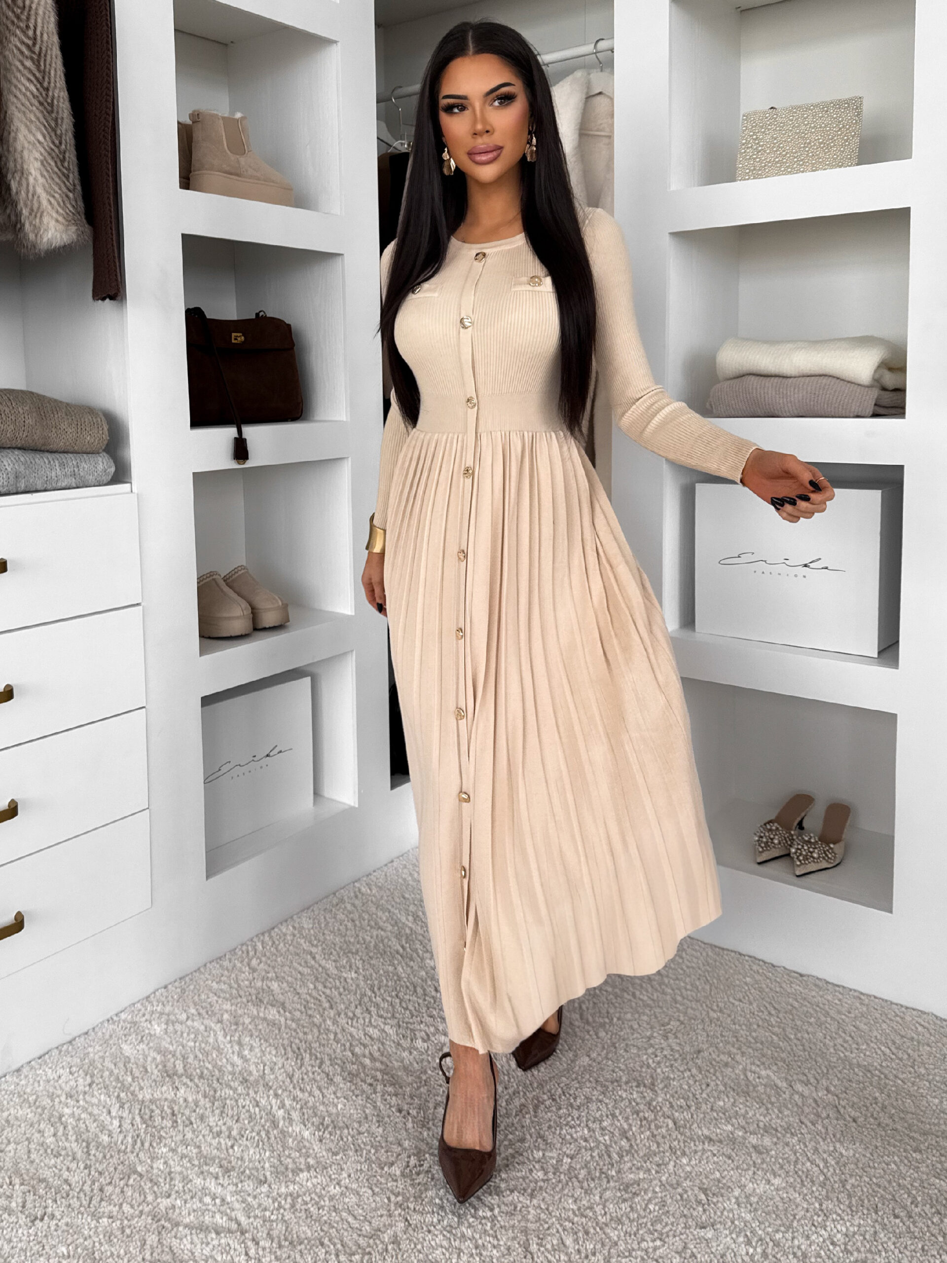 Krémové dlouhé šaty TYMORAE s dlouhým rukávem Velikost: M/L