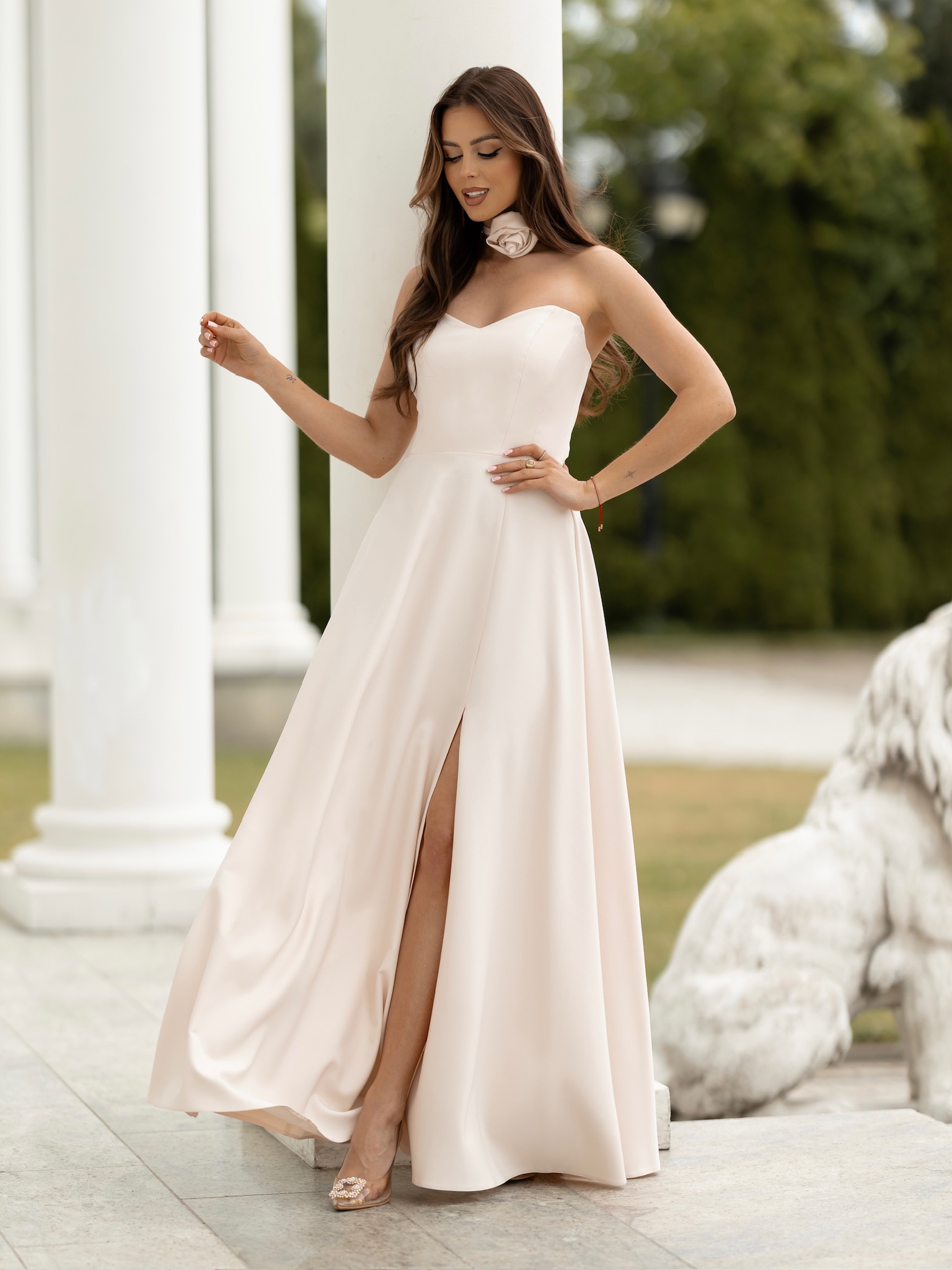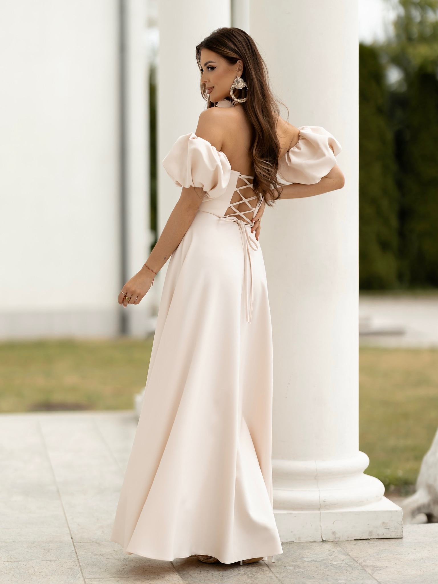 Krémové elegantní luxusní dlouhé šaty LAVIRA s rukávky Velikost: M