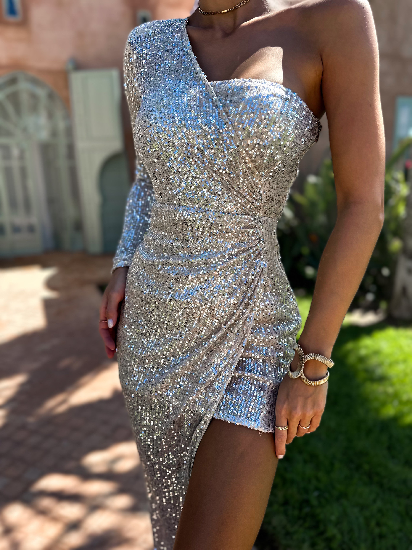 Krémové třpytivé asymetrické šaty ANASEN s flitry Velikost: S
