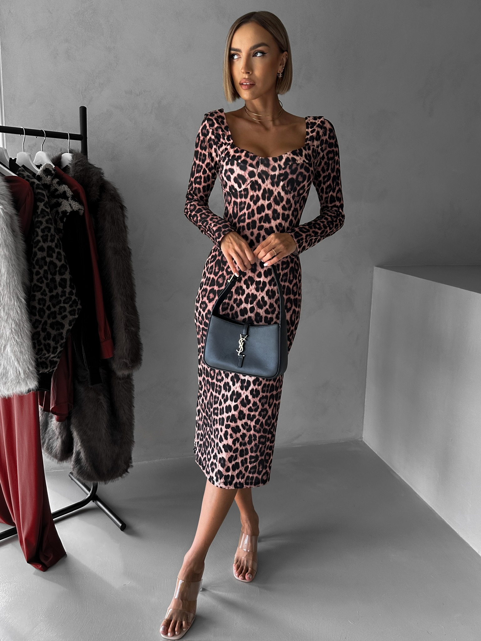 Leopardí vypasované šaty KOTILDA s dlouhým rukávem Velikost: ONESIZE