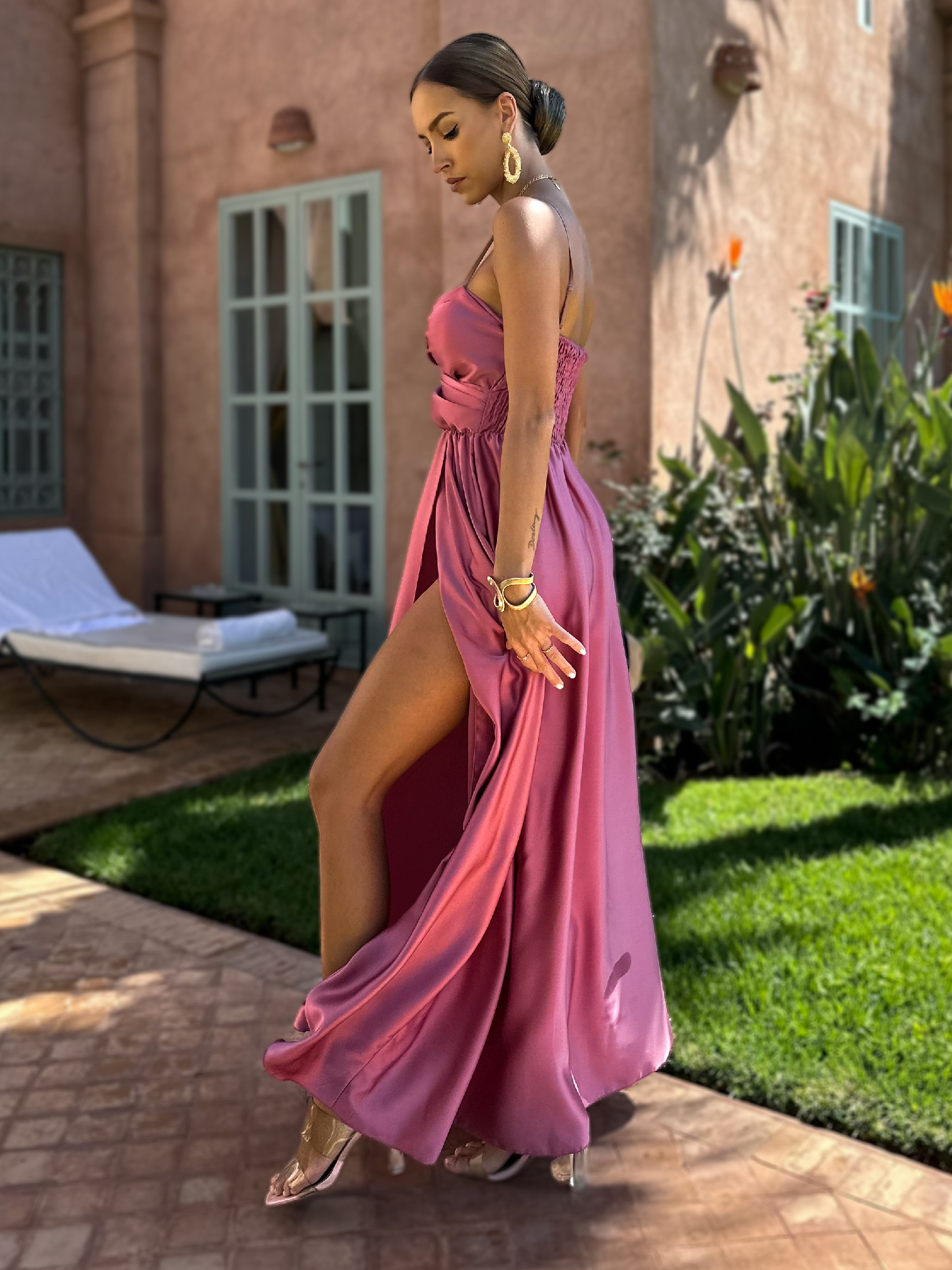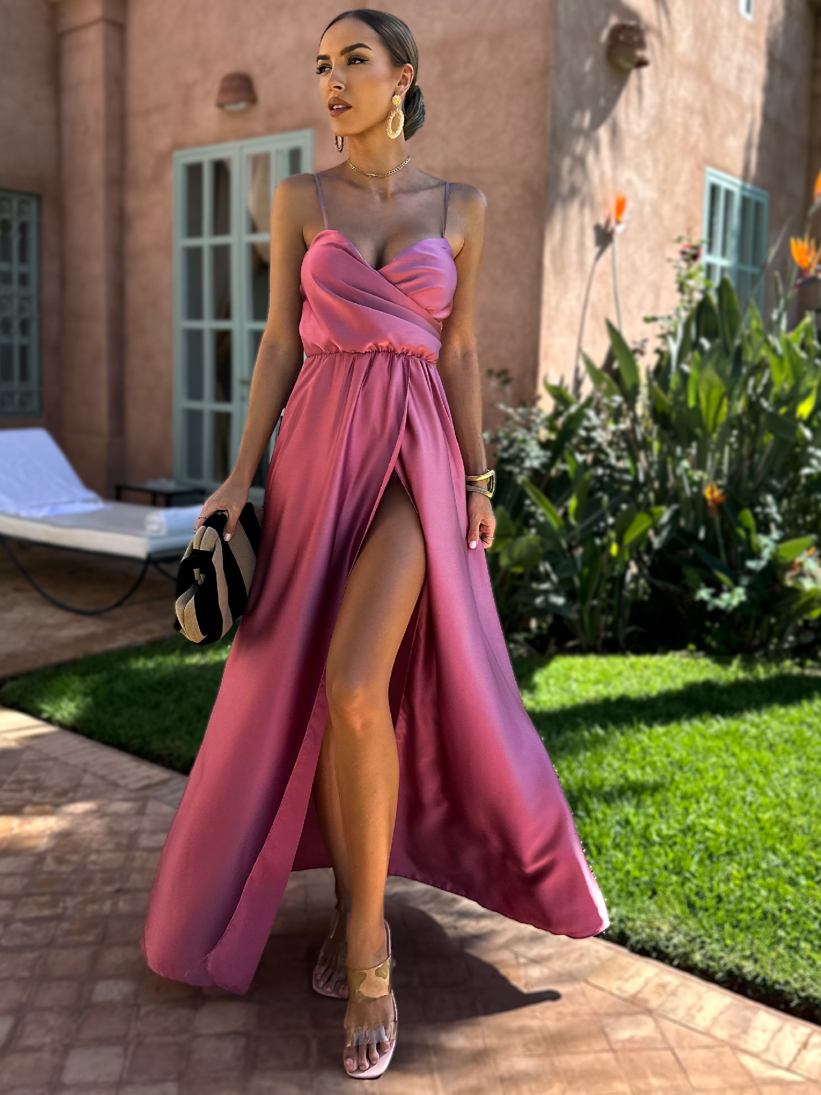 Malinové dlouhé saténové společenské šaty PATILLA s rozparkem