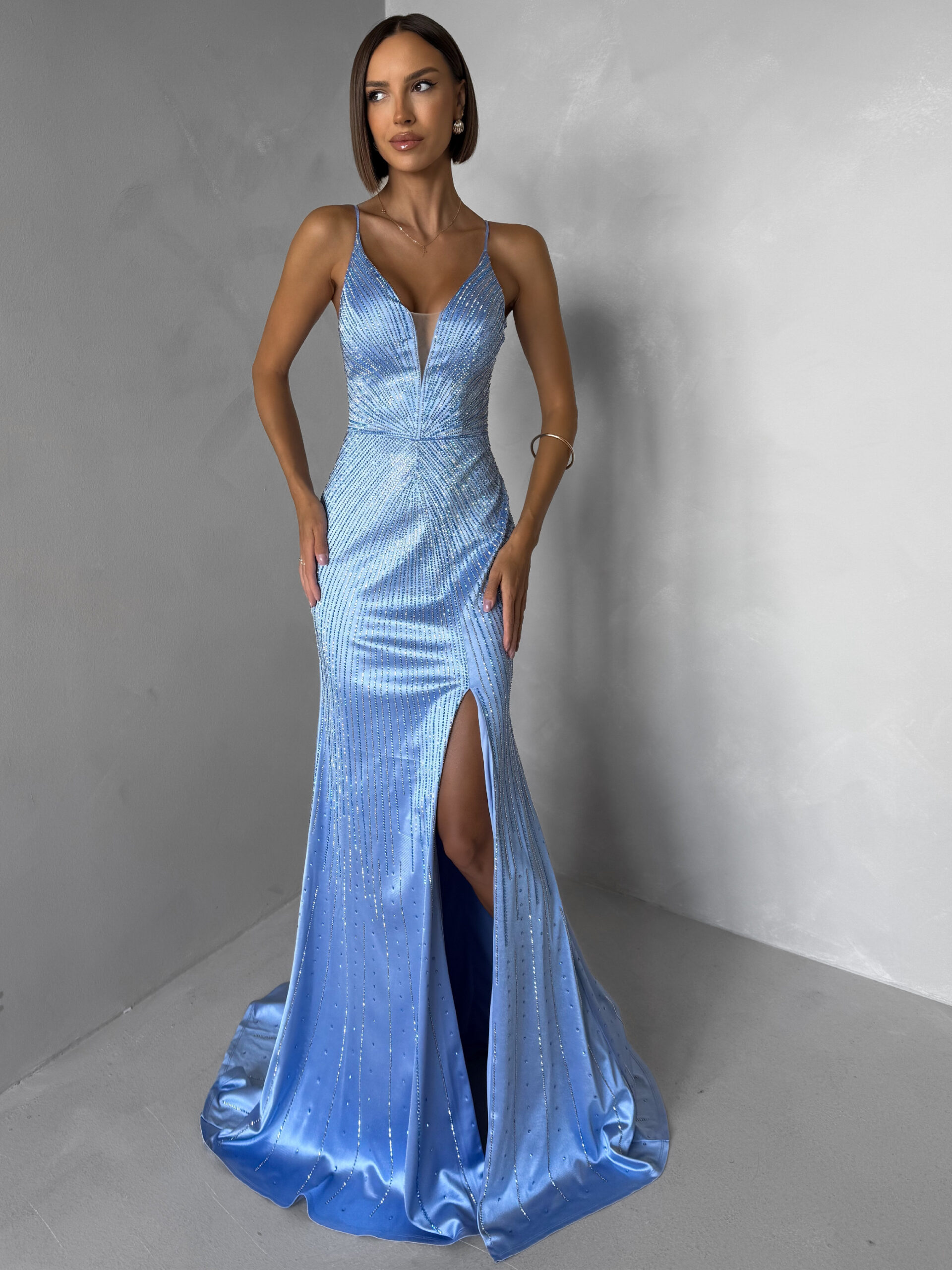 Modré plesové dlouhé třpytivé šaty RAVELLE s rozparkem Velikost: M