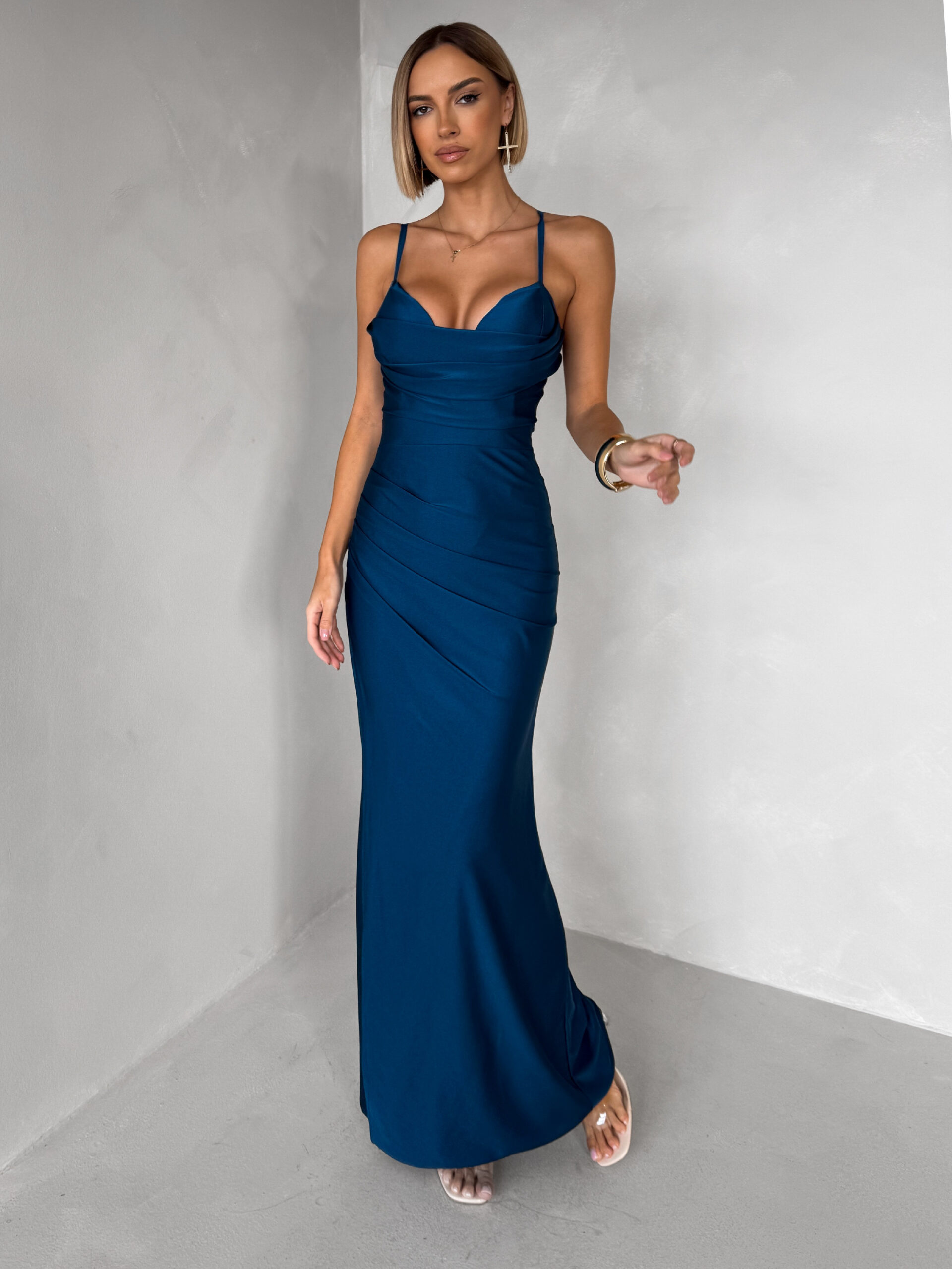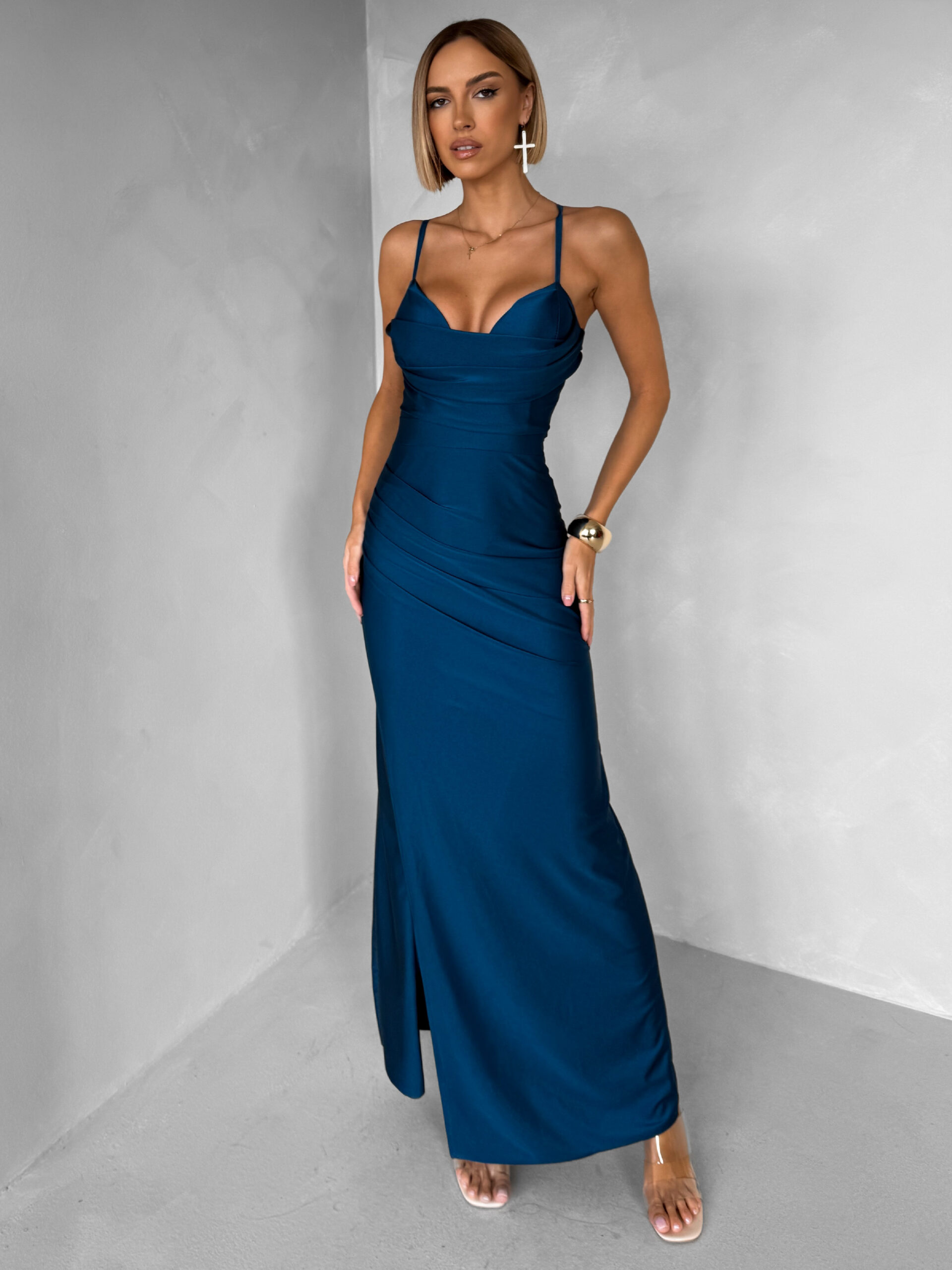 Petrolejová dlouhé saténové společenské šaty ORIXY s výstřihem Velikost: ONESIZE