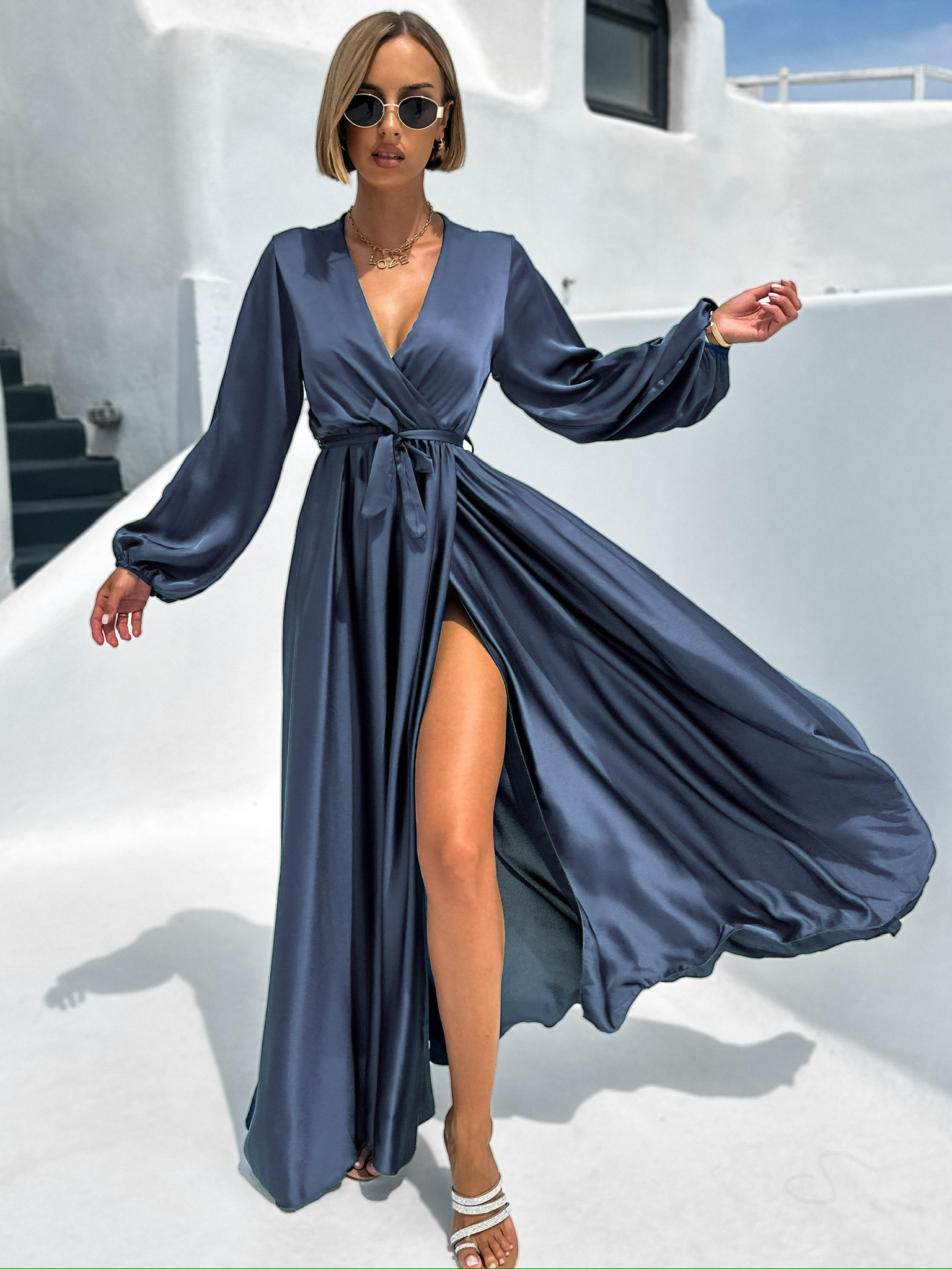 Elegantní saténové maxi šaty, které okouzlí svou lehkostí a ženskostí. Hladký lesklý materiál jemně splývá po postavě a vytváří luxusní efekt při každém kroku. Zavazování v pase krásně zvýrazní siluetu a dodá modelu sofistikovaný nádech. Výrazný rozparek na sukni působí svůdně a zároveň zajišťuje maximální pohodlí a volnost pohybu. Perfektní volba pro společenské události, večírky či slavnostní příležitosti.