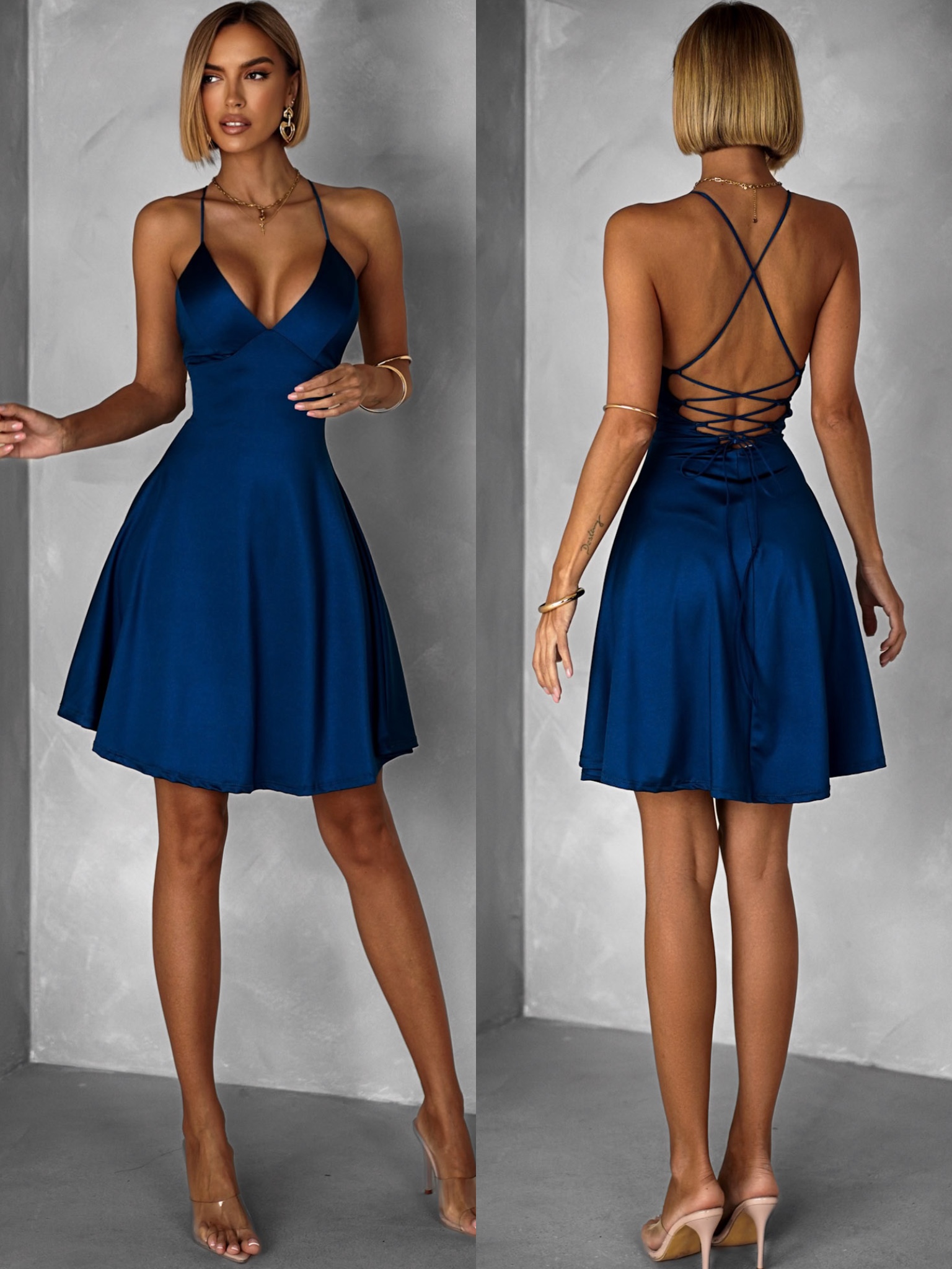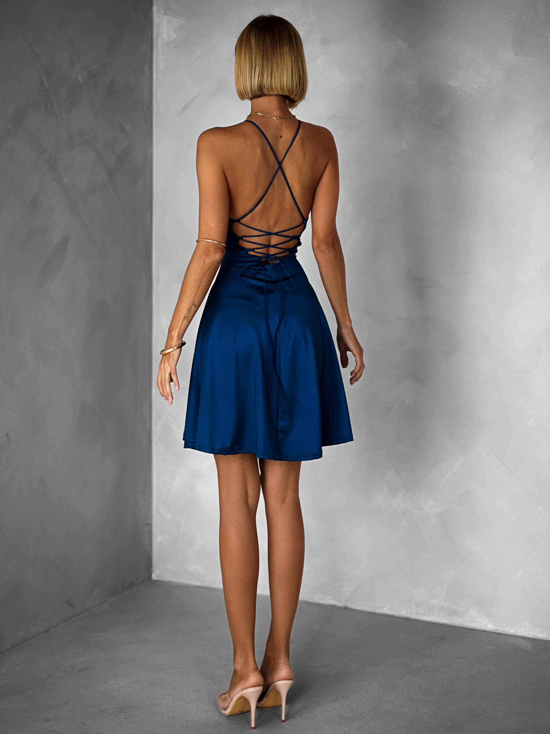 Petrolejové krátké áčkové saténové šaty KALLE Velikost: ONESIZE