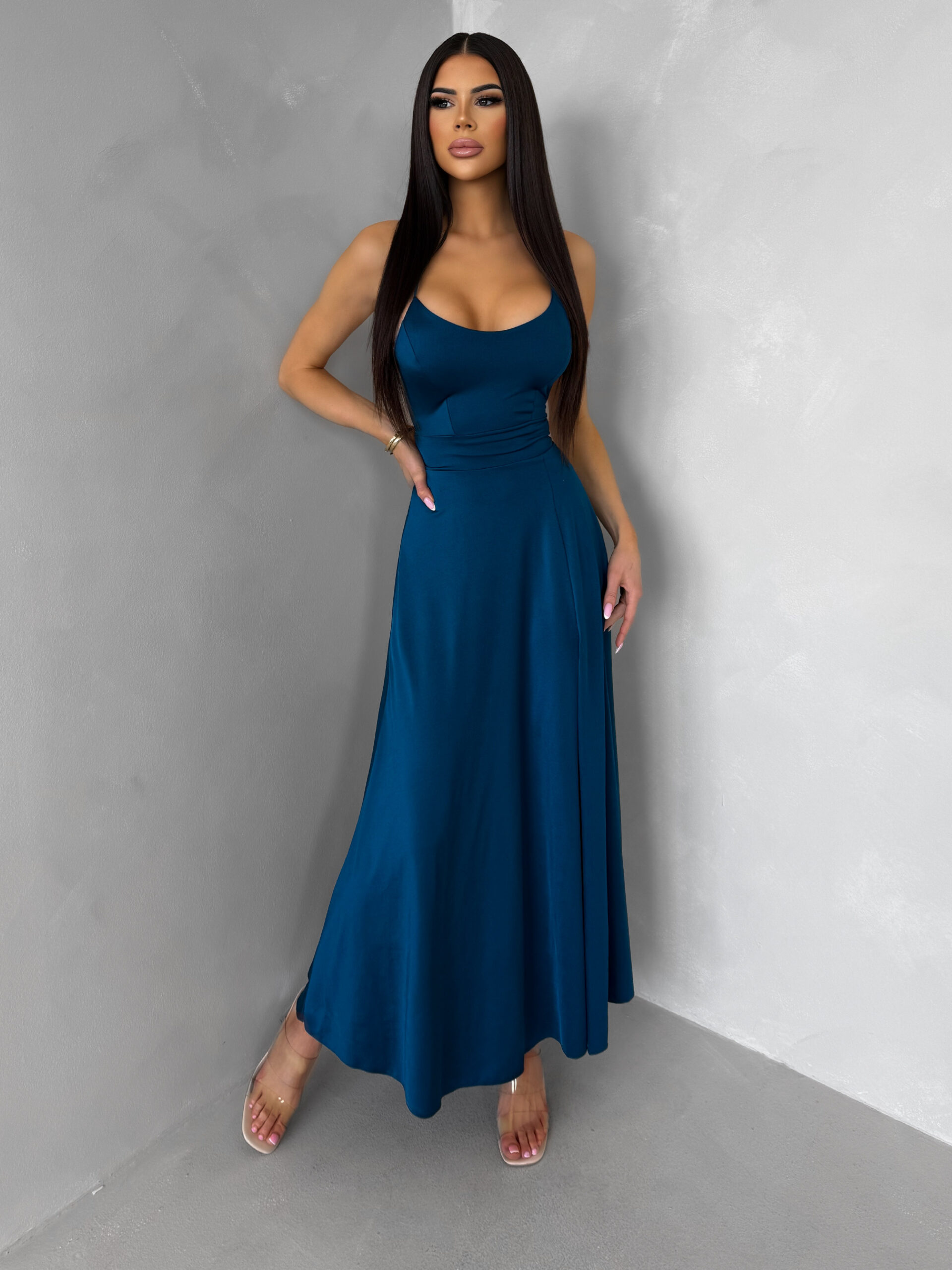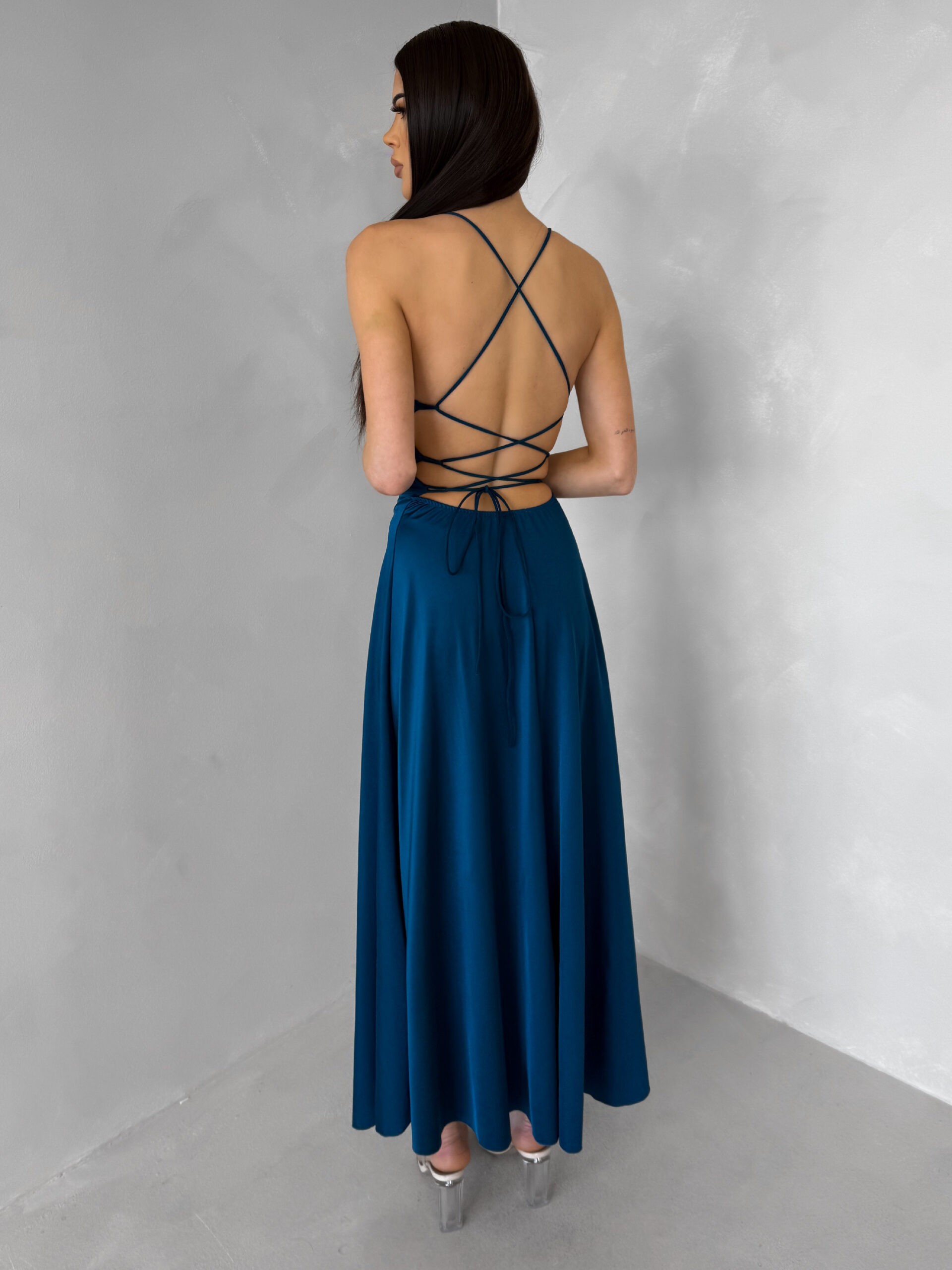 Petrolejové saténové elegantní midi šaty SIMUEL se šněrováním Velikost: ONESIZE