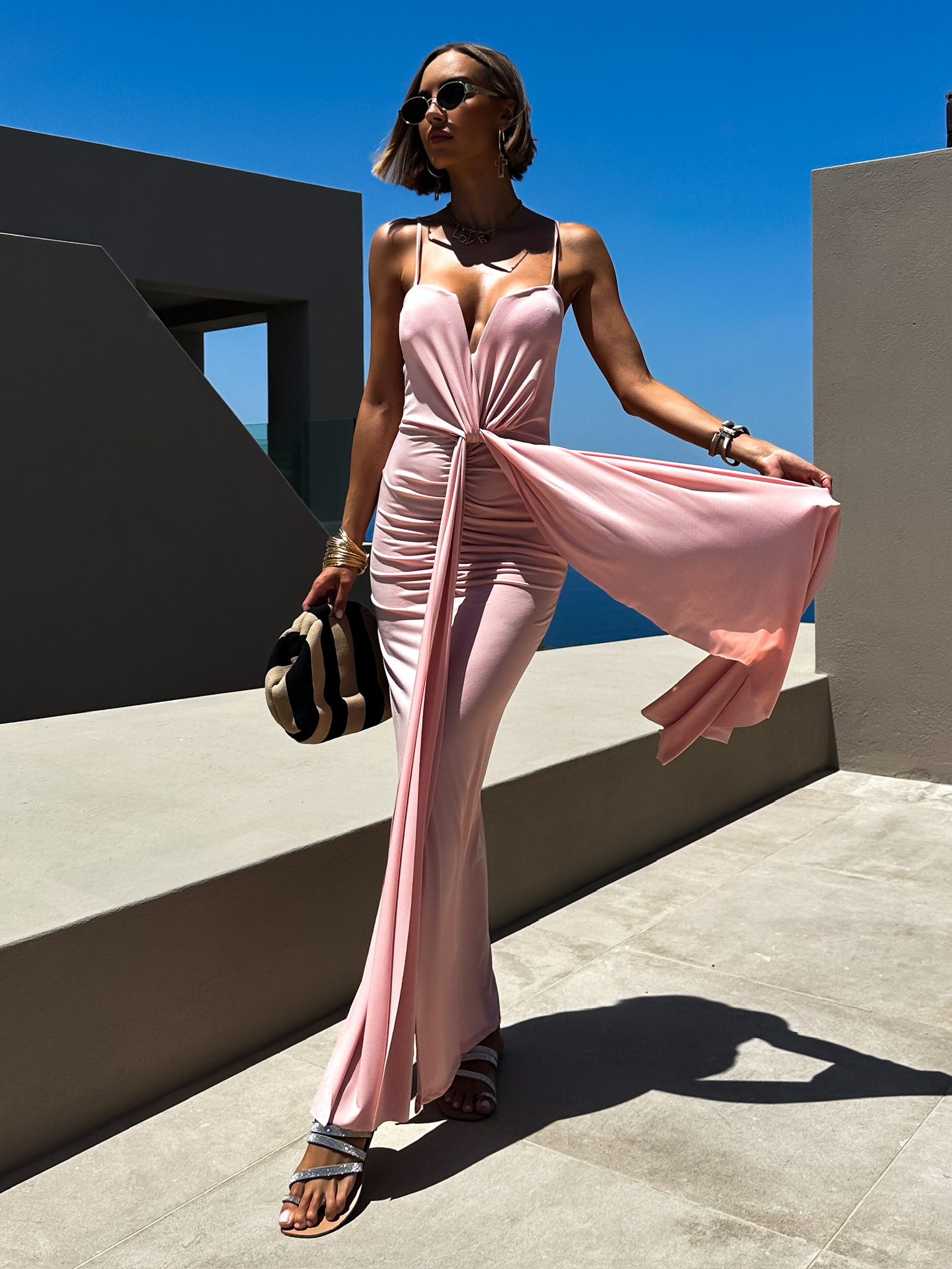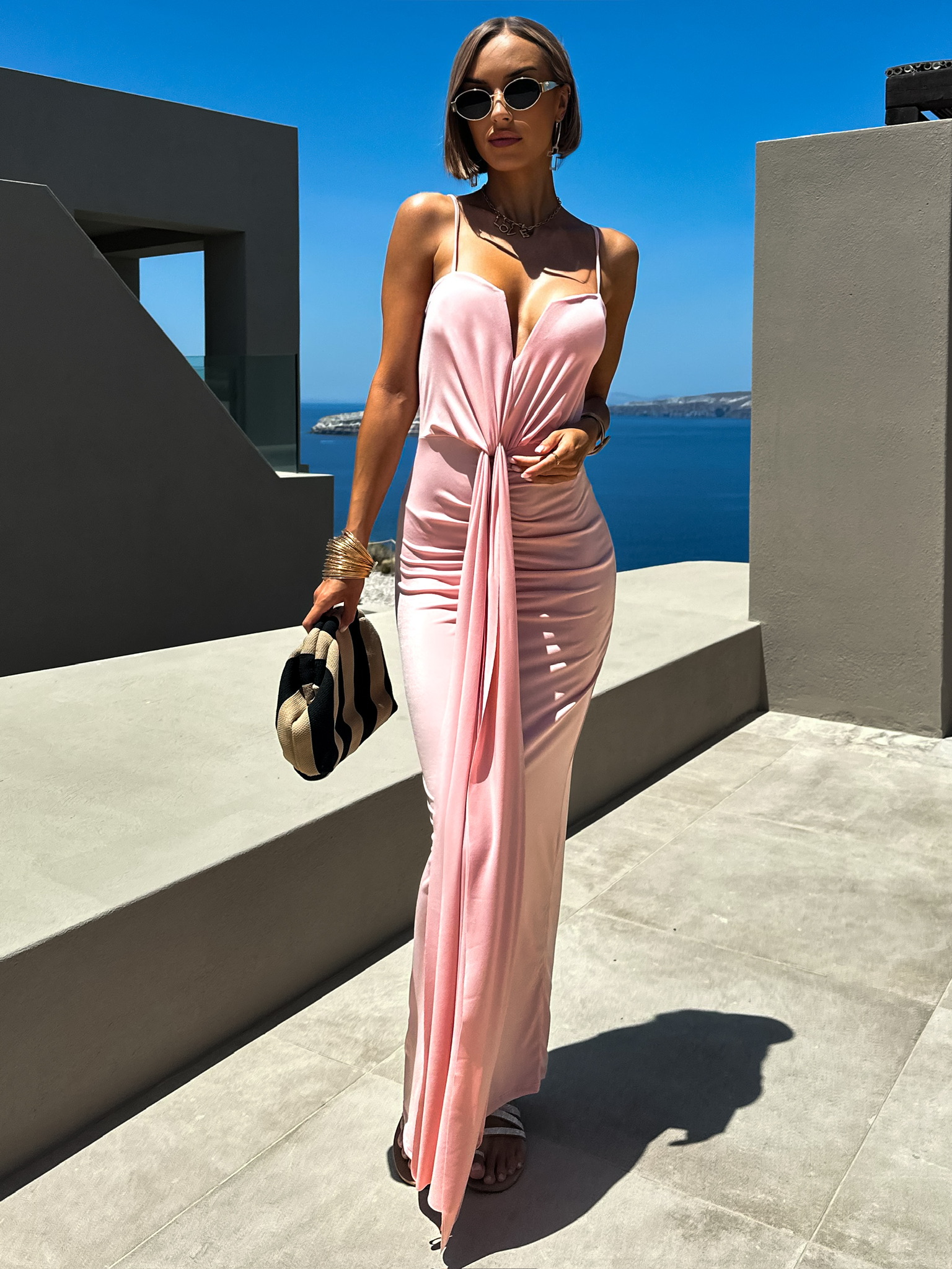 Růžové dlouhé elegantní šaty DIMIS s výstřihem Velikost: ONESIZE
