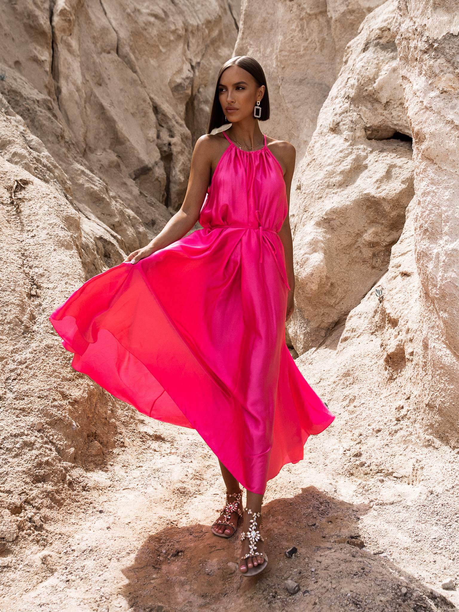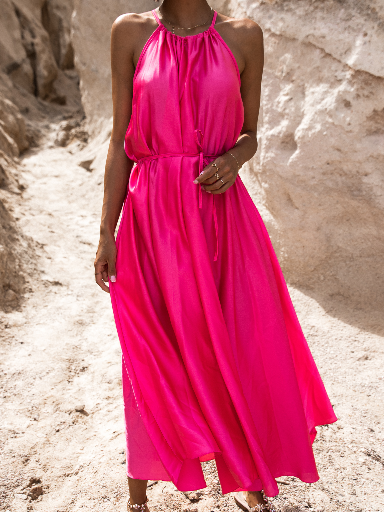 Růžové dlouhé lesklé elegantní šaty MADES se zavazováním