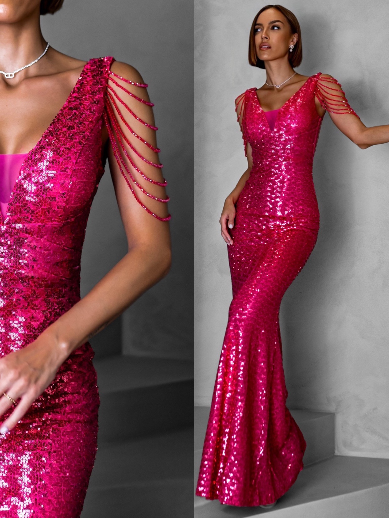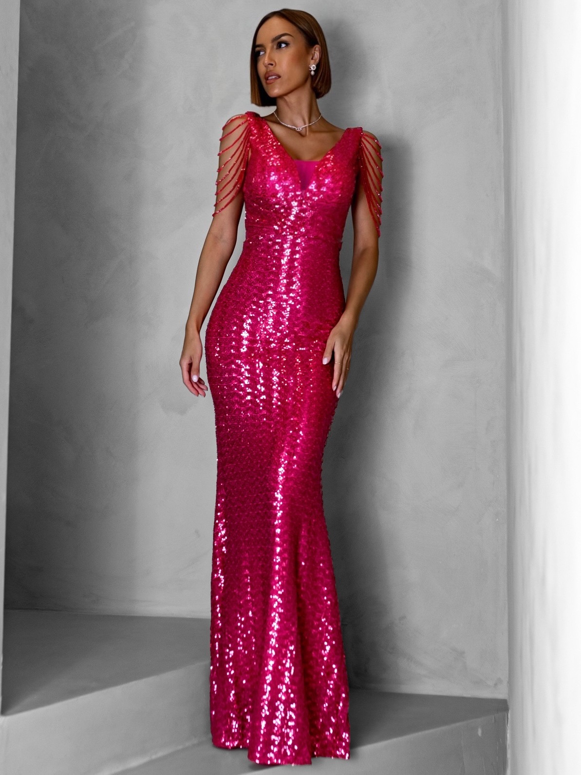 Růžové dlouhé plesové třpytivé šaty KARMA s flitry Velikost: L
