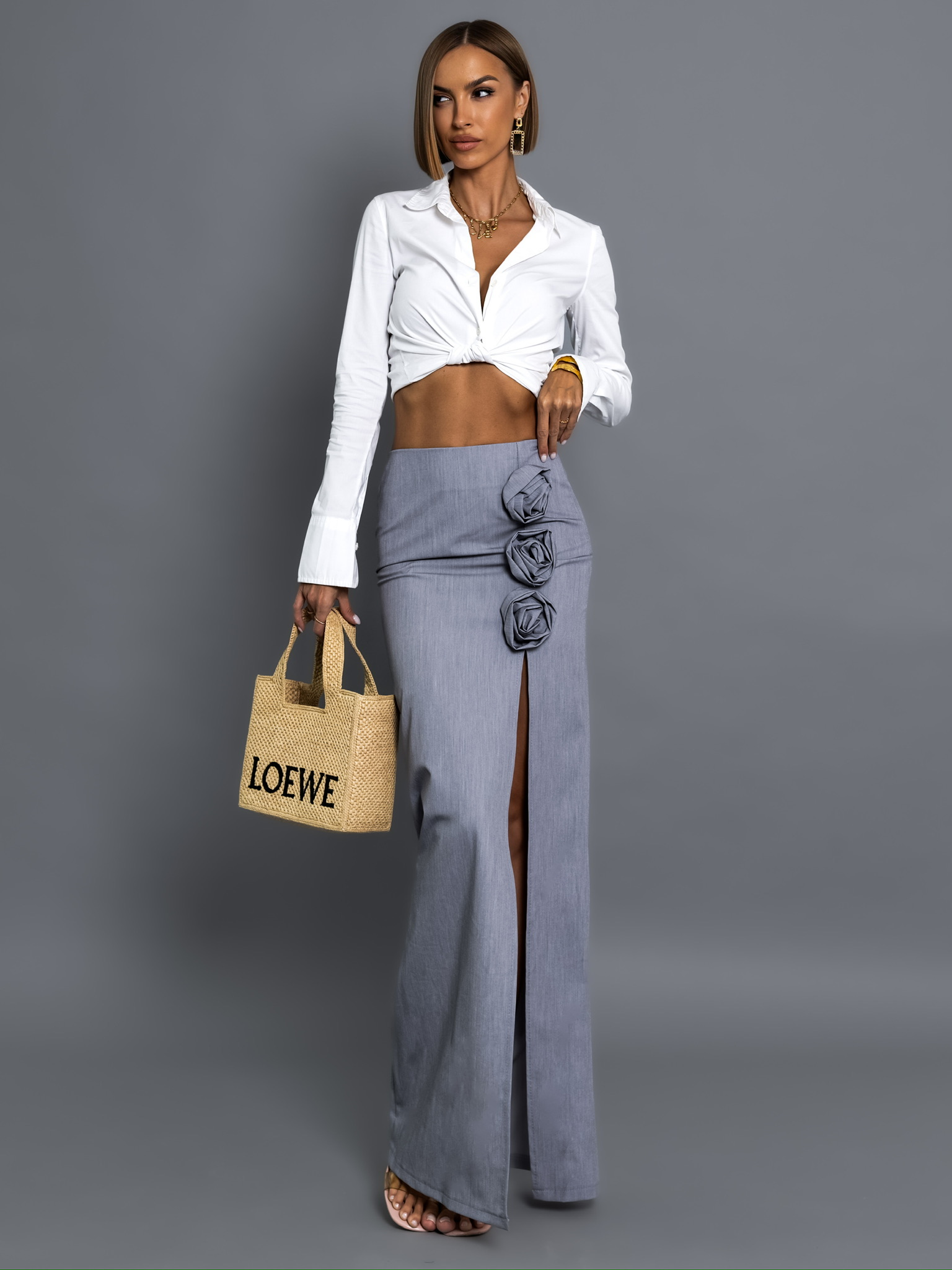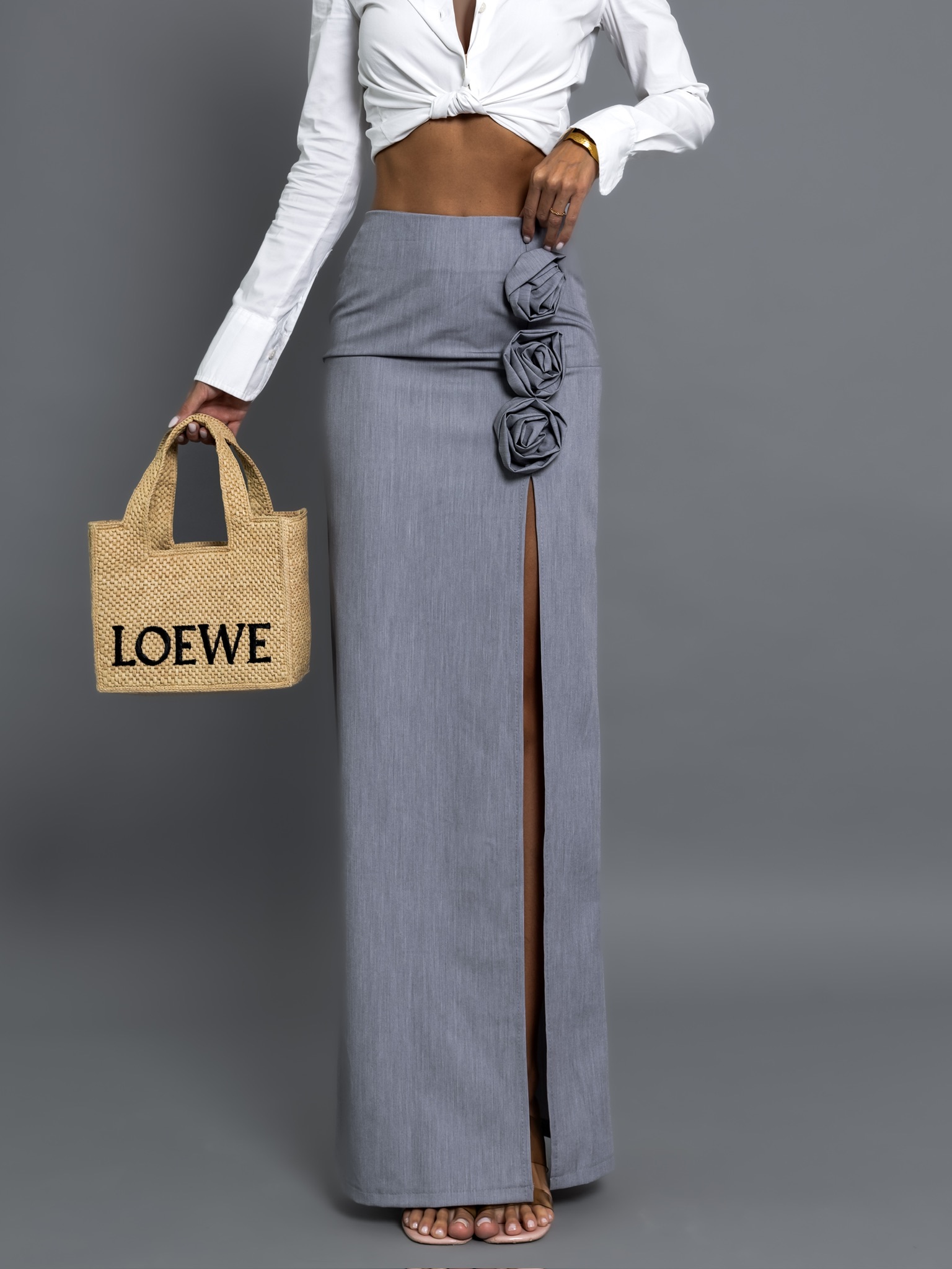 Šedá dlouhá sukně ELOTE s květinami a rozparkem Velikost: ONESIZE