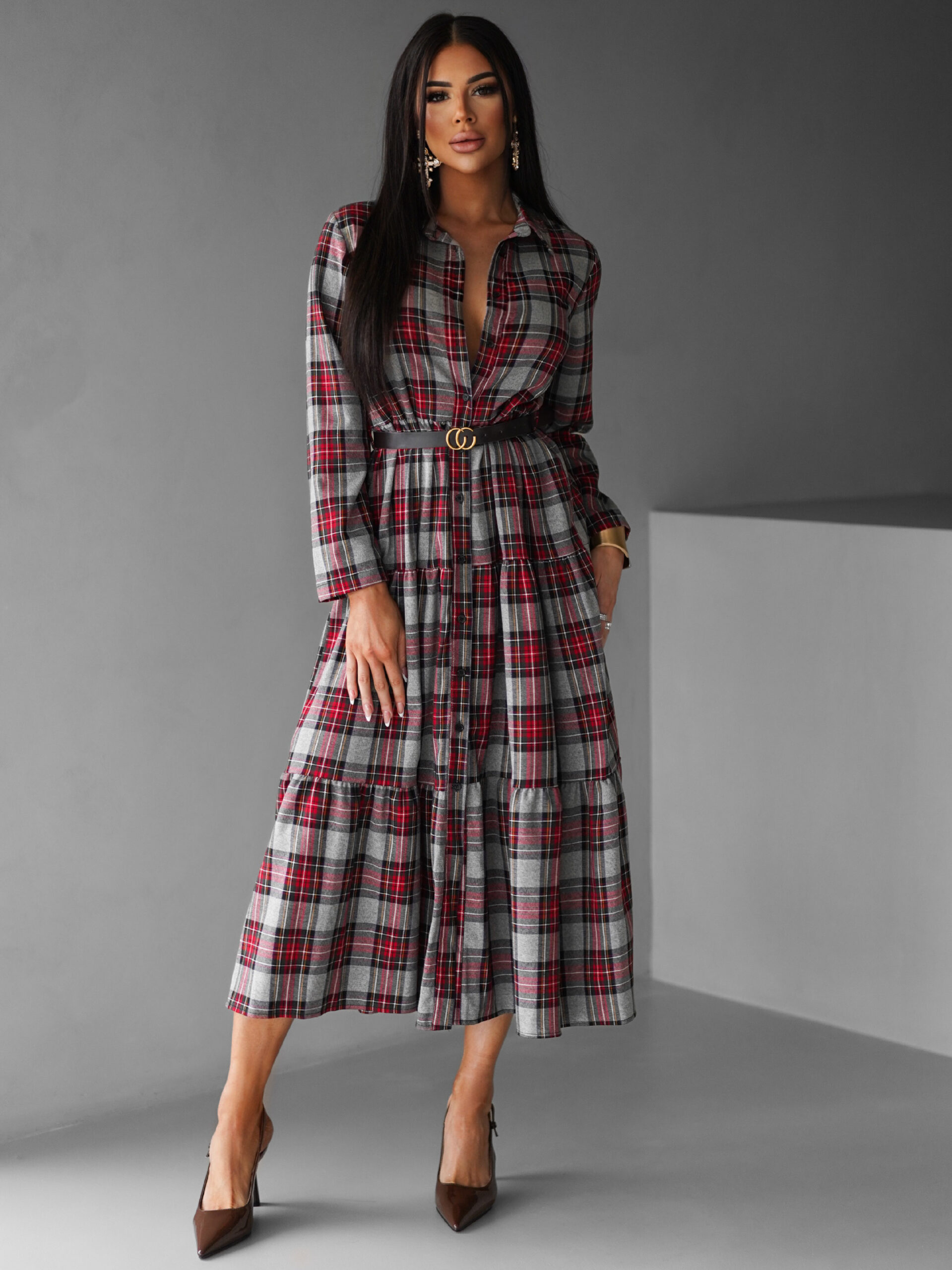 Šedočervené bavlněné košilové šaty BARRYS s páskem Velikost: ONESIZE
