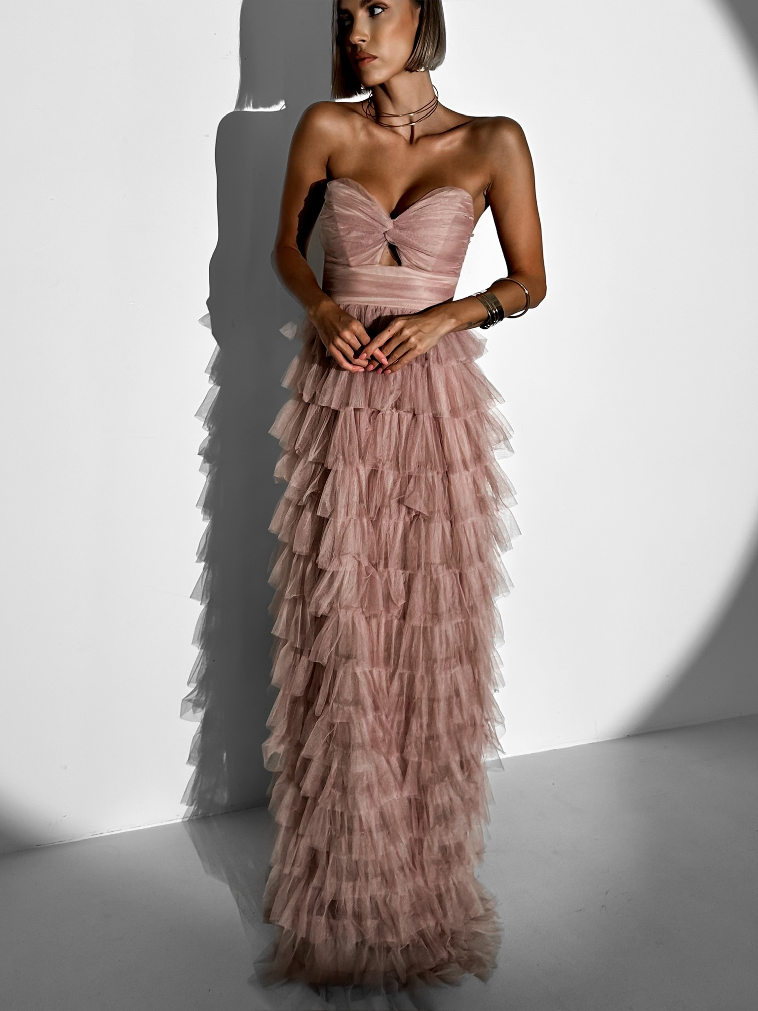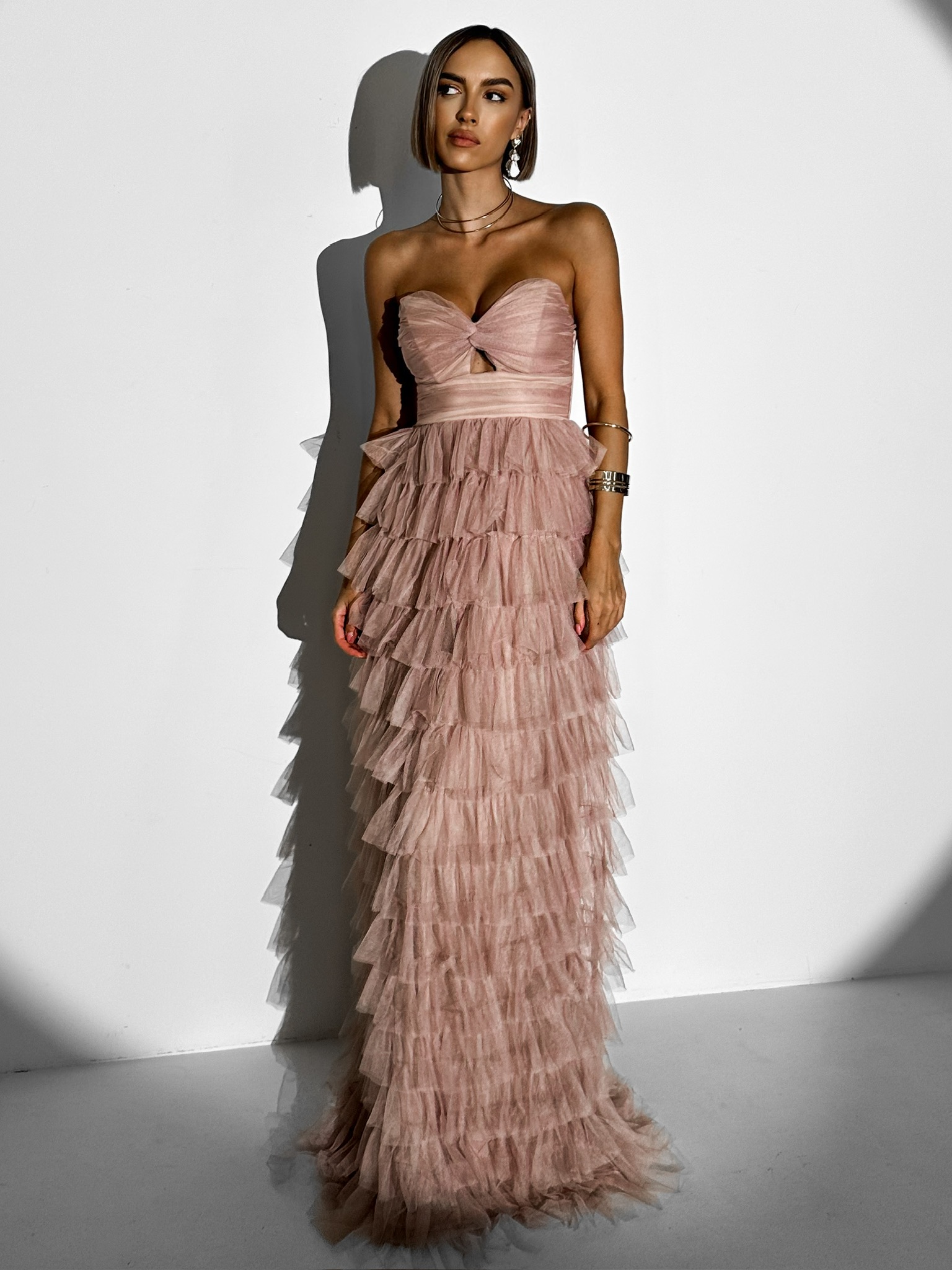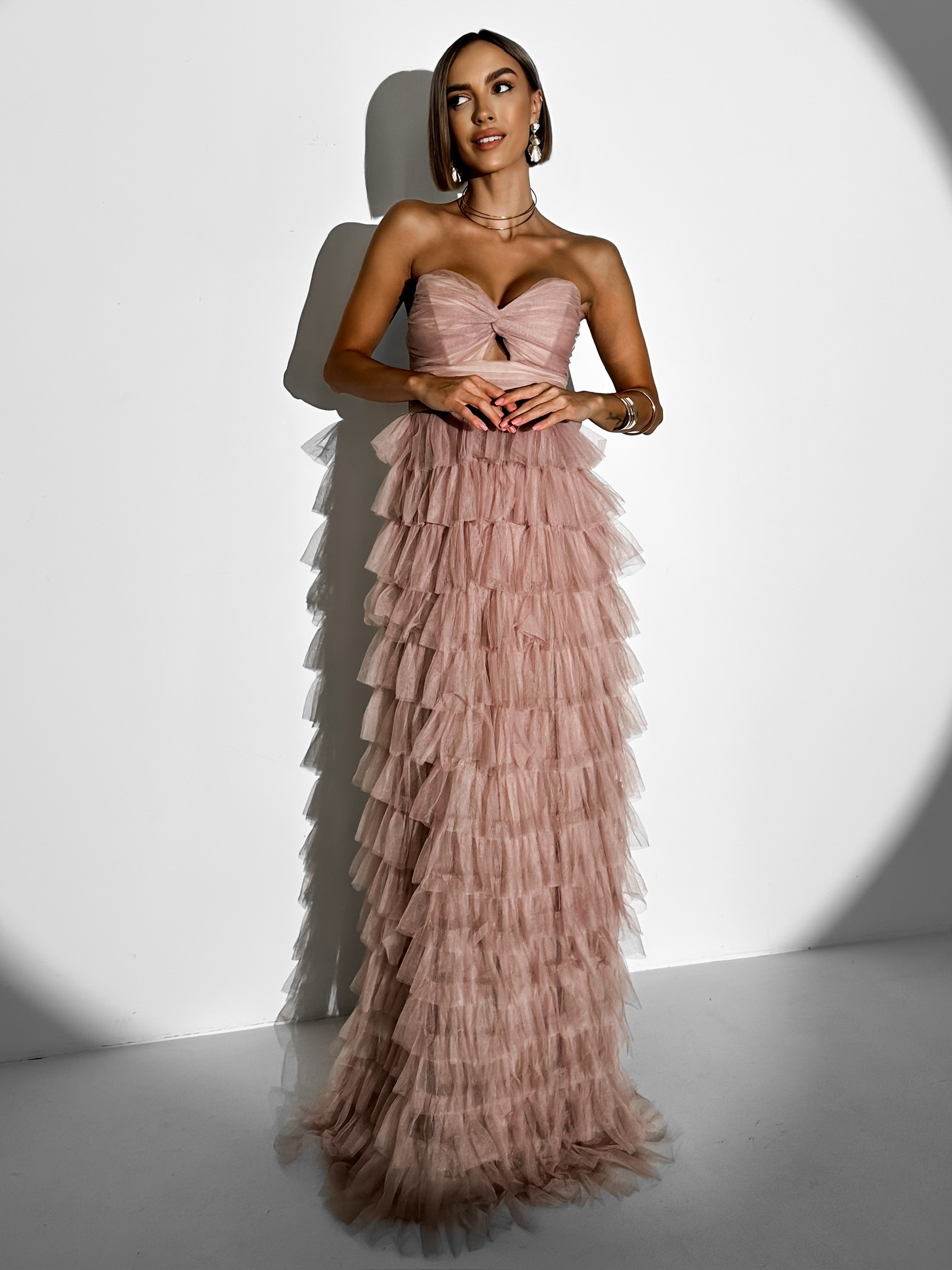 Starorůžové plesové tylové šaty BRUNHIL s volánky Velikost: M