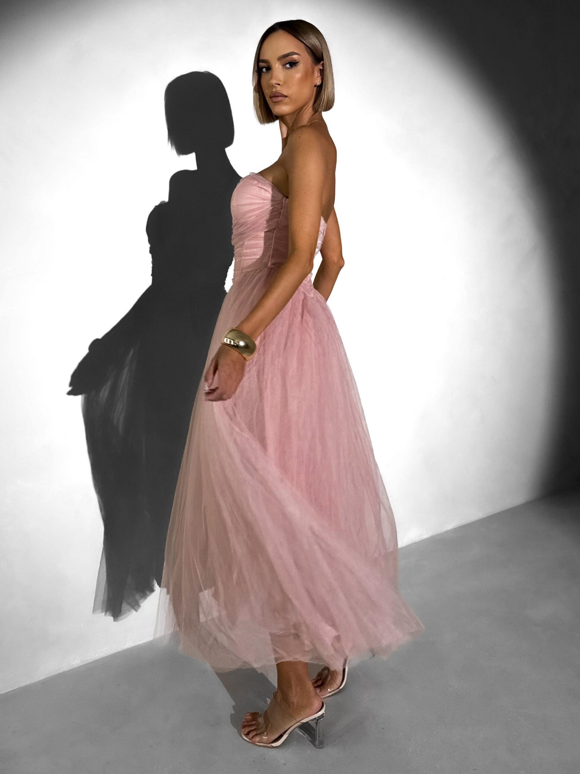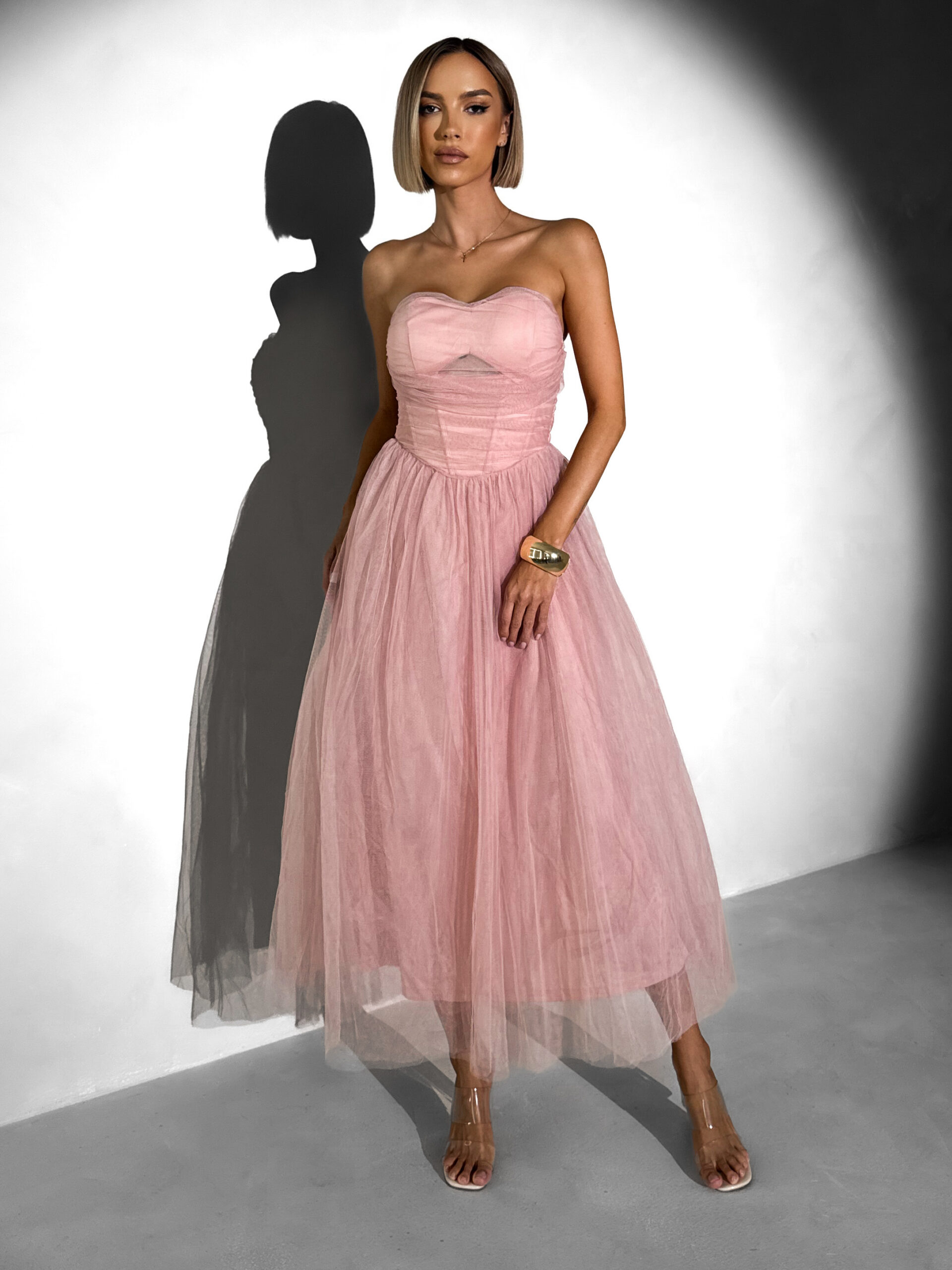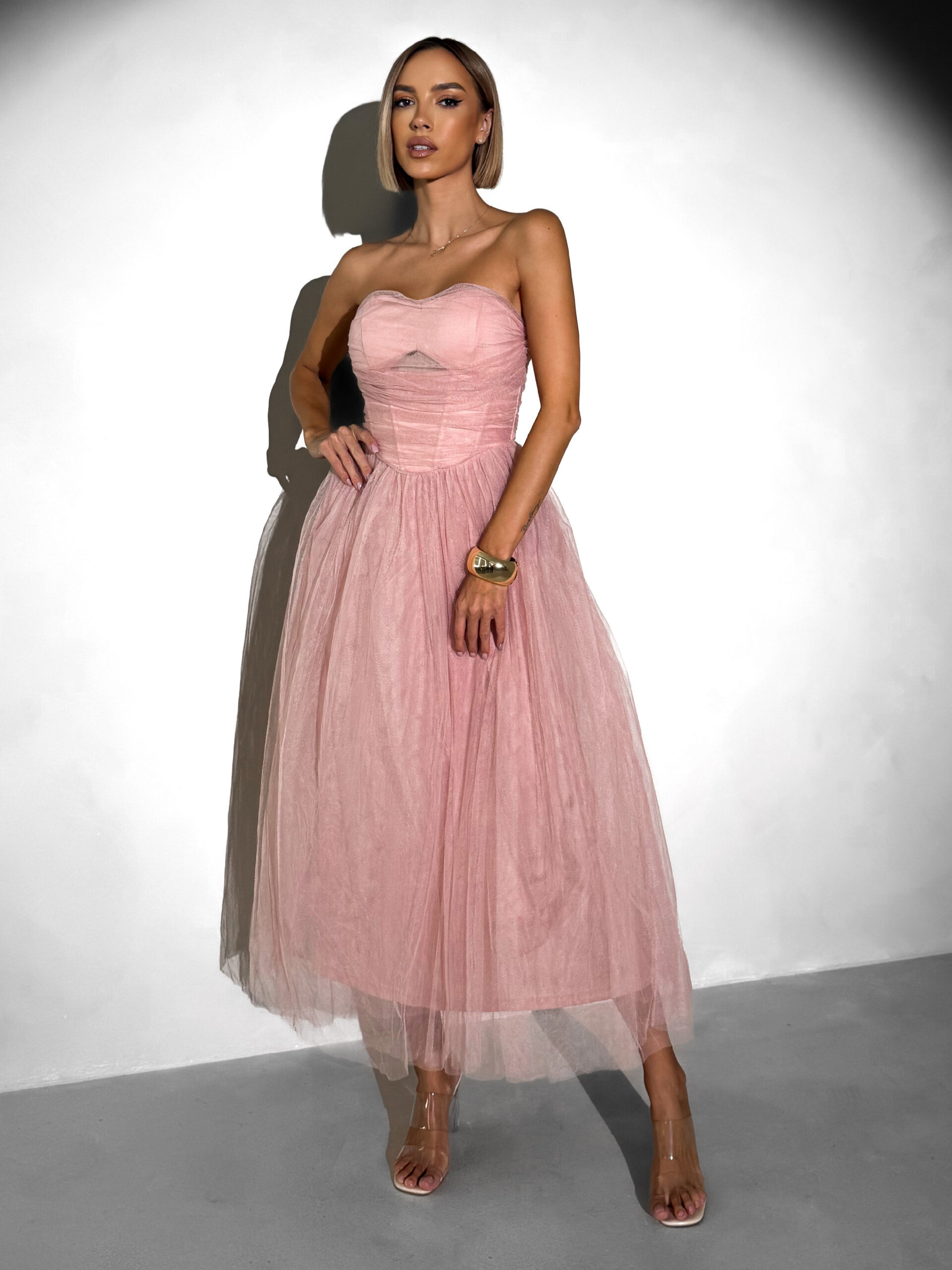 Starorůžové společenské tylové midi šaty SOLAVIE Velikost: S