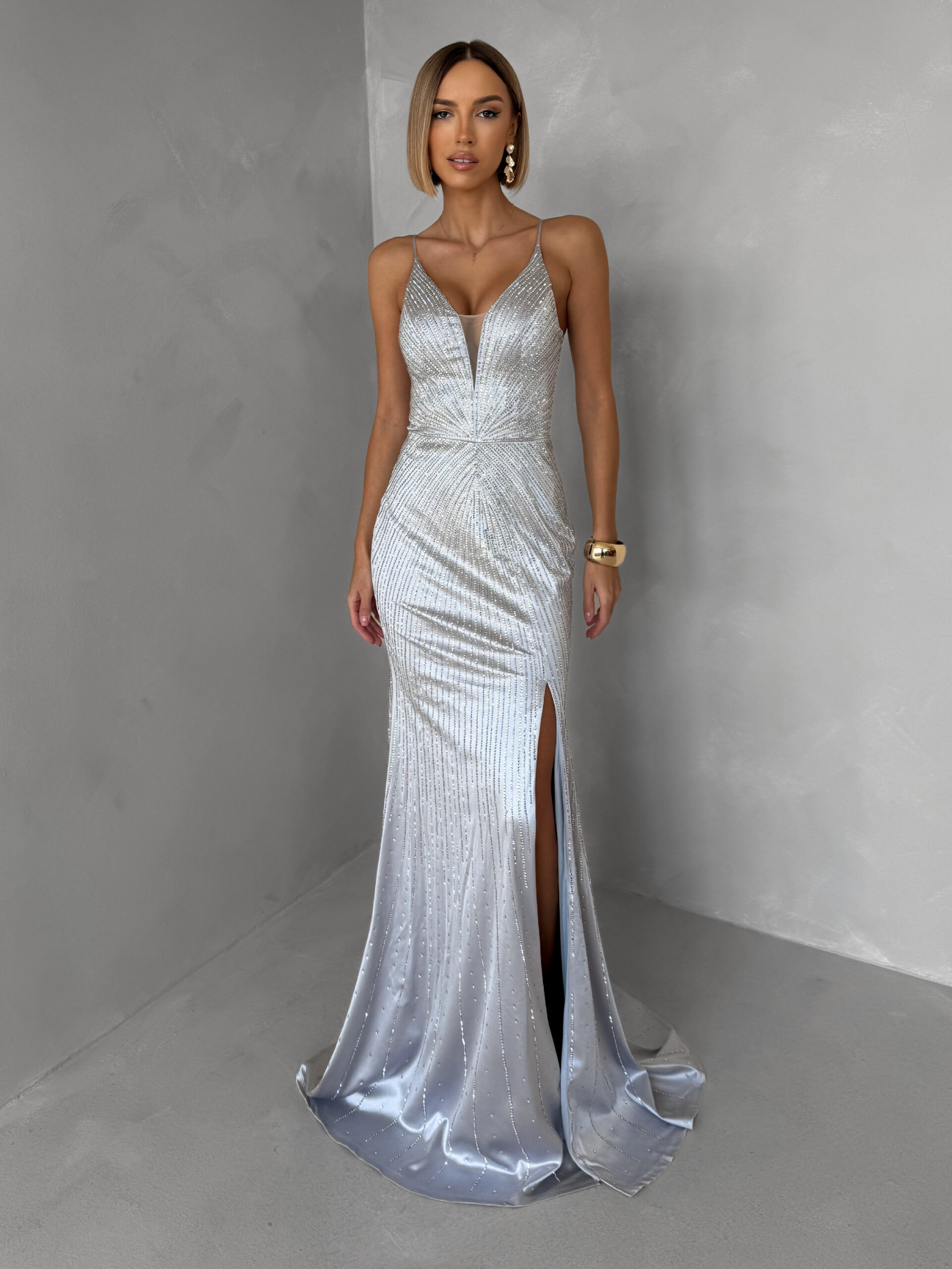 Stříbrné plesové třpytivé šaty RAVELLE s rozparkem Velikost: M