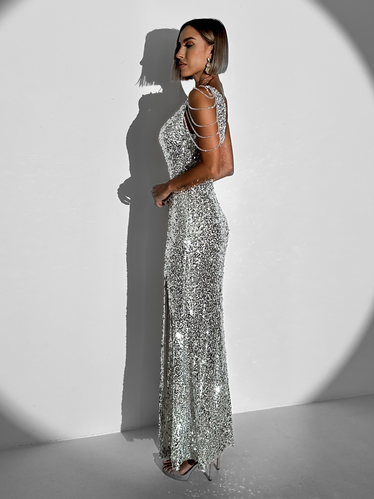 Stříbrné třpytivé dlouhé flitrované šaty MODEFLAH Velikost: S