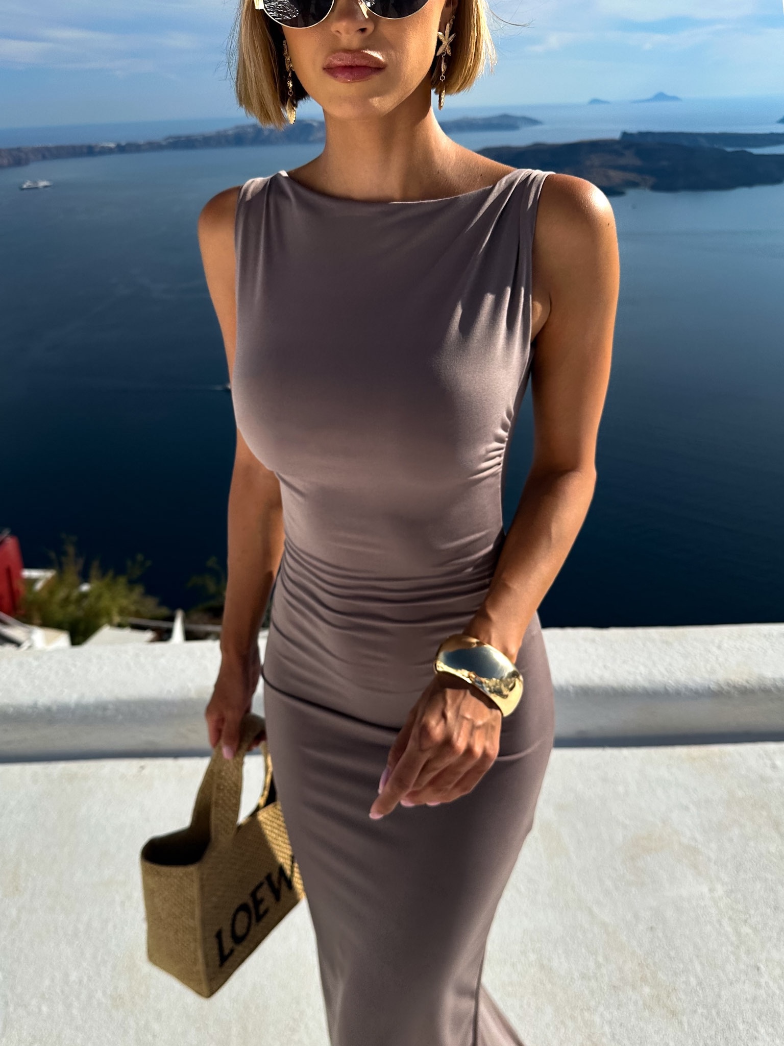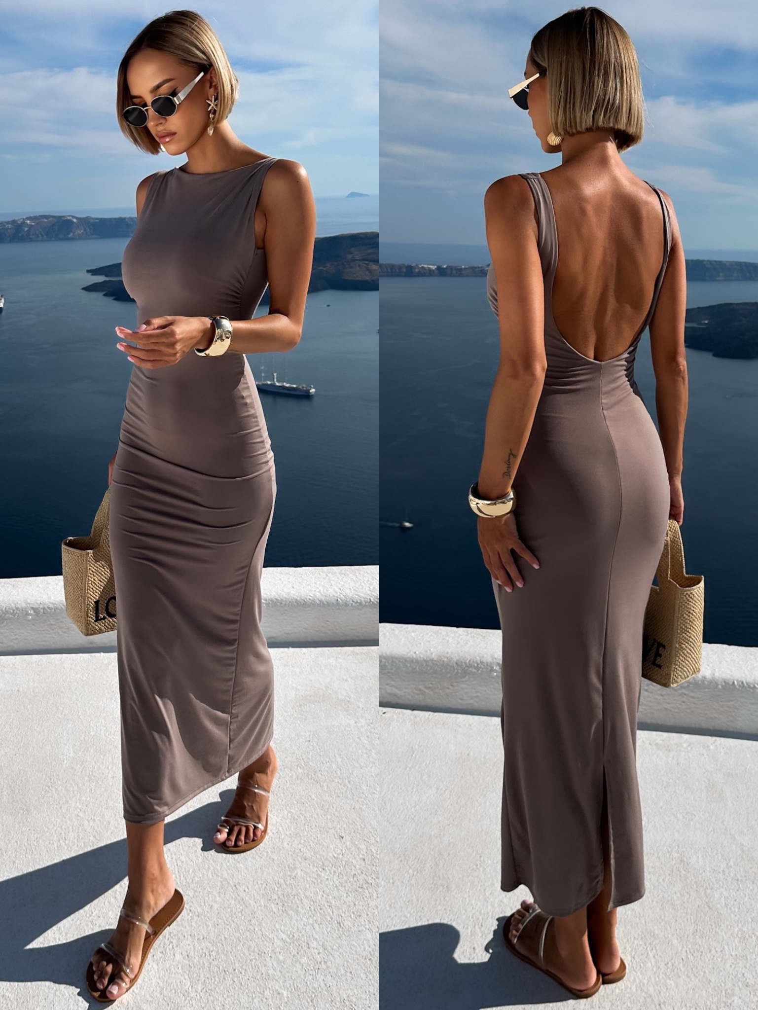 Tmavě béžové dlouhé elastické šaty KEENAN s holými zády Velikost: ONESIZE