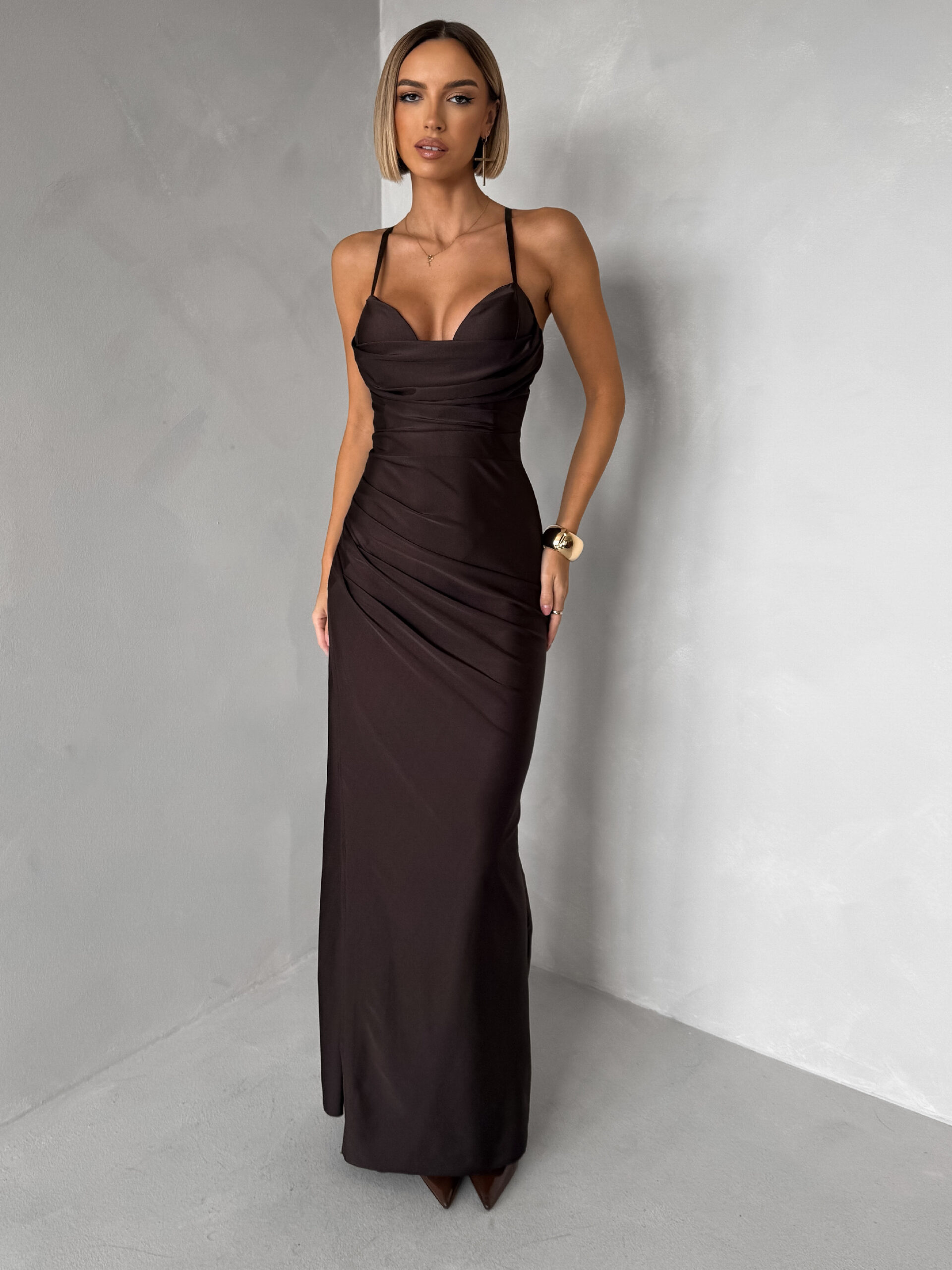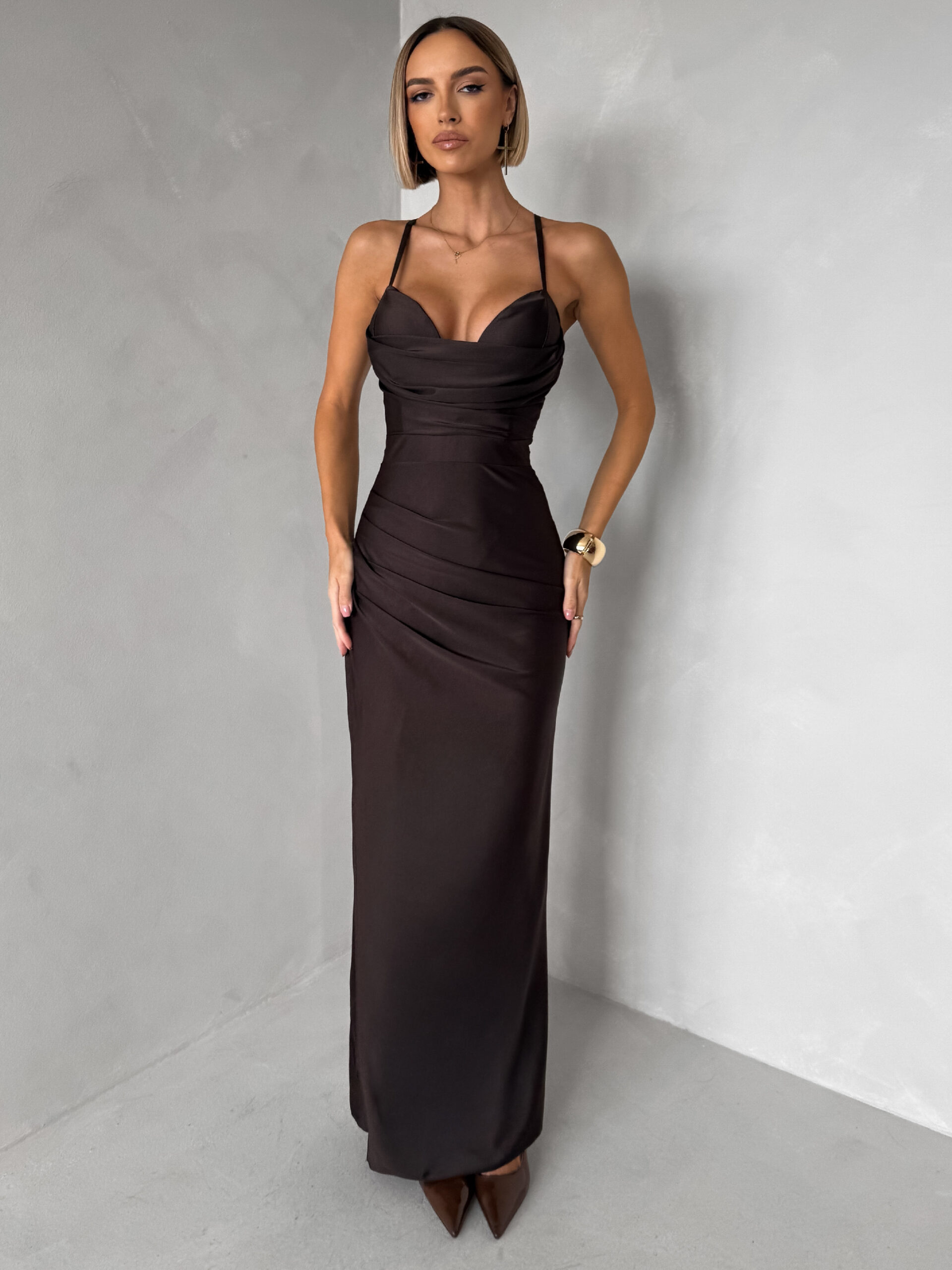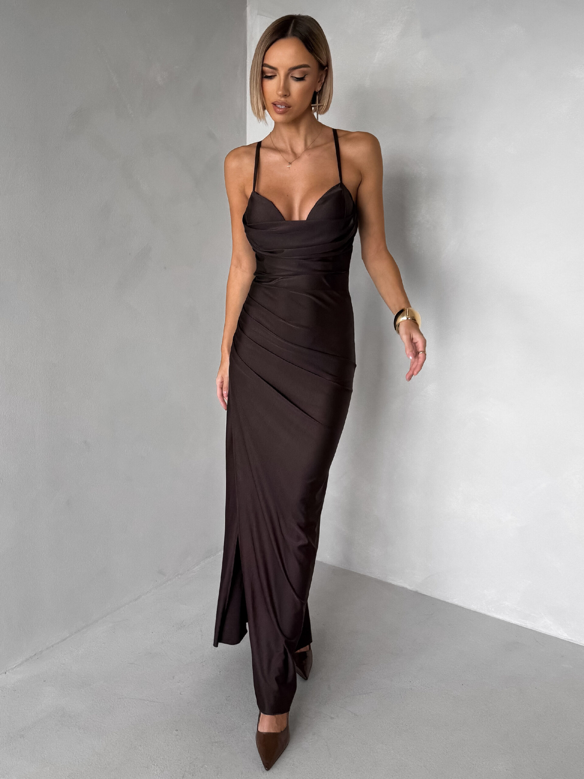 Tmavě hnědé dlouhé saténové šaty ORIXY s výstřihem Velikost: ONESIZE